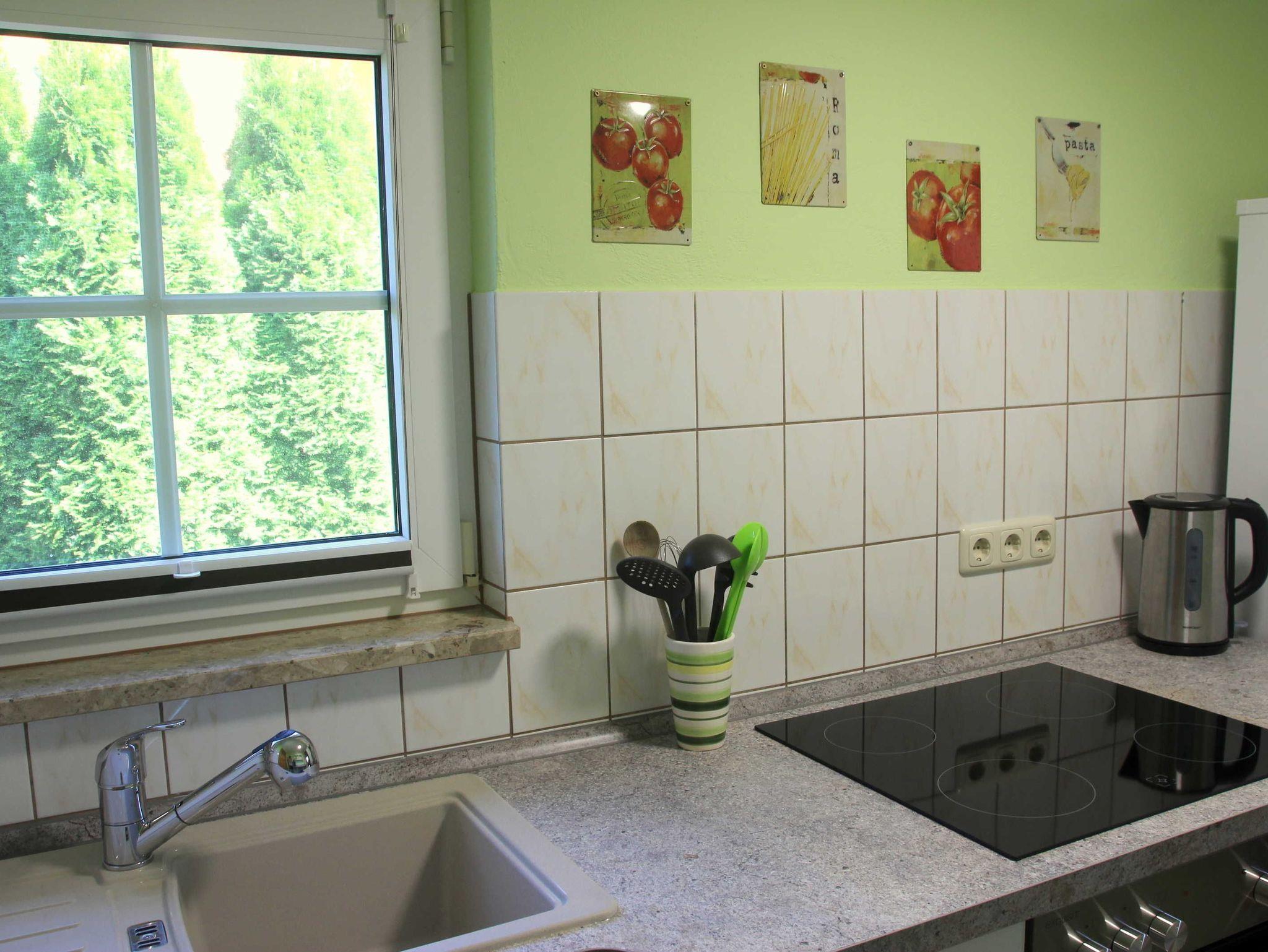 Die Küche bietet einen Kühlschrank mit Gefriermöglichkeit, einen Backofen, einen Geschirrspüler, eine Mikrowelle sowie Kaffeemaschine und Wasserkocher.