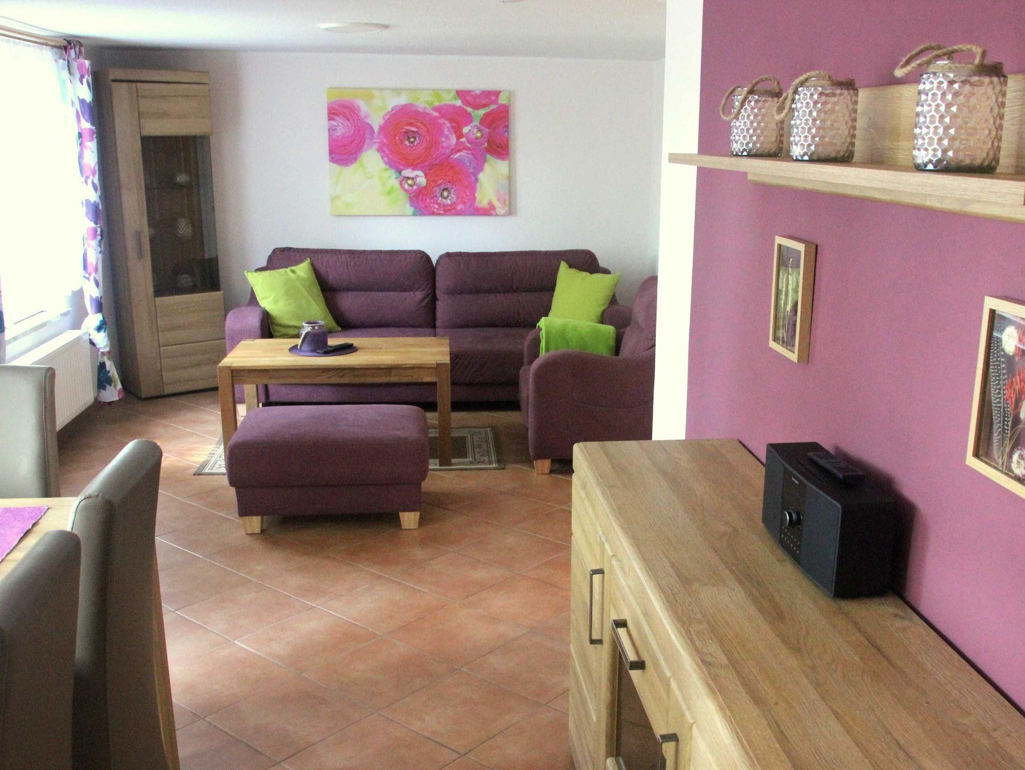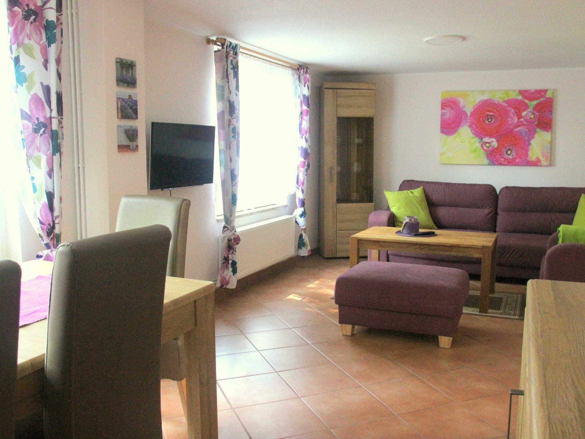 Das Wohnzimmer ist mit einer Couch und einem Essbereich für 4 Personen ausgestattet.