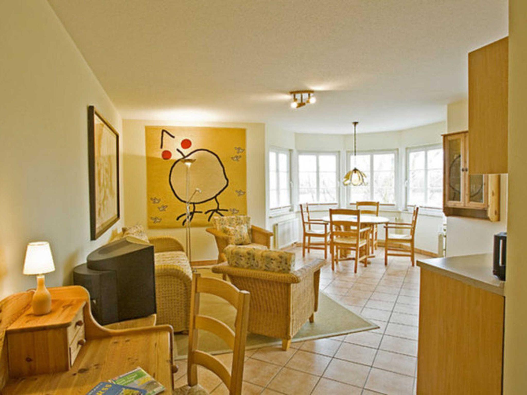 Die Wohnung Max für 4 Personen im Erdgeschoss ist geprägt von dem runden Esstisch im Erkerturm. Die Morgen- und Abendsonne geben diesem Wohnzimmer mit TV und Radio/CD-Spieler und der Küchenzeile den besonderen Reiz. Eines der zwei Schlafzimmer (je 2 Betten) hat einen kleinen Südbalkon mit Tisch und Stühlen auf der Seite des Hauseinganges. Das Bad hat ein kleines Fenster und ist mit einer Dusche ausgestattet.
