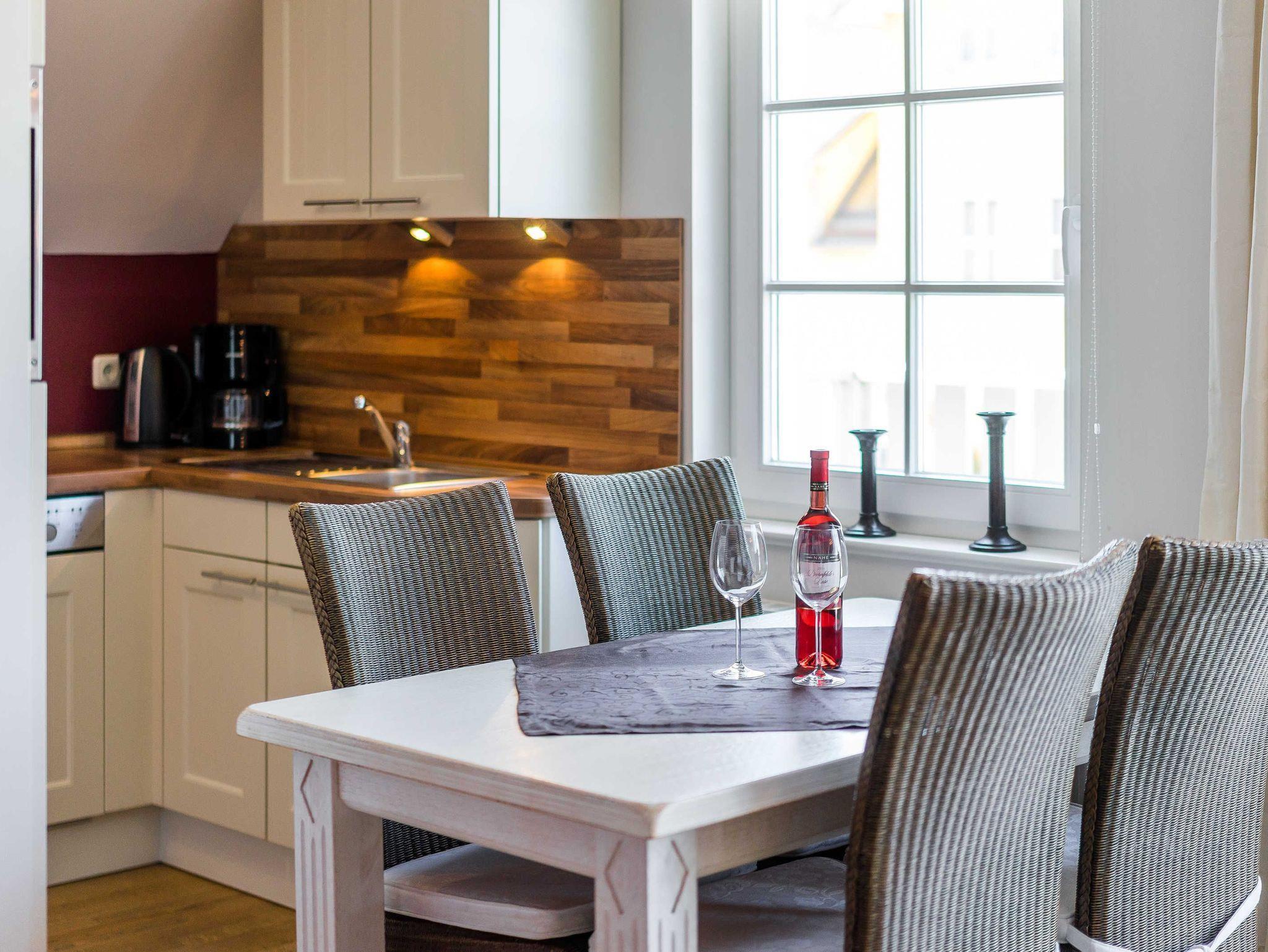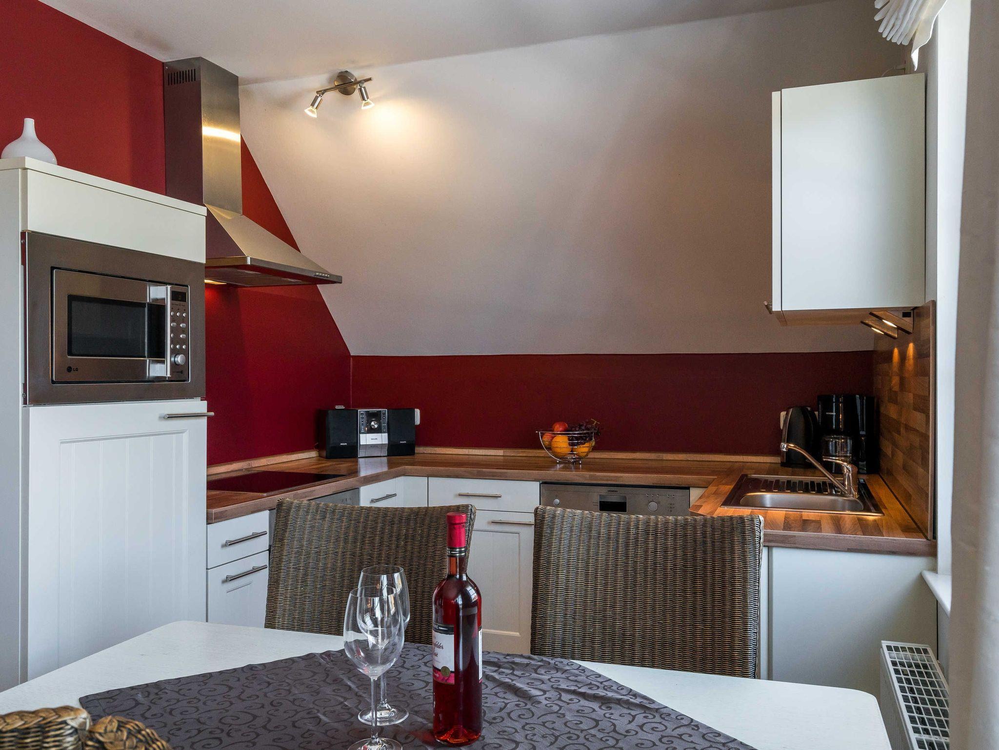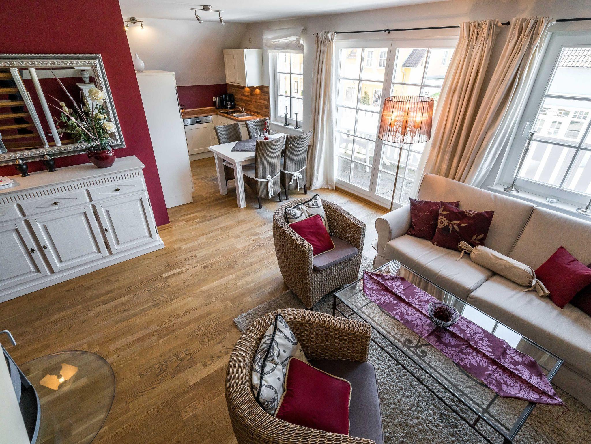 Einen Katzensprung entfernt zur Ostsee können Sie den Abend bei schönem Sonnenuntergang und einem Glas Wein auf dem Balkon (zur Straßenseite) ausklingen lassen. Das gesamte Ambiente der Wohnung ist hell und freundlich und wurde hochwertig und geschmackvoll eingerichtet. Die Küchenzeile ist mit einem Geschirrspüler, Mikrowelle sowie einem Herd mit Backofen ausgestattet. Die Wohnung verfügt eine TV-Sat-Anlage. Außerdem können Sie wohlige Gemütlichkeit am Kaminofen im Wohnbereich genießen. 2 - 4 Personen finden in dieser Wohnung statt. Es gibt zwei Schlafzimmer mit Doppelbett und zwei Bäder. Im Obergeschoss befindet sich ein Schlafzimmer mit Doppelbett sowie einem Badezimmer mit Dusche / WC. Im Dachgeschoss befindet sich das zweite Schlafzimmer mit Doppelbett sowie einem Badezimmer mit Badewanne / WC.