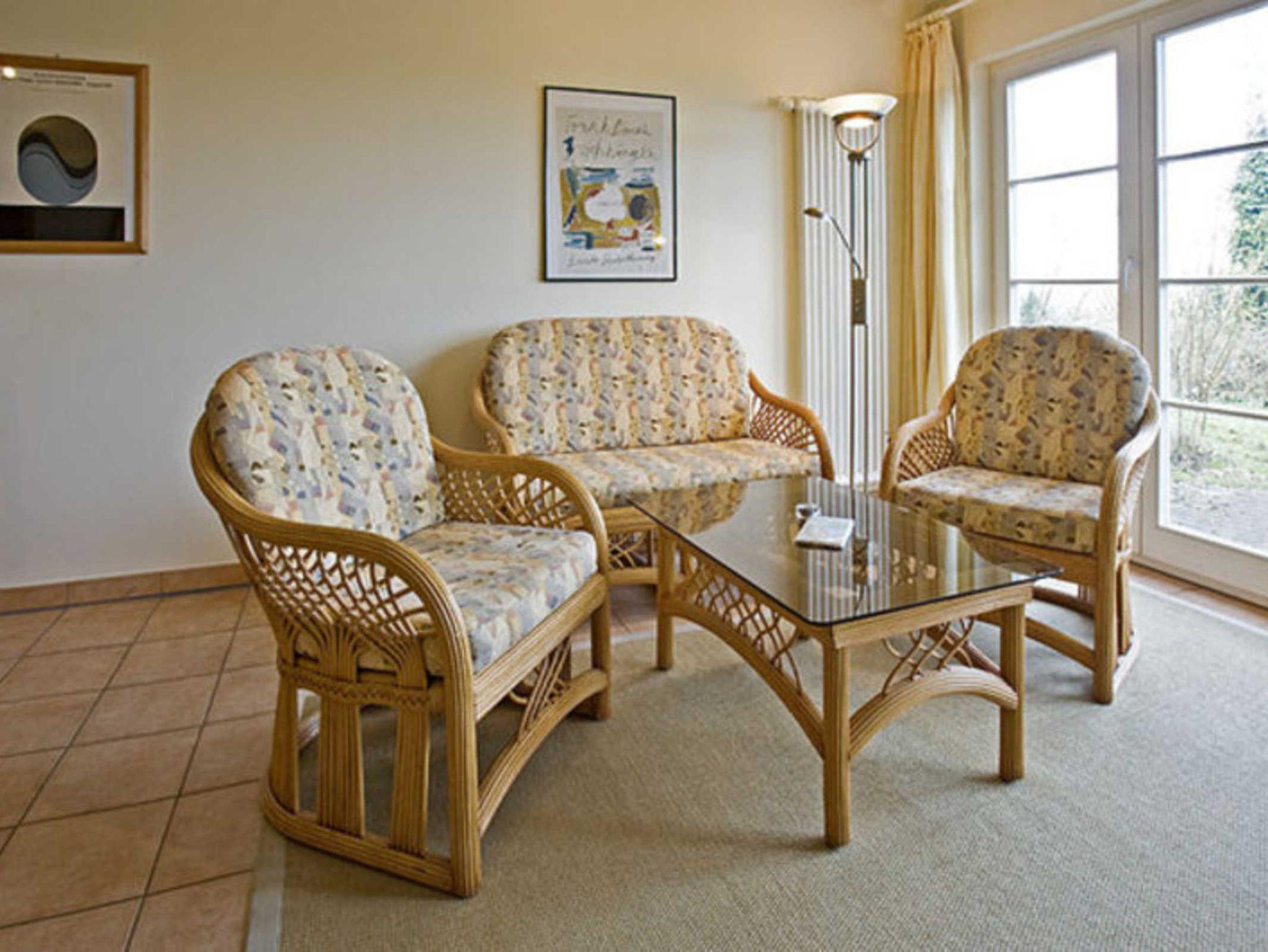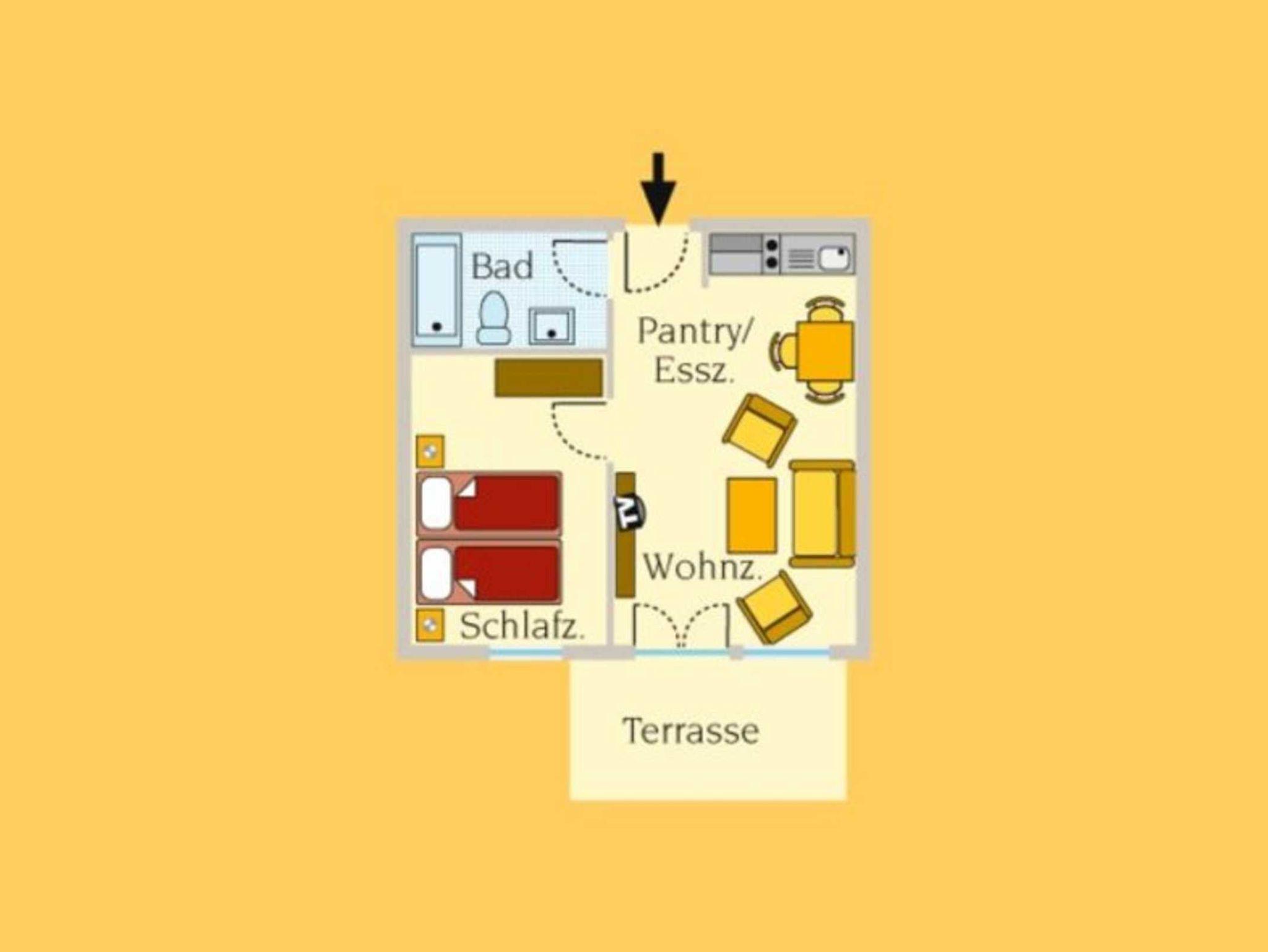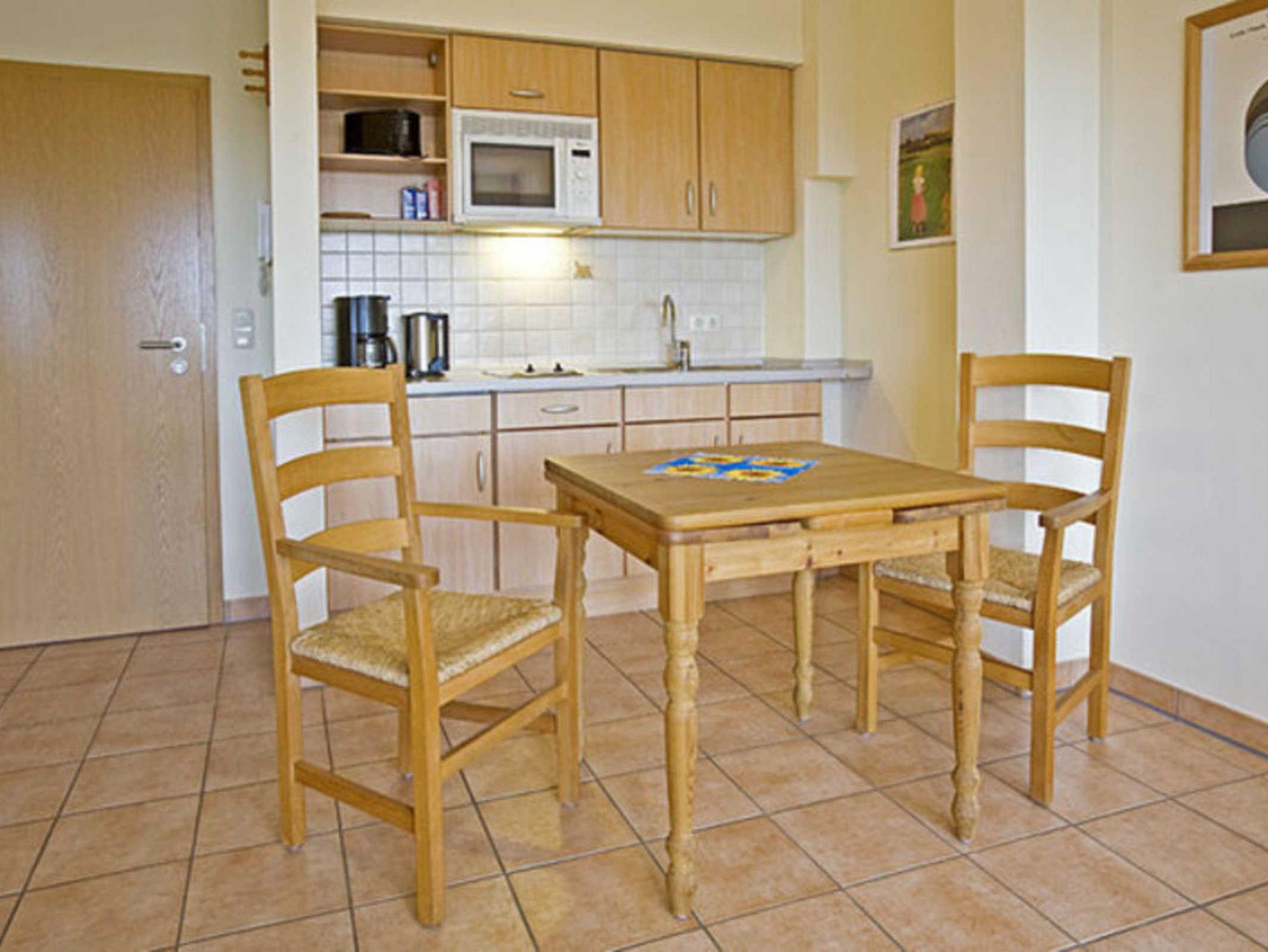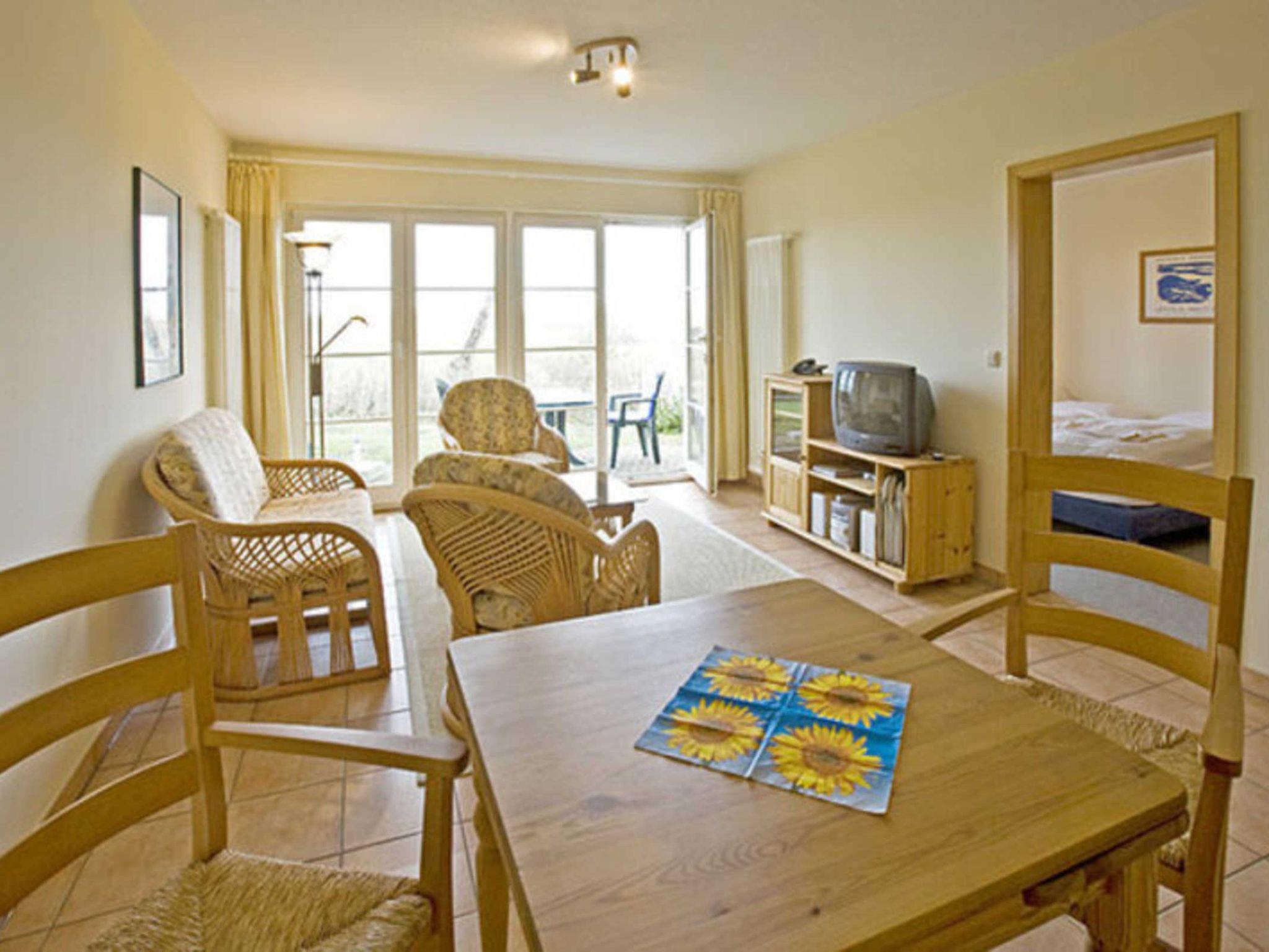 Die Wohnung Luise für 2 Personen im Erdgeschoß in der Mitte des Hauses ist mit einer großen West-Terrasse mit Tisch, Stühlen und Sonnenschirm ausgestattet. Eine große Fensterfront mit Terrassentür bestimmt das großzügige Wohnzimmer mit einer Küchenzeile und Esstisch. Daneben befinden sich das Schlafzimmer mit 2 Betten und das innenliegende Bad mit Badewanne.