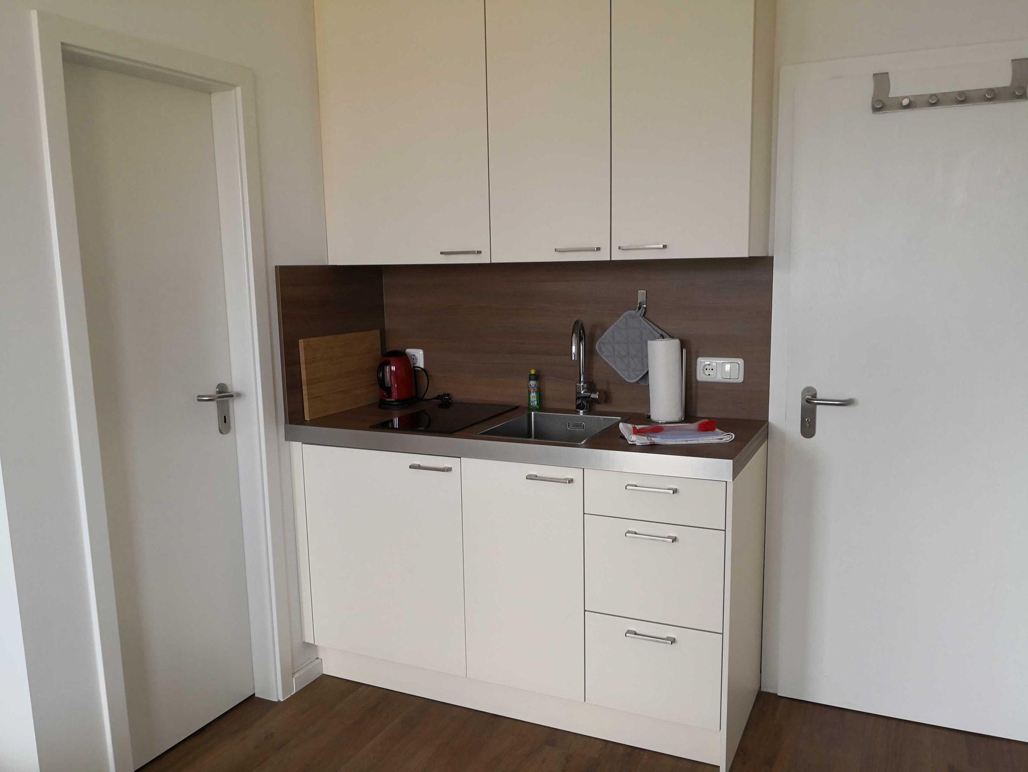 Im Zimmer finden Sie ein komfortables Doppelbett (180x200 cm) sowie eine gemütliche Sitzecke mit einem Tisch und zwei Stühlen. Die Küchenzeile ist mit einem Toaster, einer Kaffeemaschine und einem Wasserkocher ausgestattet. Ihr Kühlschrank verfügt über ein praktisches Eisfach, und ein Zwei-Platten-Herd steht ebenfalls zur Verfügung. Das Badezimmer bietet eine Dusche und ein WC.