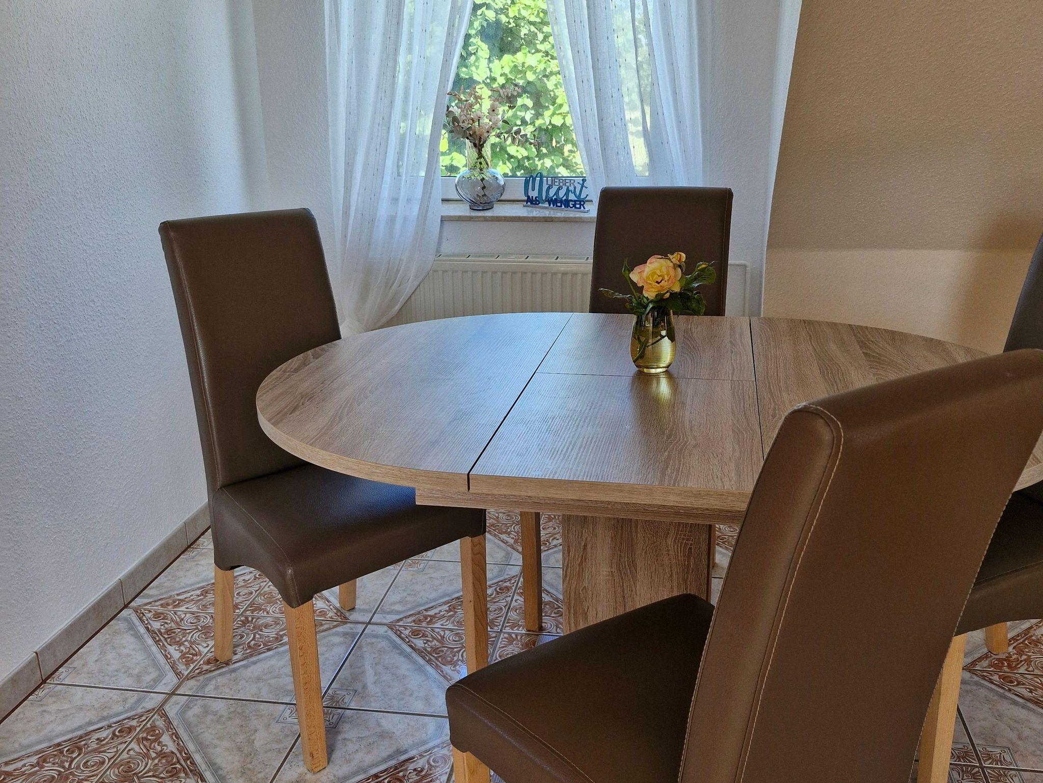 Die Küche ist Ihr Reich für kulinarische Entdeckungen - mit einem Kühlschrank, Cerankochfeld, Backofen und weiteren Annehmlichkeiten wie einer Kaffeemaschine, einem Wasserkocher und einem Toaster. Der Esstisch mit Platz für vier Personen lädt zu gemeinsamen Mahlzeiten und geselligen Runden ein.