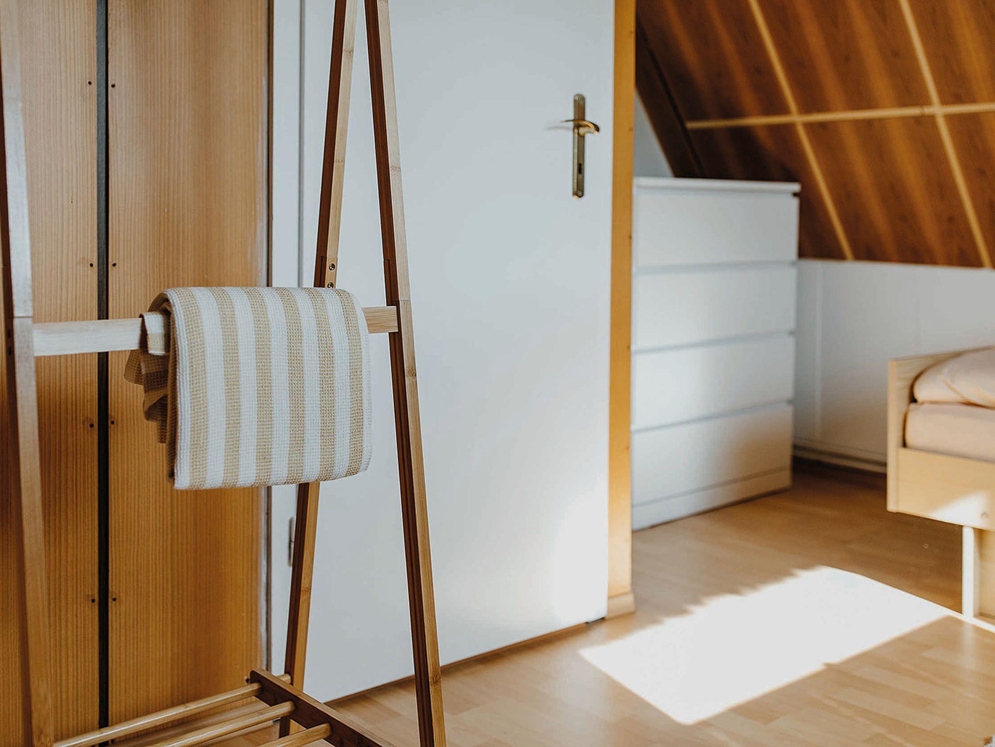 Im Obergeschoss befinden sich das Elternschlafzimmer mit einem Doppelbett (getrennte Matratzen) sowie ein weiteres Schlafzimmer mit zwei Einzelbetten.