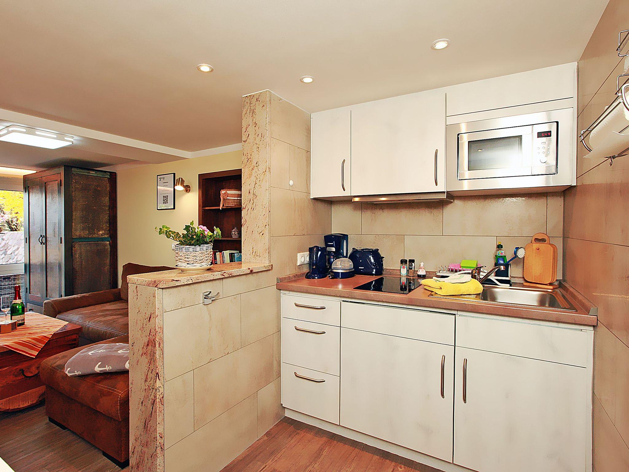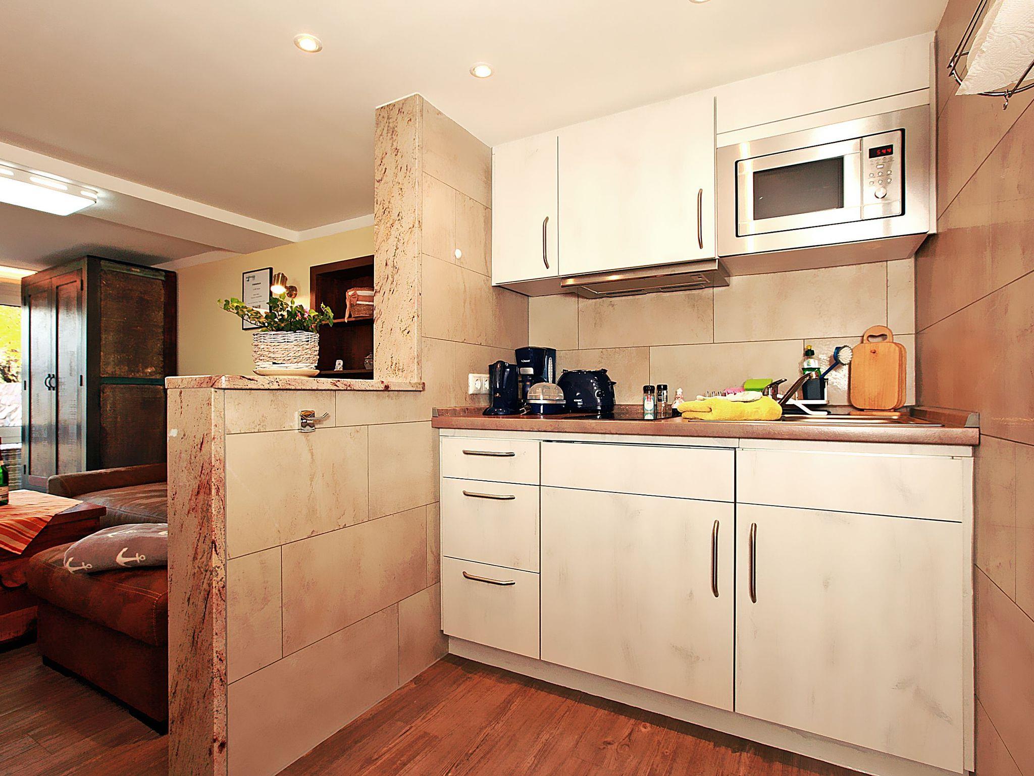 In der Küche stehen für Sie ein 2- Platten- Kochfeld, Wasserkocher, Mikrowelle, Eierkocher, Toaster, Kaffeemaschine und Kühlschrank zur Nutzung bereit.