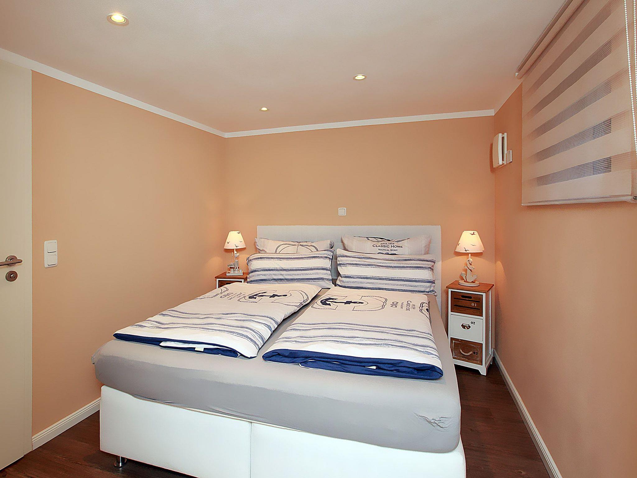 Im liebevoll eingetrichterten Schlafzimmer befindet sich ein Doppelbett 1,60 x 2,00 m. Die Bettwäsche ist inklusive und die Handtücher können Sie gegen eine Gebühr von 8,00 € pro Set dazu buchen.