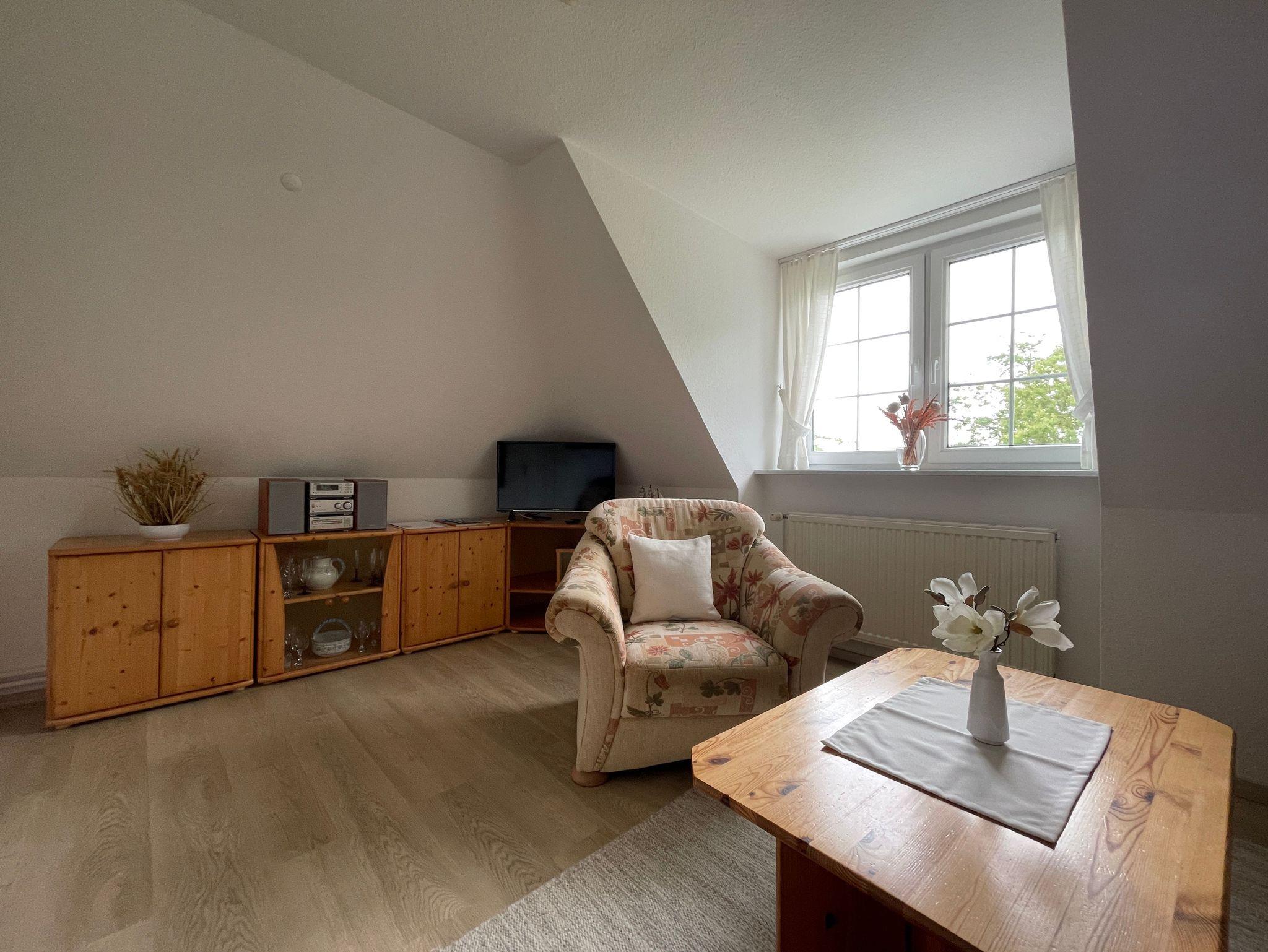 Kleine Ferienwohnung im Obergeschoss in einem schönen Reetdachhaus. Sie wohnen zentral und strandnah, aber trotzdem ruhig. Die Wohnung verfügt über ein gemütliches Wohnzimmer mit Couch und Sessel sowie einem Fernseher. Im separaten Schlafzimmer finden Sie ein Doppelbett sowie einen Essplatz. Das Tageslichtbad ist mit einer Dusche ausgestattet. Die Küche befindet sich im Eingangsbereich der Wohnung und ist ausgestattet mit einem Zwei-Platten-Cerankochfeld, einem Kühlschrank (mit Eisfach) sowie Wasserkocher, Toaster und Kaffeemaschine. Das Tageslichtbad verfügt über eine Dusche / WC. Zur Wohnung gehört ein großer Garten, der gemeinschaftlich mit anderen Gästen genutzt werden kann. Ein Parkplatz ist ebenfalls vorhanden. Der Eingang zur Wohnung führt über eine Treppe. Die Bettwäsche ist im Preis inklusive. Handtücher müssen mitgebracht werden oder können kostenpflichtig dazu gebucht werden.