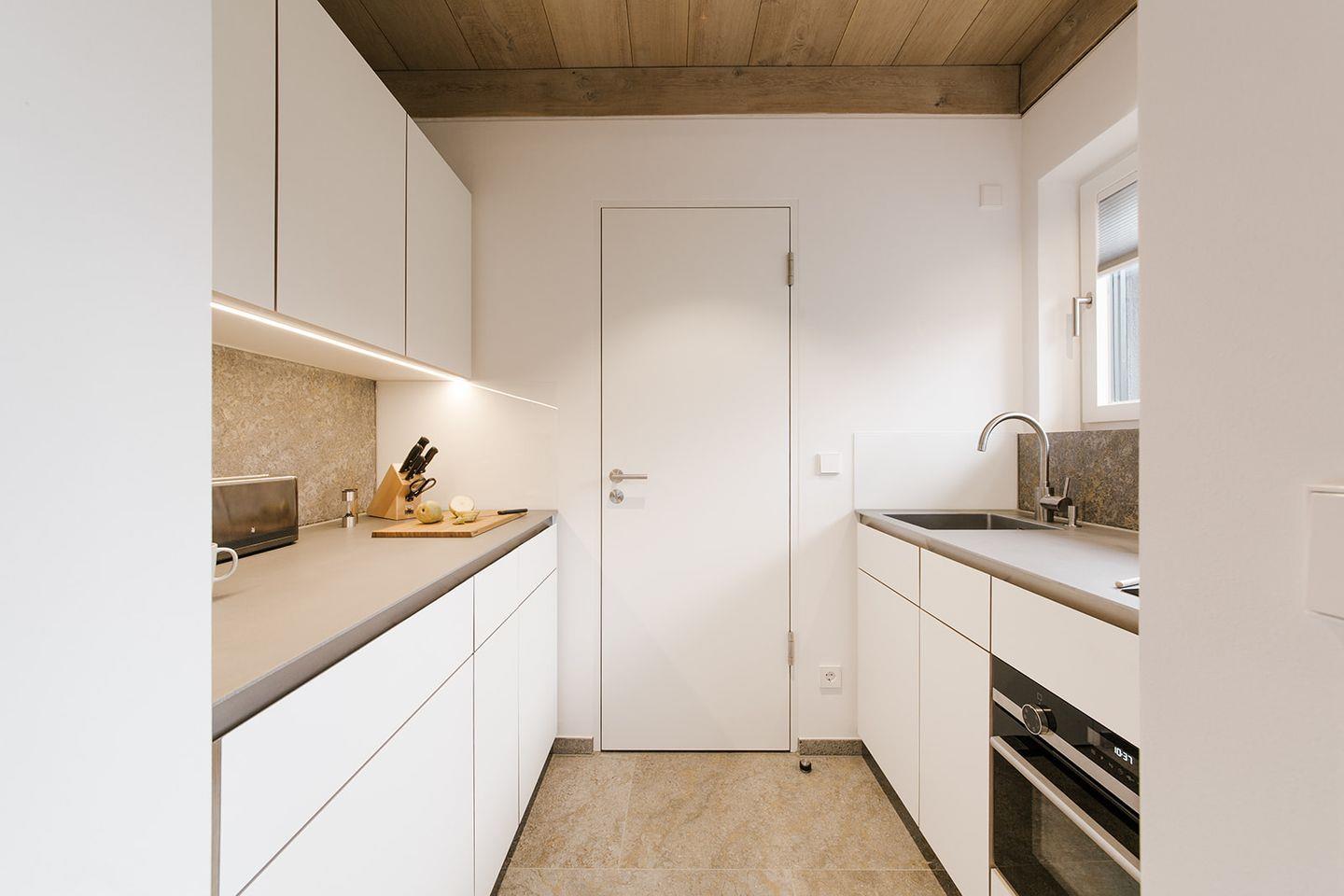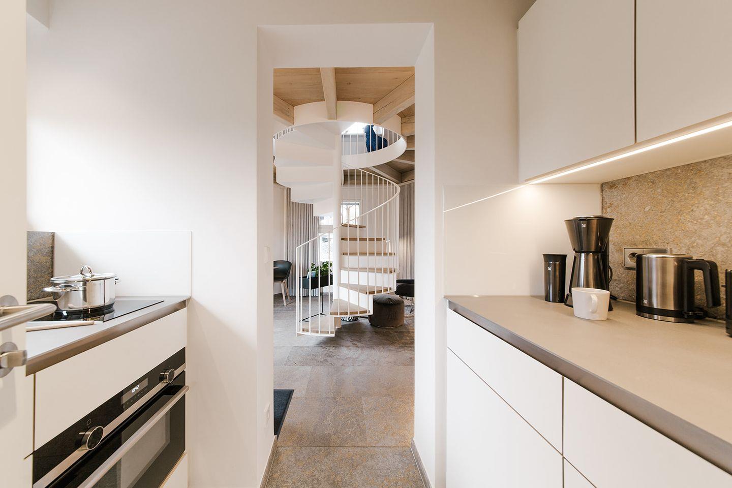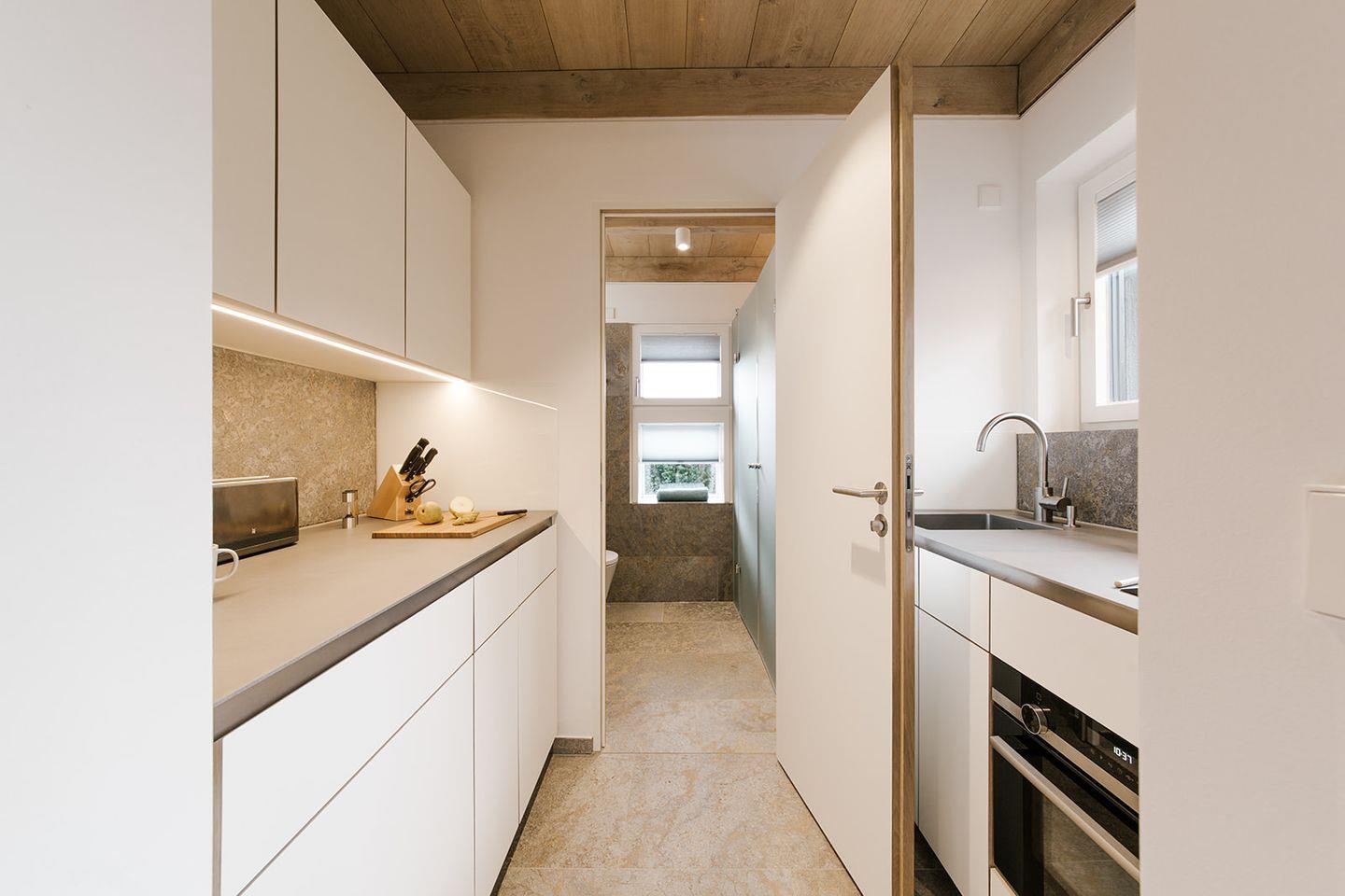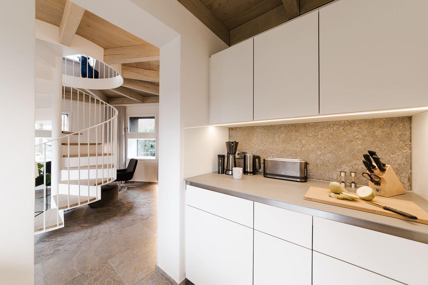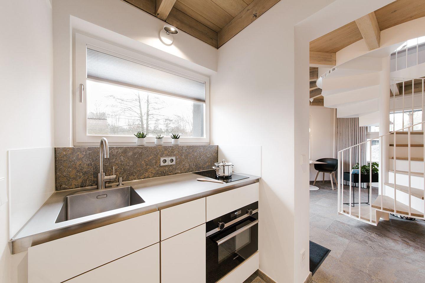 Umfangreich ausgestattet und geschmackvoll eingerichtet präsentiert sich die Küche der Ferienwohnung an der Ostsee für zwei Personen.