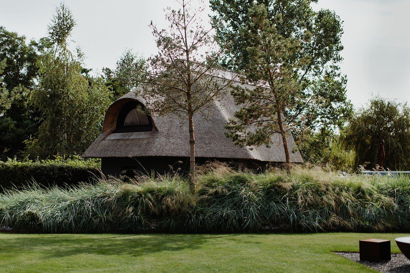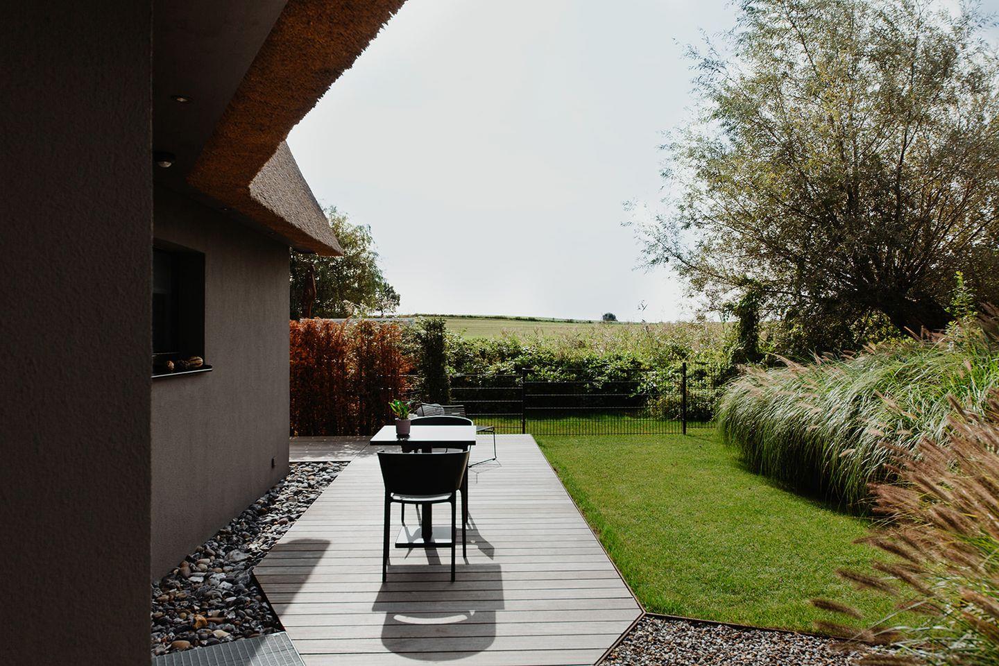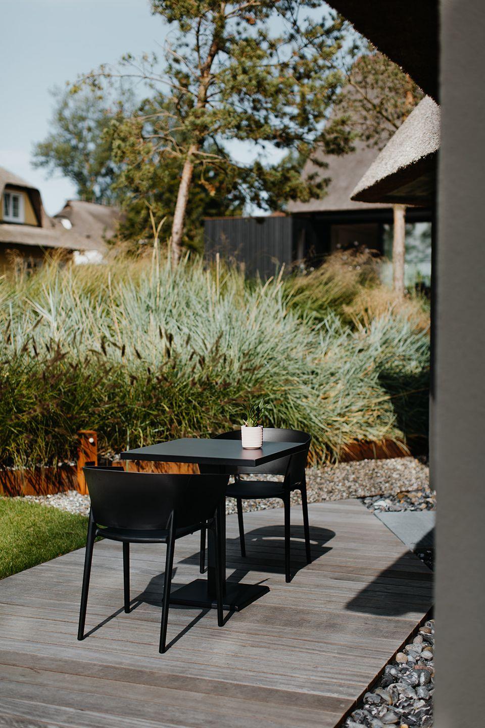 Licht zu jeder Tageszeit genießen die Gäste auf der großzügigen Terrasse, die nach Süden und Westen ausgerichtet ist und sich gekonnt in die parkähnliche Anlage des Anwesens einfügt.