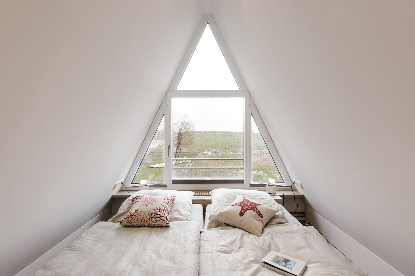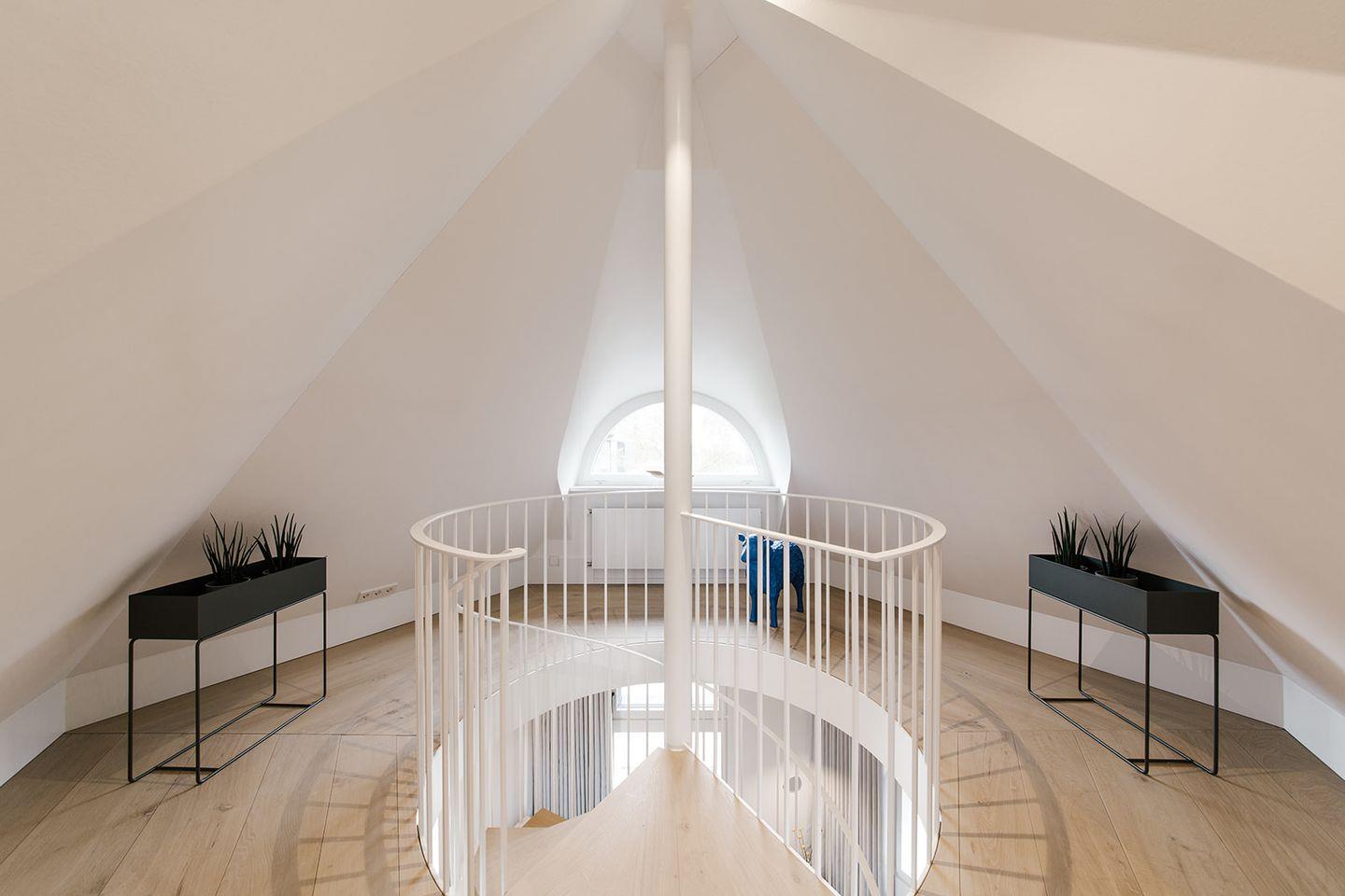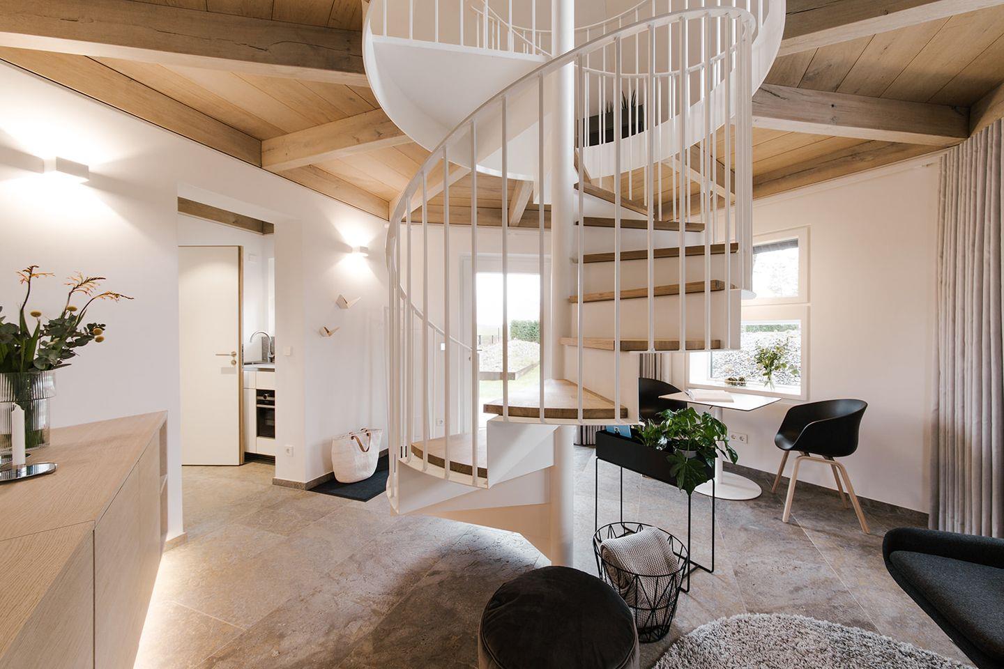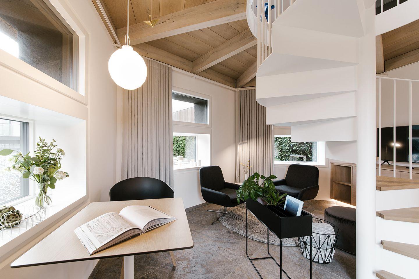 Über eine den Raum prägende Wendeltreppe gelangt man in den Schlafbereich im Obergeschoss, der den freien Blick auf Felder und Wiesen des Künstlerdorfes Ahrenshoop eröffnet. Mit wenig Aufwand kann das Doppelbett in zwei Einzelbetten verwandelt werden.