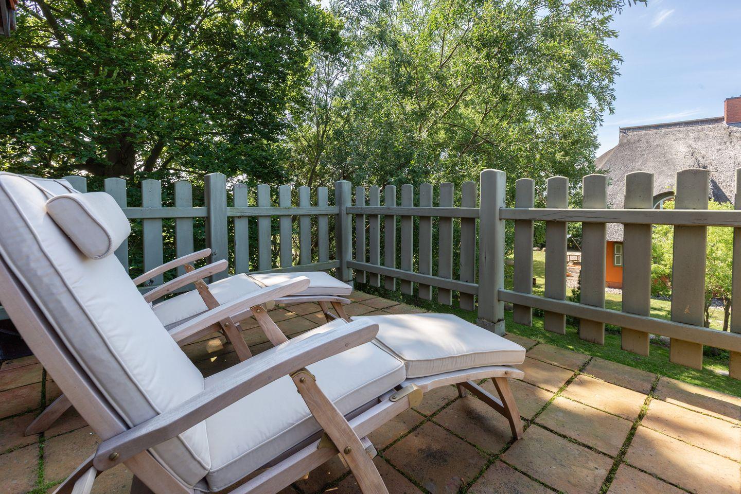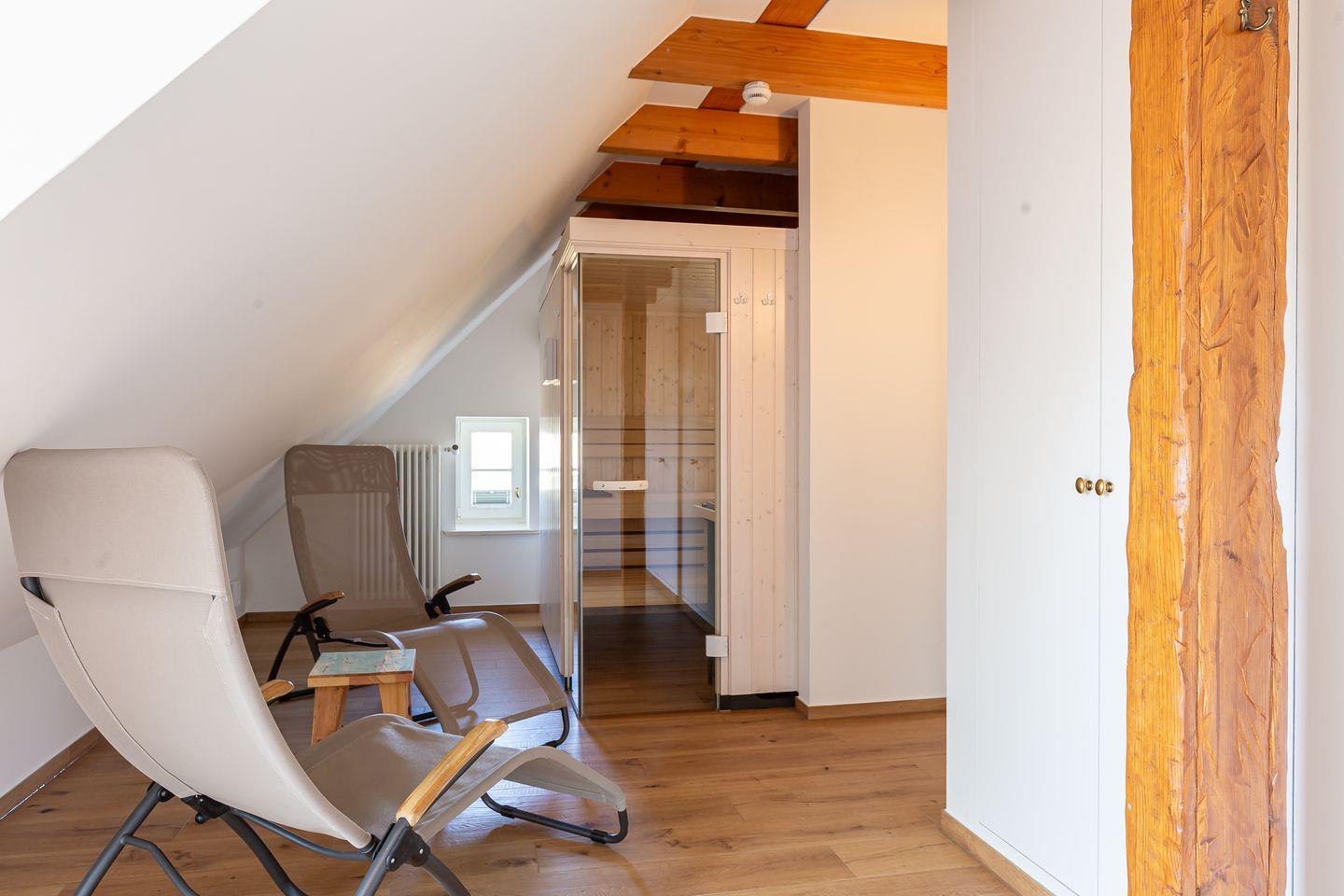 Im Erdgeschoss erwarten einen zwei gemütliche Schlafzimmer, ein großzügiger Küchen- und Essbereich mit viel Platz für gemeinsame Stunden sowie eine separate Wohnzimmerecke mit Kamin und TV – perfekt für entspannte Abende. Das Badezimmer auf dieser Ebene bietet sowohl Dusche als auch Badewanne. Über eine Treppe gelangt man ins Obergeschoss mit einem dritten, großzügigen Schlafzimmer, einem weiteren Badezimmer und einer hauseigenen Sauna. Ein Highlight zum Abschalten nach einem Strandtag. Vom Balkon aus genießt man einen wunderbaren Blick ins Grüne und die Umgebung. Auch der Außenbereich des Kapitänshauses lädt zum Verweilen ein: Auf der geschützten Terrasse lässt sich die Sonne genießen, im Garten auf einer Bank unter alten Bäumen entspannen oder den Tag bei einem Glas Wein ausklingen lassen. Das großzügige Grundstück bietet viel Platz im Grünen und an der frischen Luft. Ein charmantes Gartenhaus und ein hochwertiger Gasgrill stehen ebenfalls zur Verfügung. Da steht dem Grillabend im Sommer nichts im Wege. Es gehört ein PKW-Stellplatz zum Haus.