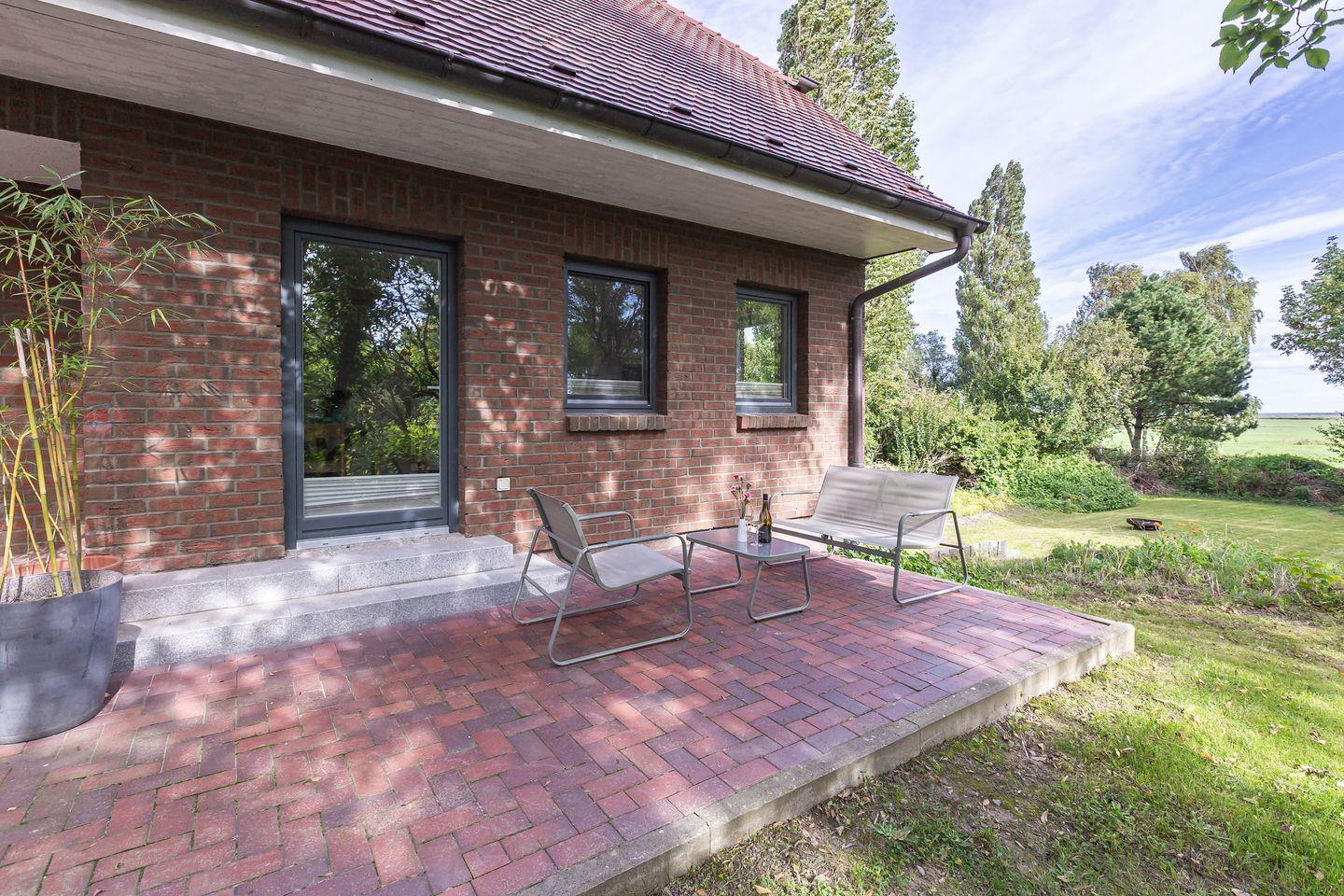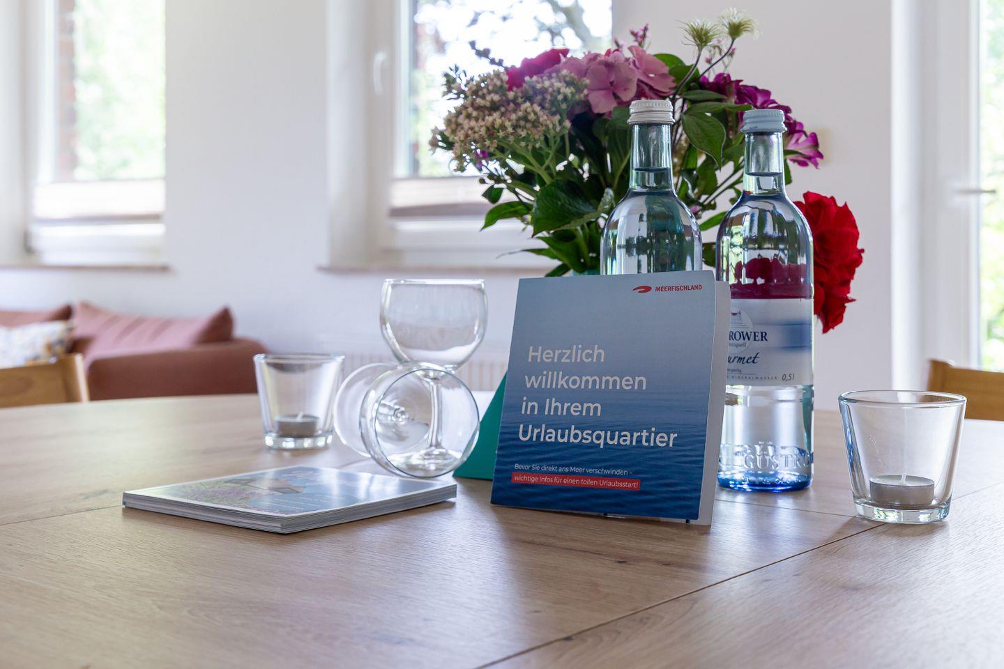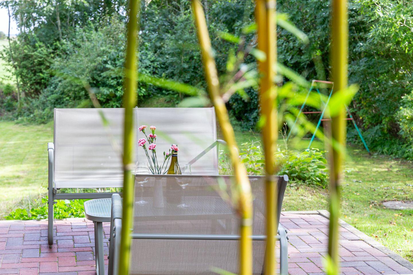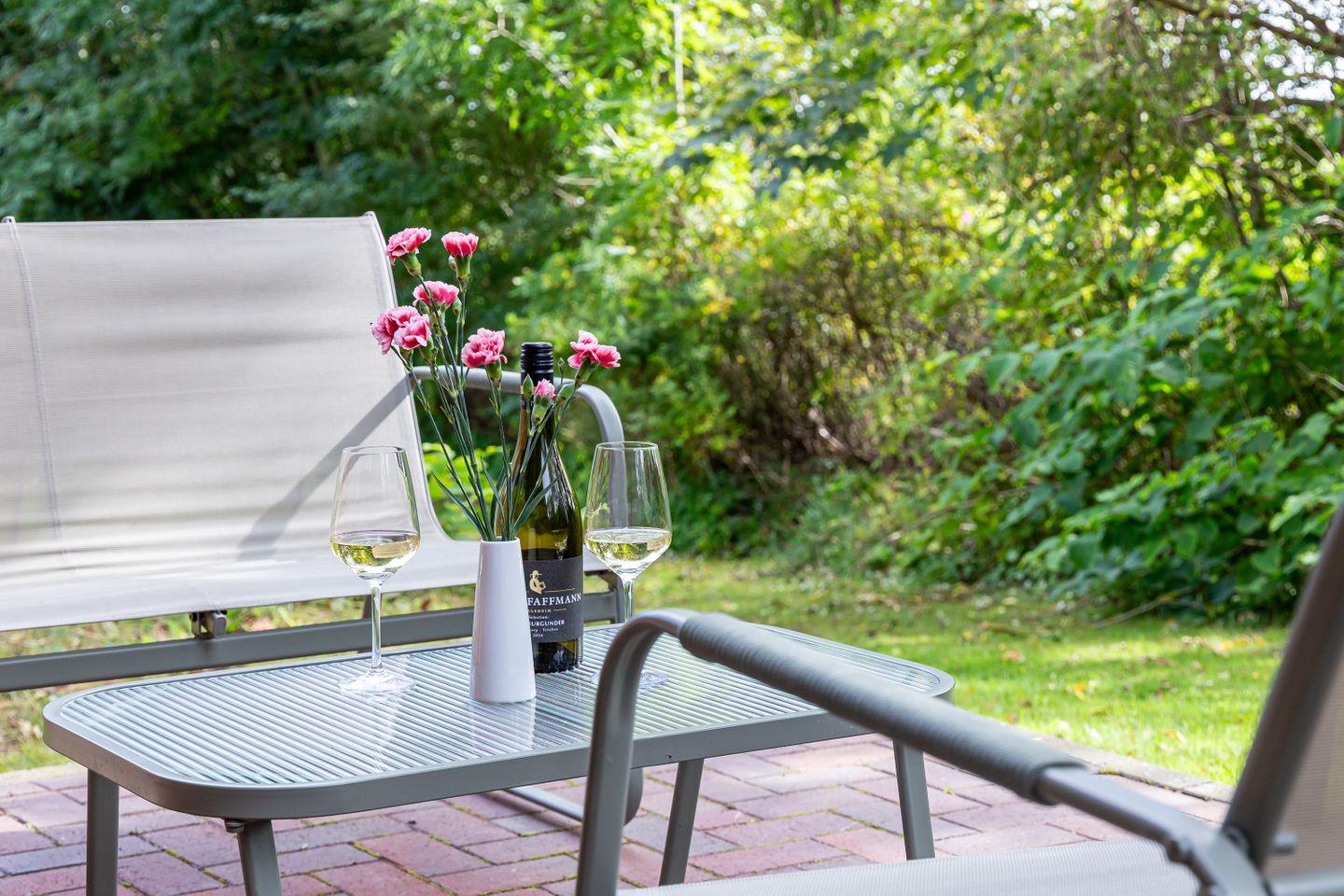 Die Sonne schickt ihre Strahlen großzügig durch die Fenster, während die Terrasse zum Frühstück im Freien lockt oder zum Füße hochlegen nach einem langen Spaziergang an der Steilküste. Zur Ferienwohnung gehören außerdem zwei Fahrradstellplätze und ein Pkw-Stellplatz.