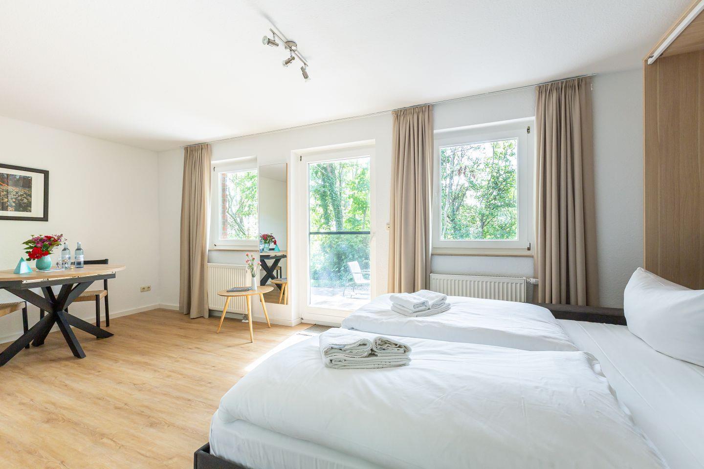 Auf 31 gut genutzten Quadratmetern bietet dieses charmante Einraum-Apartment alles, was du für eine entspannte Auszeit an der Ostsee brauchst. Mit seiner cleveren Raumaufteilung punktet die Wohnung vor allem bei Gästen, die es praktisch, hell und unkompliziert mögen. Das klappbare Bett verschwindet tagsüber ganz einfach in der Wand und macht Platz für ein kleines Sofa, auf dem man gemütlich lesen, einen Film schauen oder einfach die Ruhe genießen kann. Die Küchenzeile ist funktional und schick – perfekt für den schnellen Kaffee am Morgen oder das Abendessen nach einem Strandtag.
