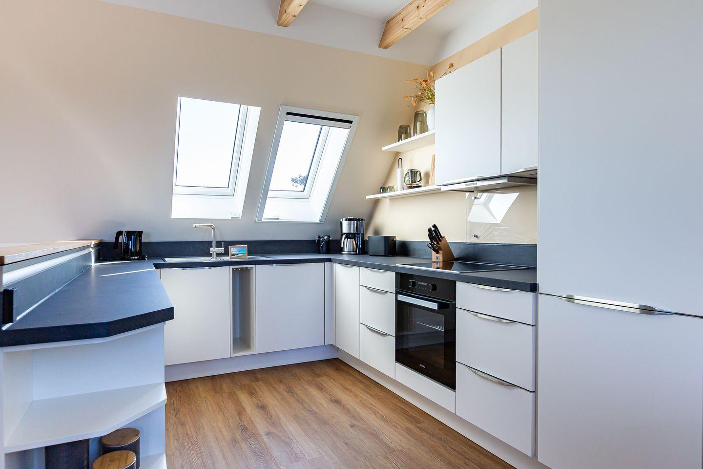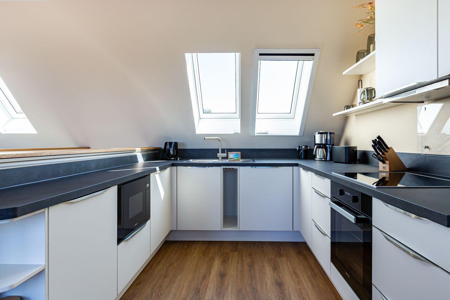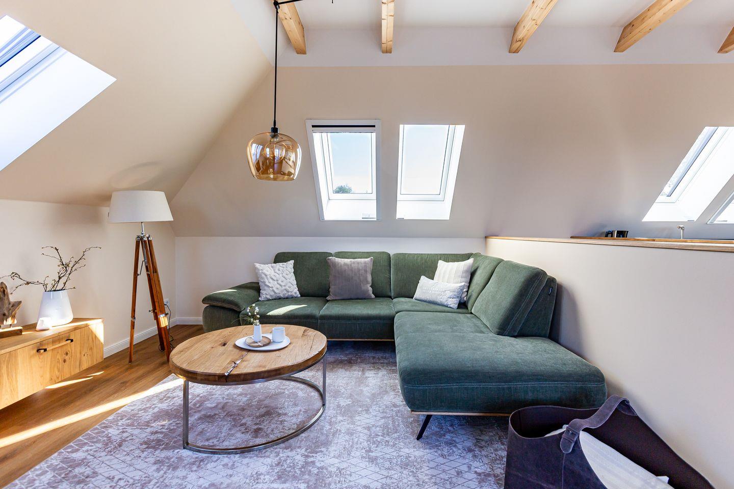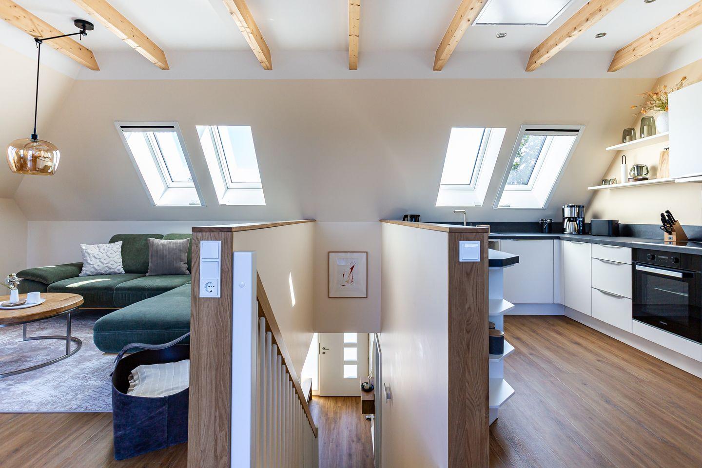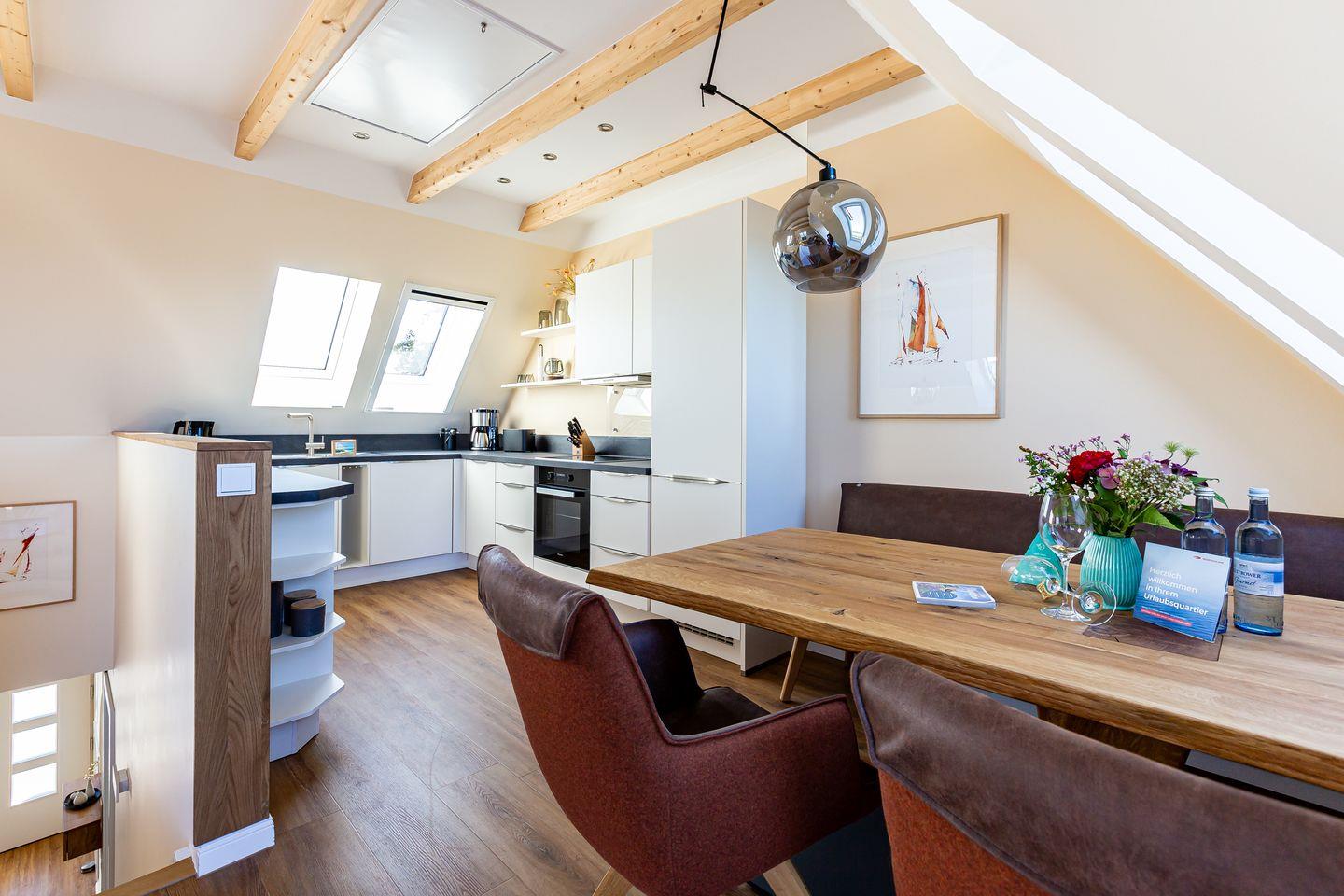 Willkommen in Deiner neuen Wohlfühloase mitten im Herzen von Ahrenshoop. Diese wunderschöne Ferienwohnung bietet Dir alles, was Du für einen entspannten und aktiven Urlaub an der Ostsee brauchst. Der offene Wohn- und Küchenbereich lädt zum gemeinsamen Kochen und Verweilen ein und öffnet sich direkt zum Balkon. Von hier kannst Du einen traumhaften Blick auf das Meer genießen. Zwei stilvolle Bäder sorgen für Komfort: Das Hauptbad mit eigener Sauna und ein Bad en suite – perfekt, um nach einem Tag an der frischen Luft zu entspannen.