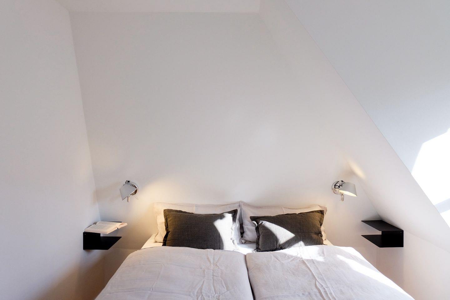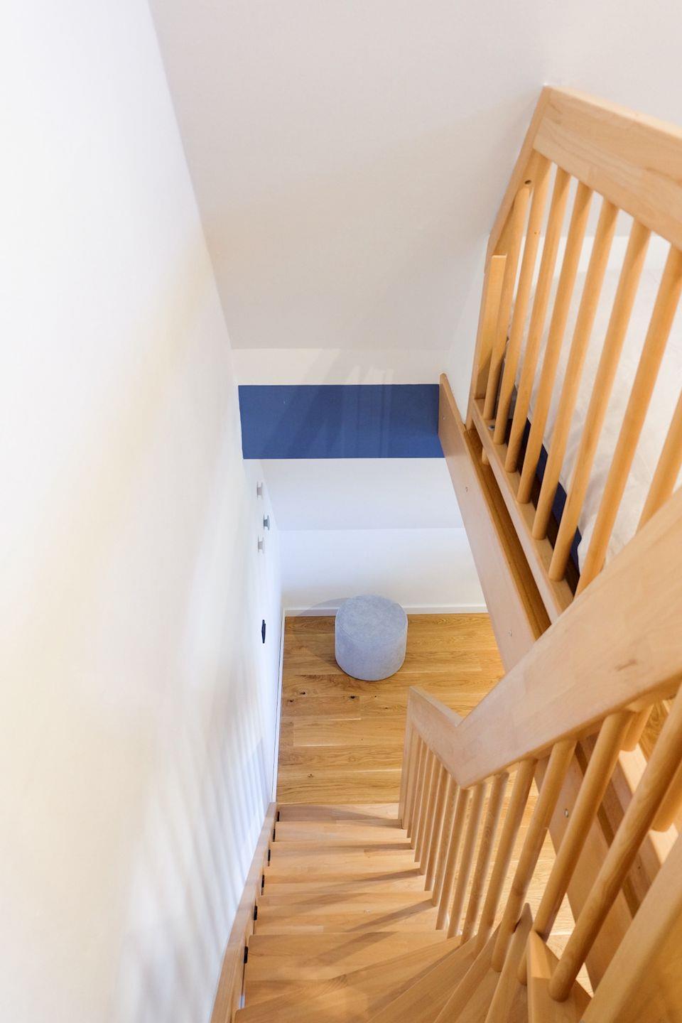 Von diesem Schlafzimmer führt eine weitere Holztreppe in den Spitzboden. Hier wartet ein kleines Highlight für jüngere Gäste: zwei Einzelbetten, ausschließlich für Kinder geeignet, die einen gemütlichen Rückzugsort zum Lesen, Spielen oder Träumen bieten. Der Spitzboden ist offen gestaltet und grenzt direkt an das Schlafzimmer an (ohne Tür) – deshalb verfügt die Wohnung insgesamt über zwei abgeschlossene Schlafzimmer.