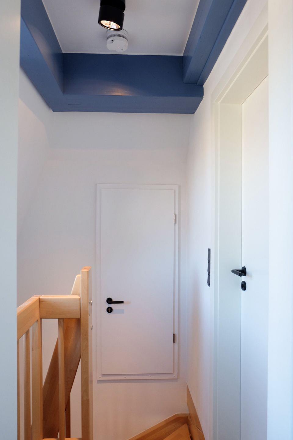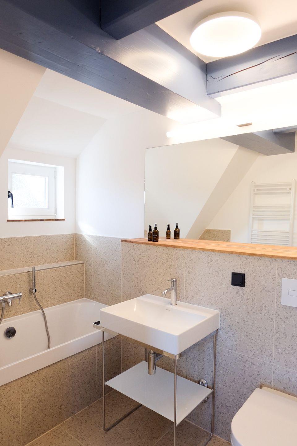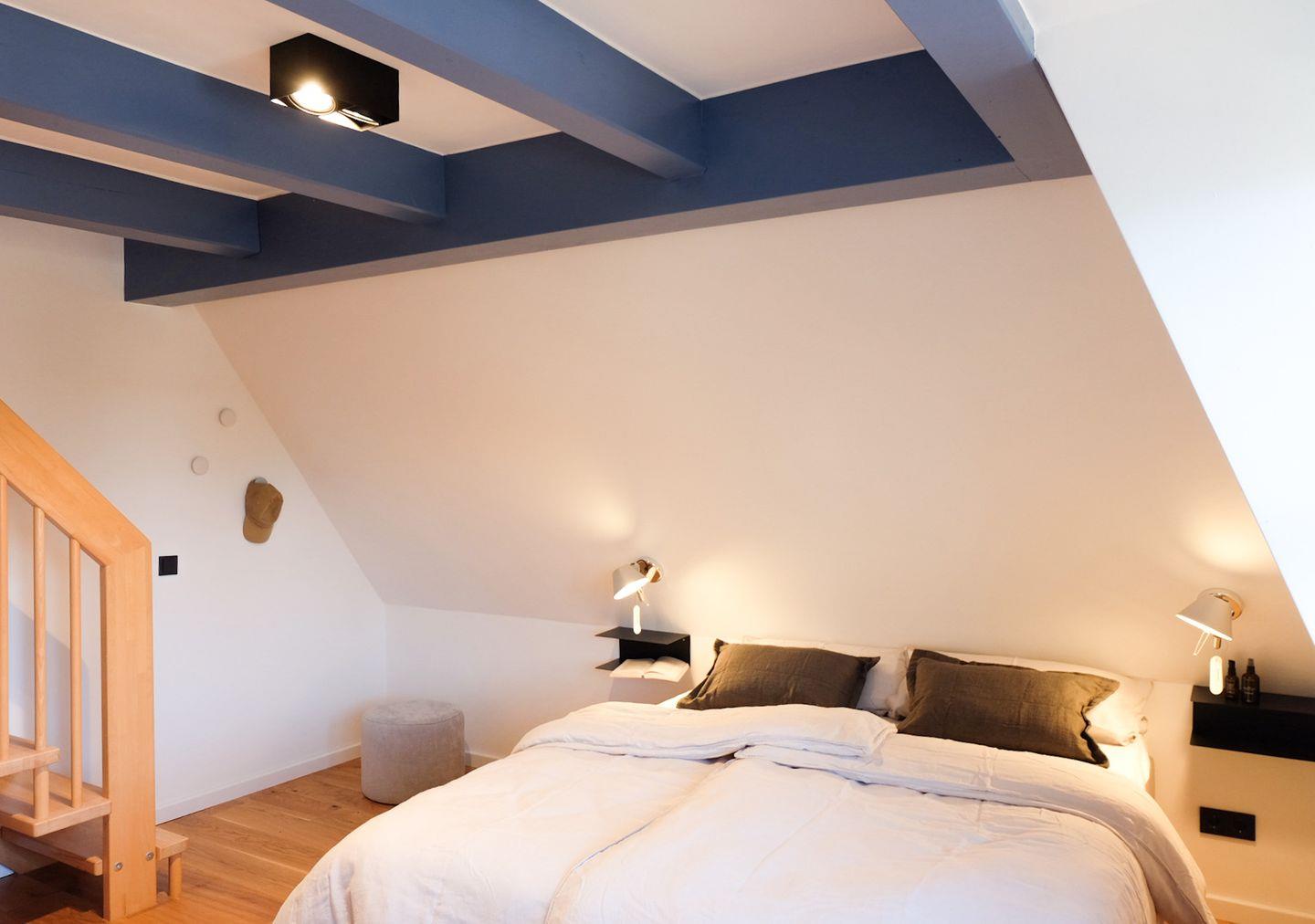 Über eine Holztreppe gelangt man ins Obergeschoss. Dort liegt ein weiteres Schlafzimmer mit Doppelbett sowie ein zweites Bad mit Badewanne – besonders angenehm, wenn mehrere Erwachsene oder eine Familie gemeinsam reisen.