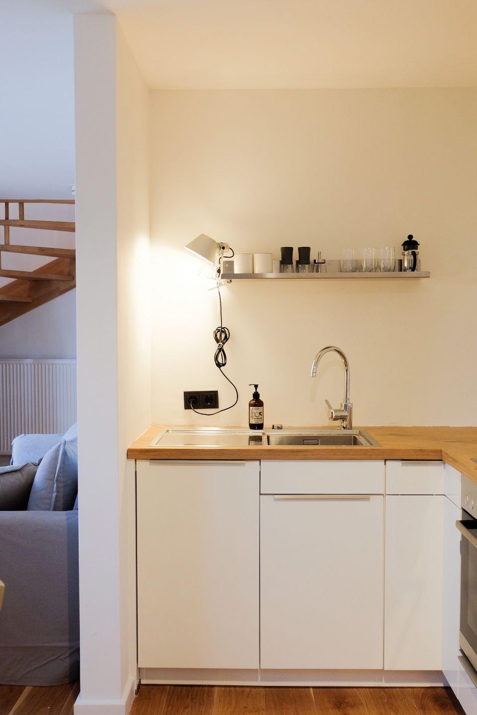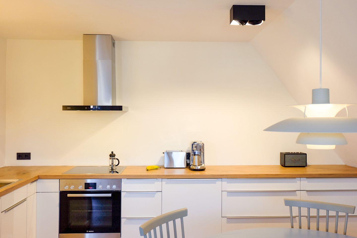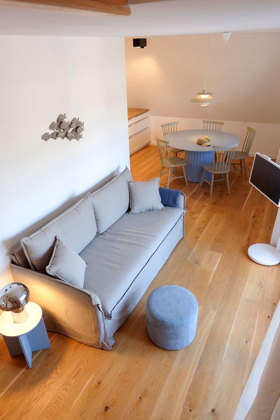 Im Untergeschoss befindet sich ein Schlafzimmer mit Doppelbett sowie ein modernes Bad mit Dusche. Der helle Wohn-, Koch- und Essbereich bildet das Herzstück der Wohnung. Hier wird gemeinsam gekocht, gespielt oder ein schöner Strandtag ganz entspannt ausklingen gelassen.