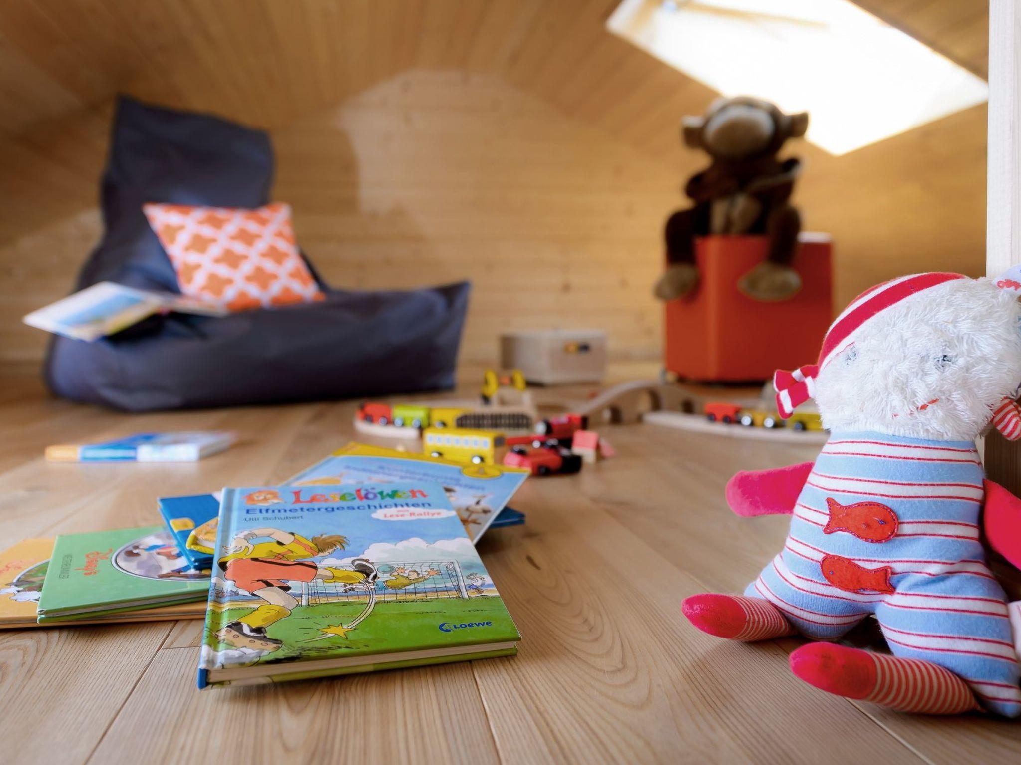 Der Außenbereich jedes Hauses ist geprägt von nischigen, überdachten Holzterrassen, die zum geselligen Beisammensein in langen Sommerabenden einladen. Für Kinder erfüllt ein abgesicherter Spielboden im Inneren des Hauses alle Träume. Zu jedem Ferienhaus gehört außerdem ein privater Pkw-Stellplatz sowie ein Grill, perfekt für gemütliche Abende. Das Gemeinschaftserlebnis wird durch eine großzügige Sauna abgerundet, die von allen Gästen der Ferienanlage genutzt werden kann. Hier können Sie sich für private Wellness-Zeiten eintragen und die kalte Jahreszeit in vollen Zügen genießen.