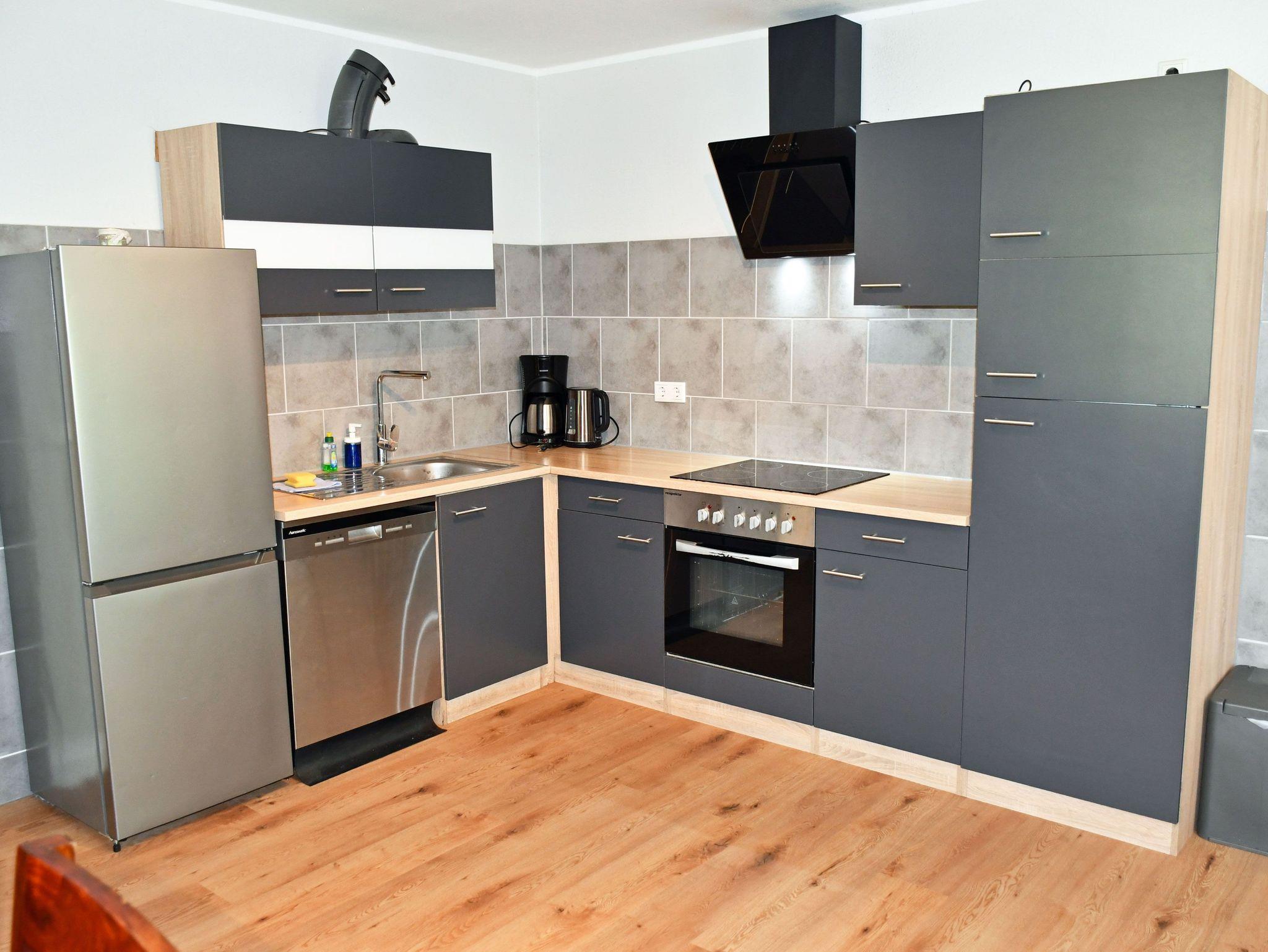 Die Küchenausstattung beinhaltet u.a.: Mikrowelle, einen großen Herd, Kaffeemaschine, Wasserkocher. Kostenfrei können ein Raclette, ein Waffeleisen und einen Pürierstab ausgeliehen werden.