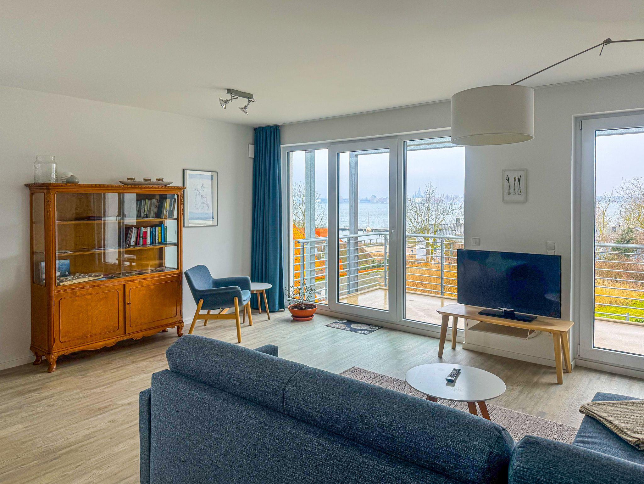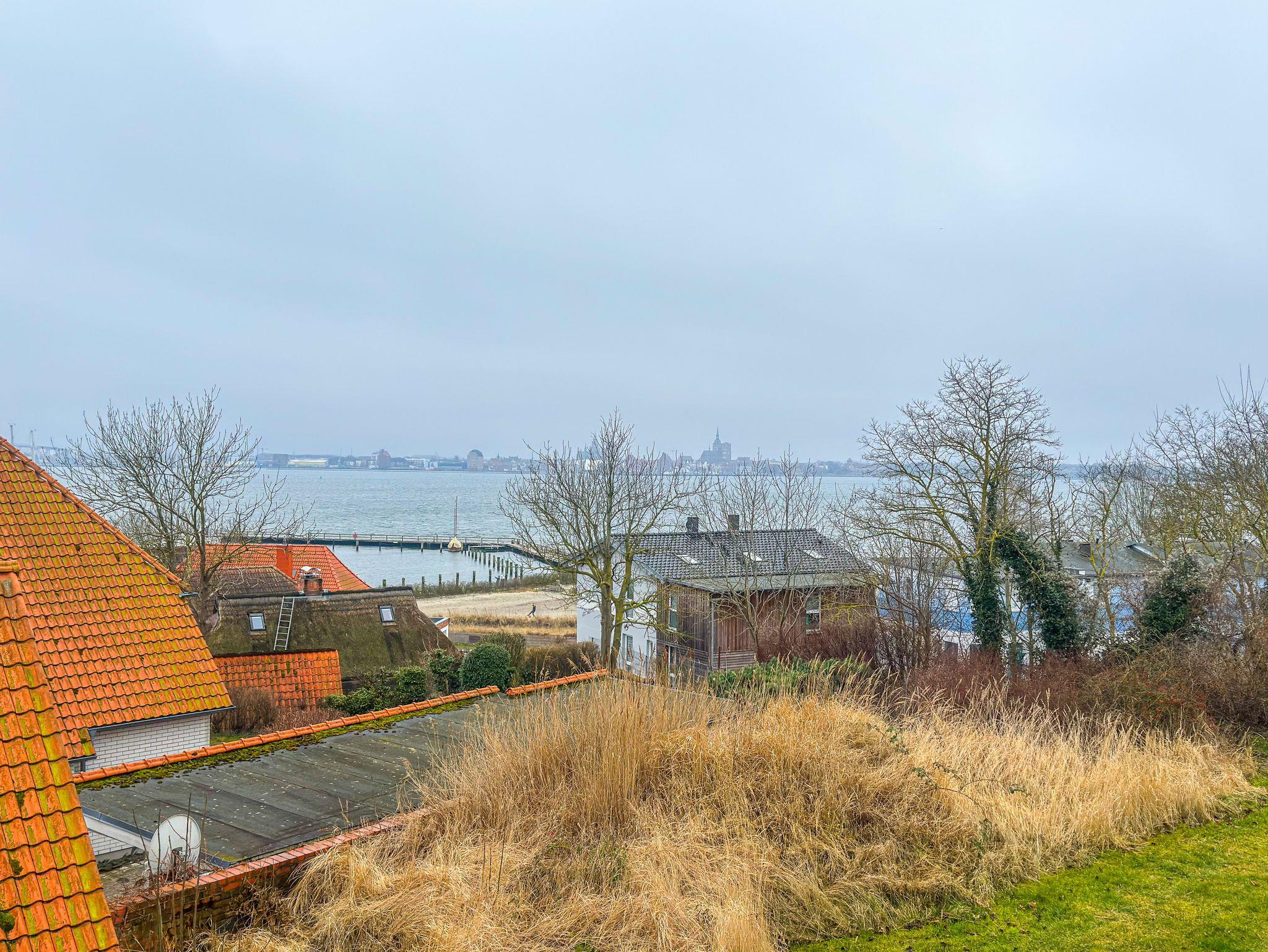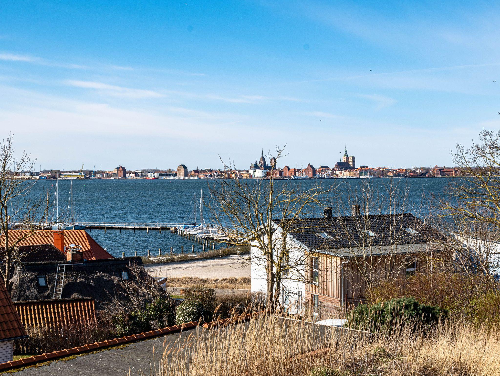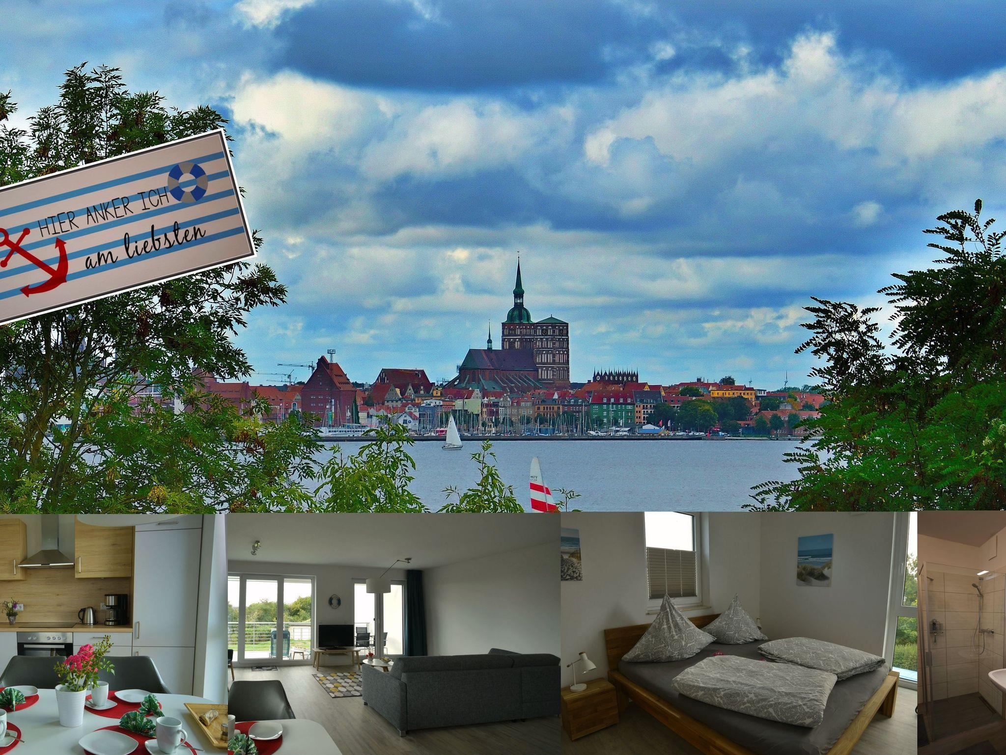 Moderne Ferienwohnung mit Balkon und Panoramablick auf Strelasund und Stralsund, nur 150 Meter vom Strand entfernt.