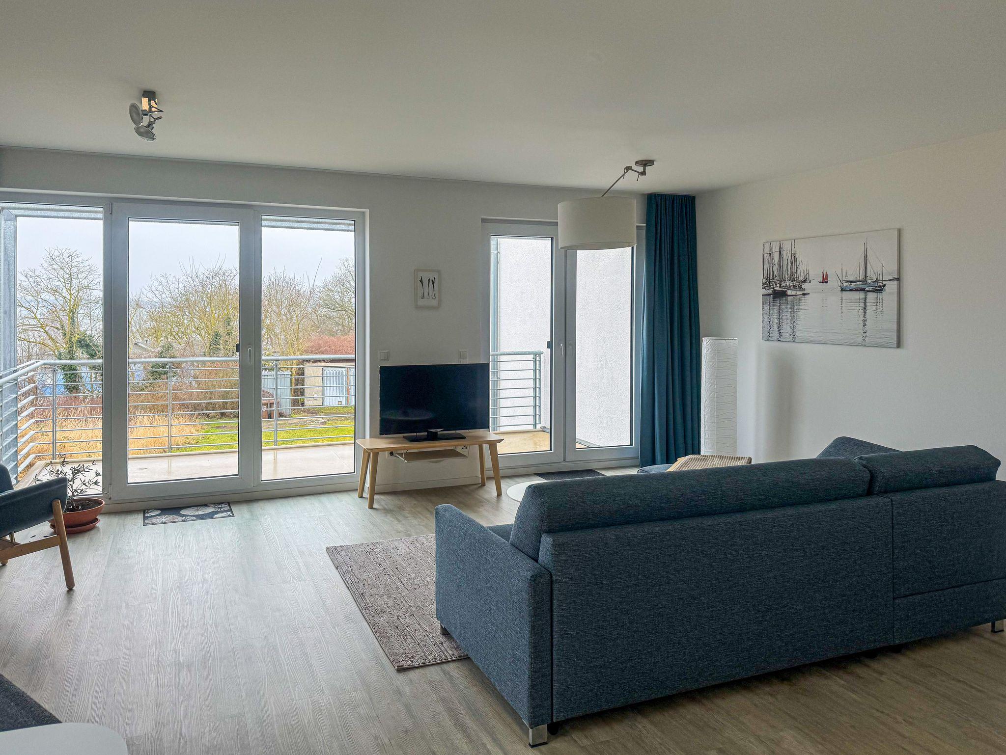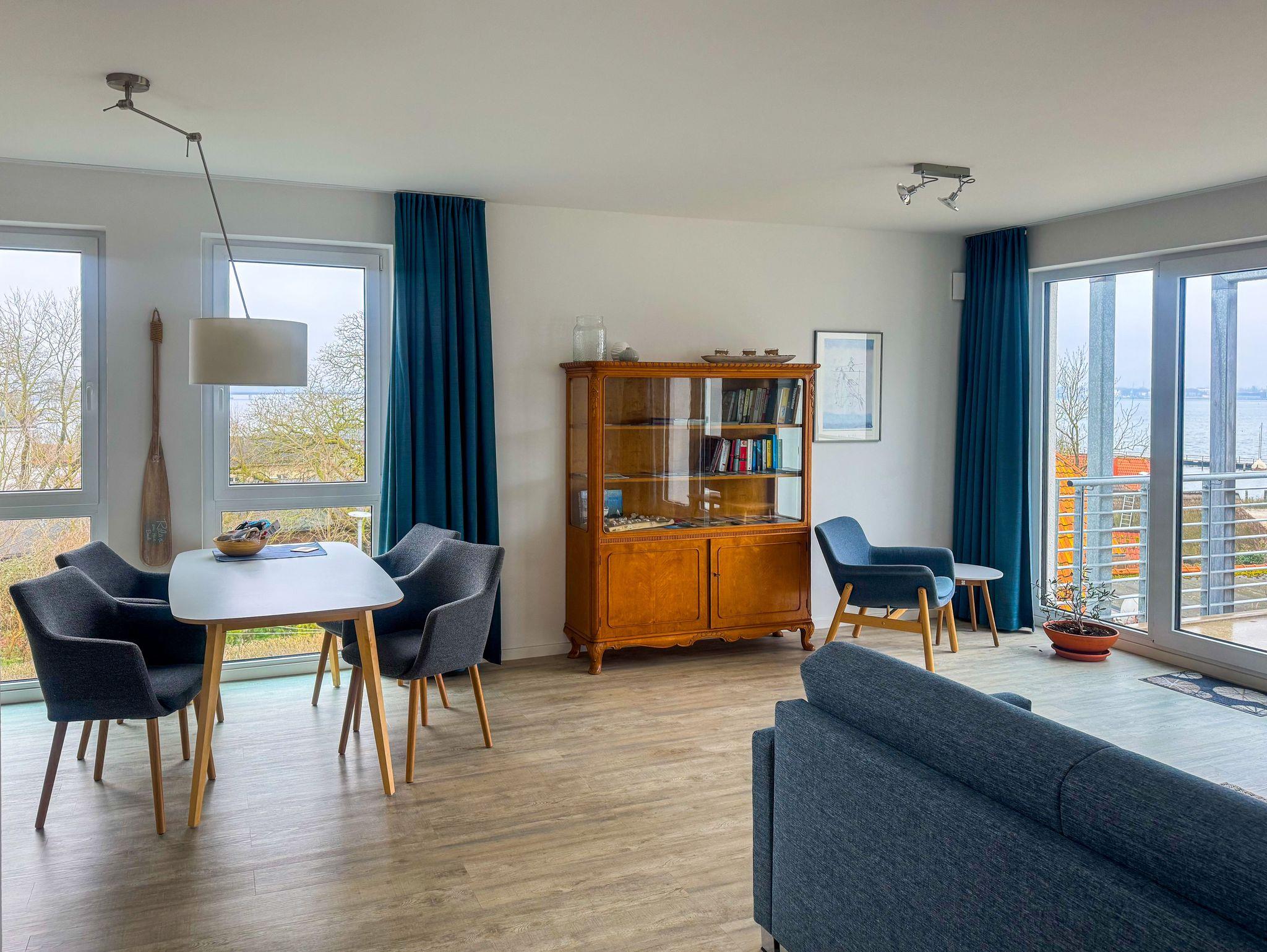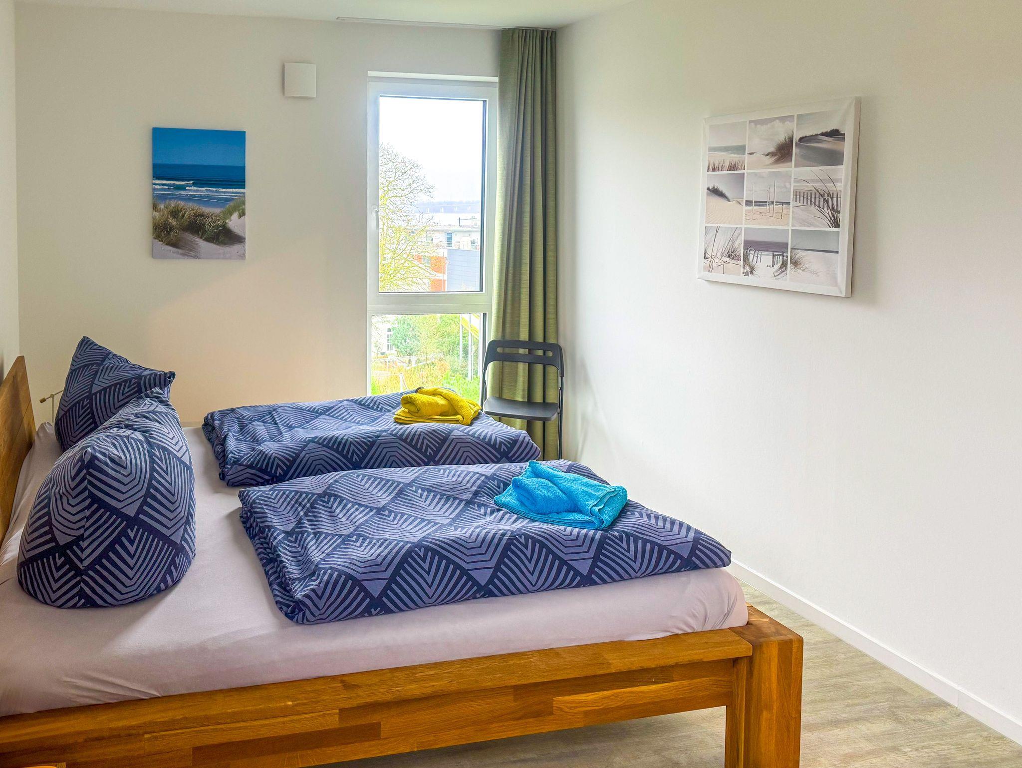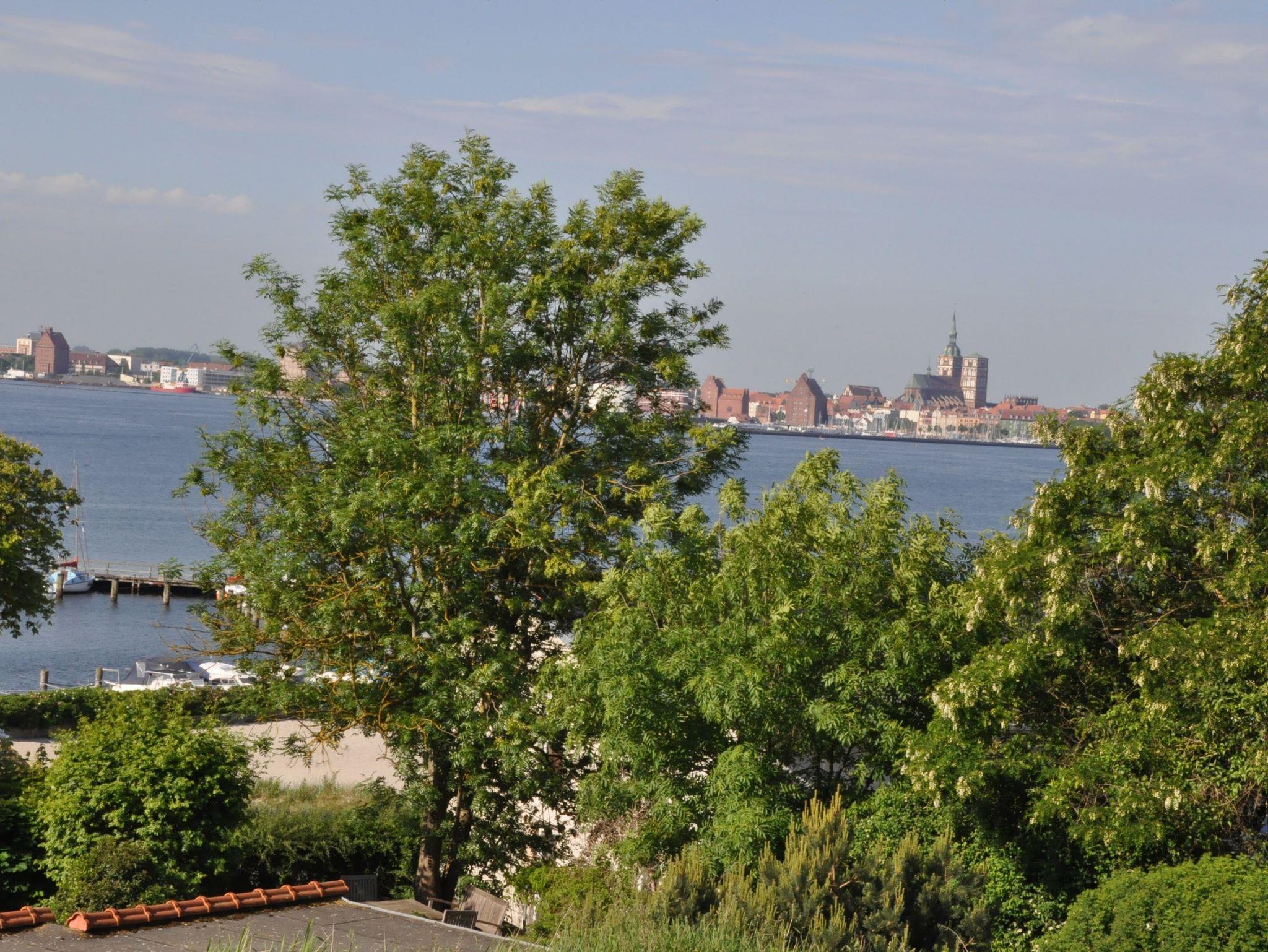 Moderne Ferienwohnung mit Balkon und Panoramablick auf Strelasund und Stralsund, nur 150 Meter vom Strand entfernt.