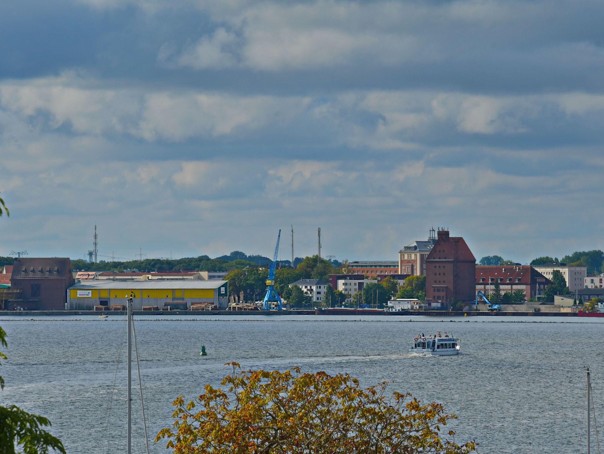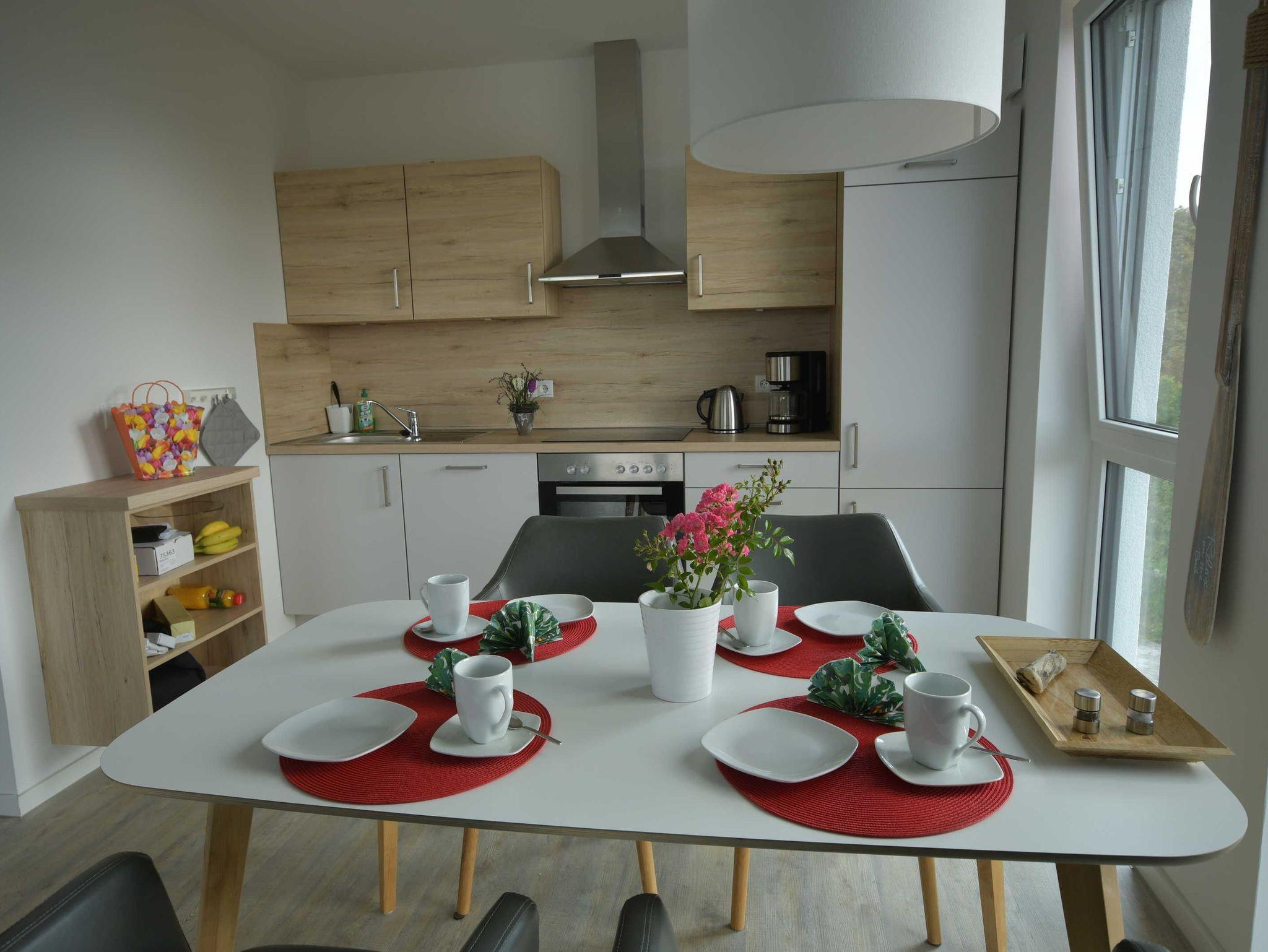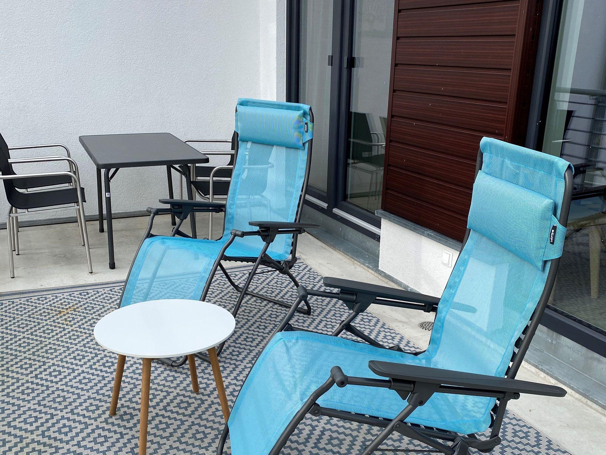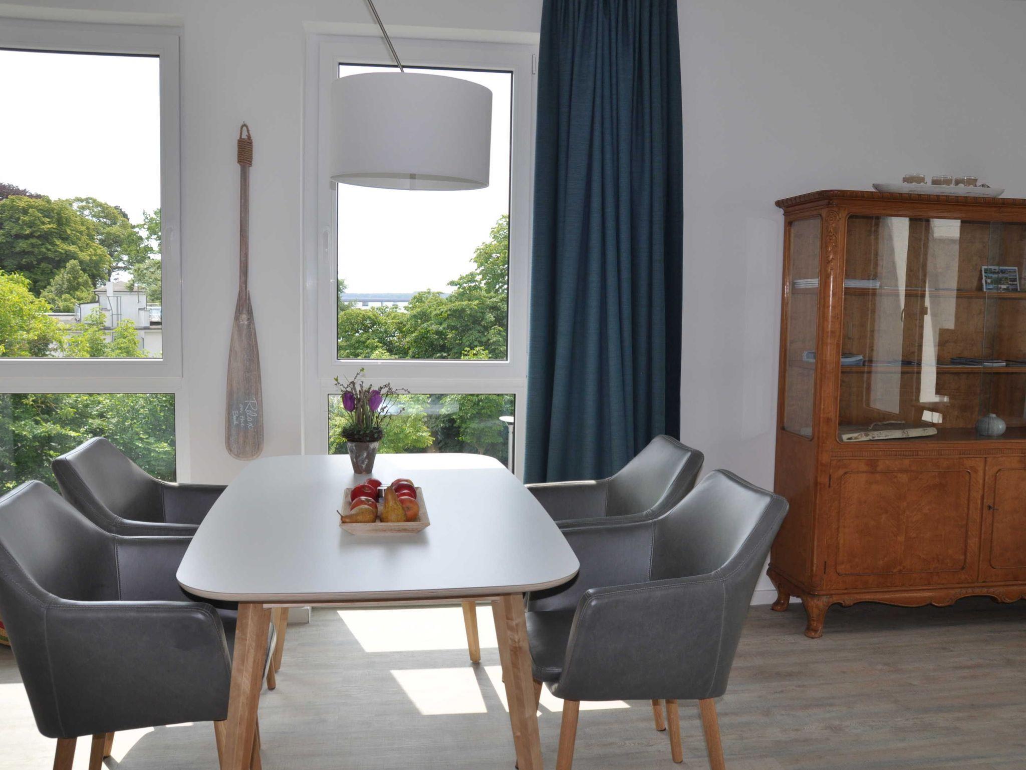 Moderne Ferienwohnung mit Balkon und Panoramablick auf Strelasund und Stralsund, nur 150 Meter vom Strand entfernt.