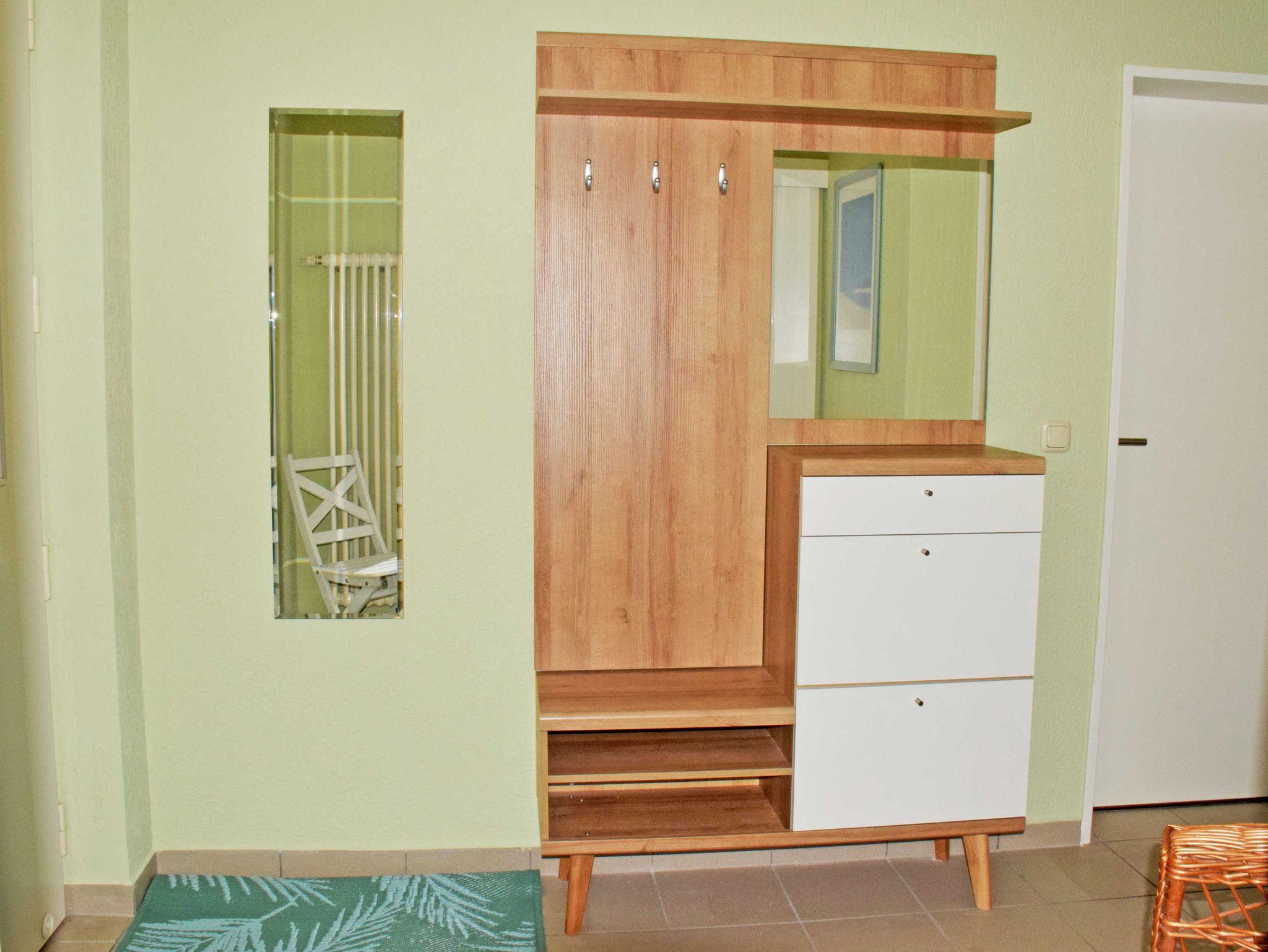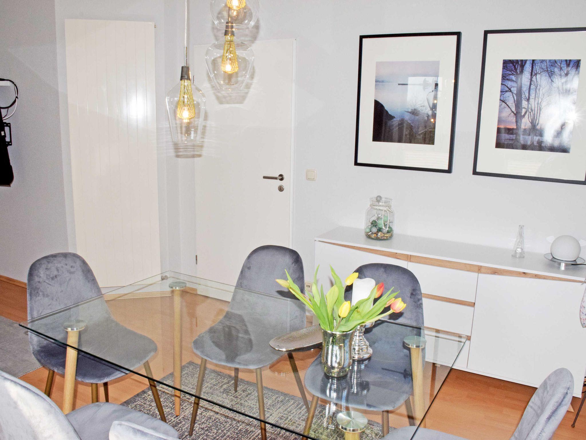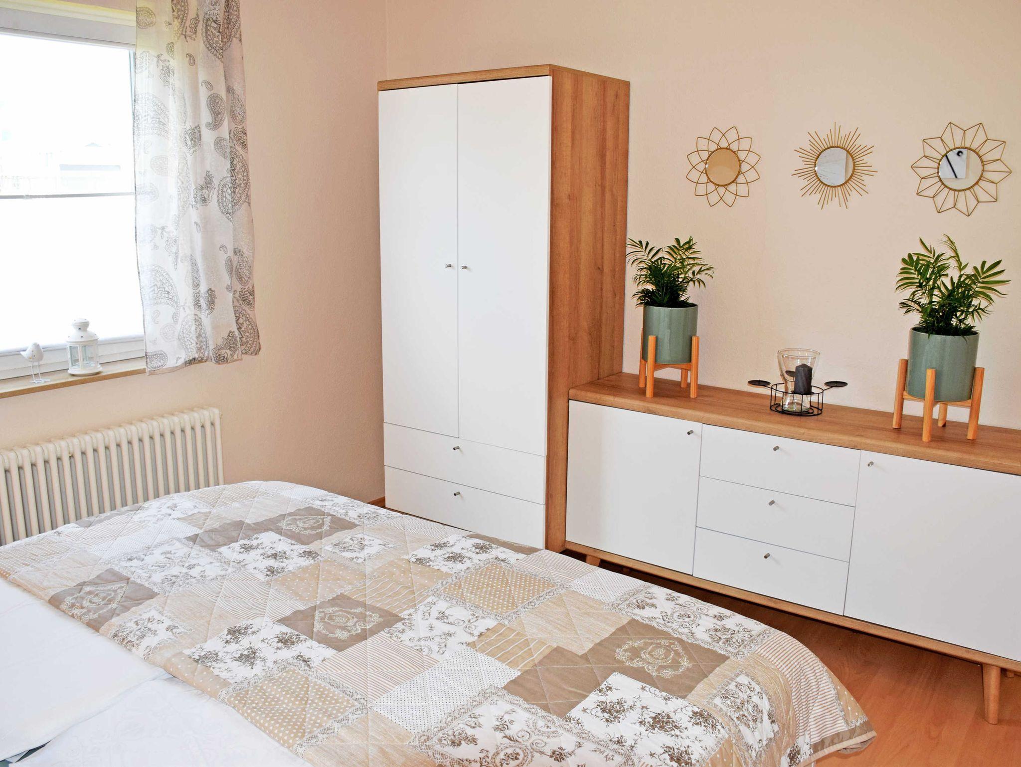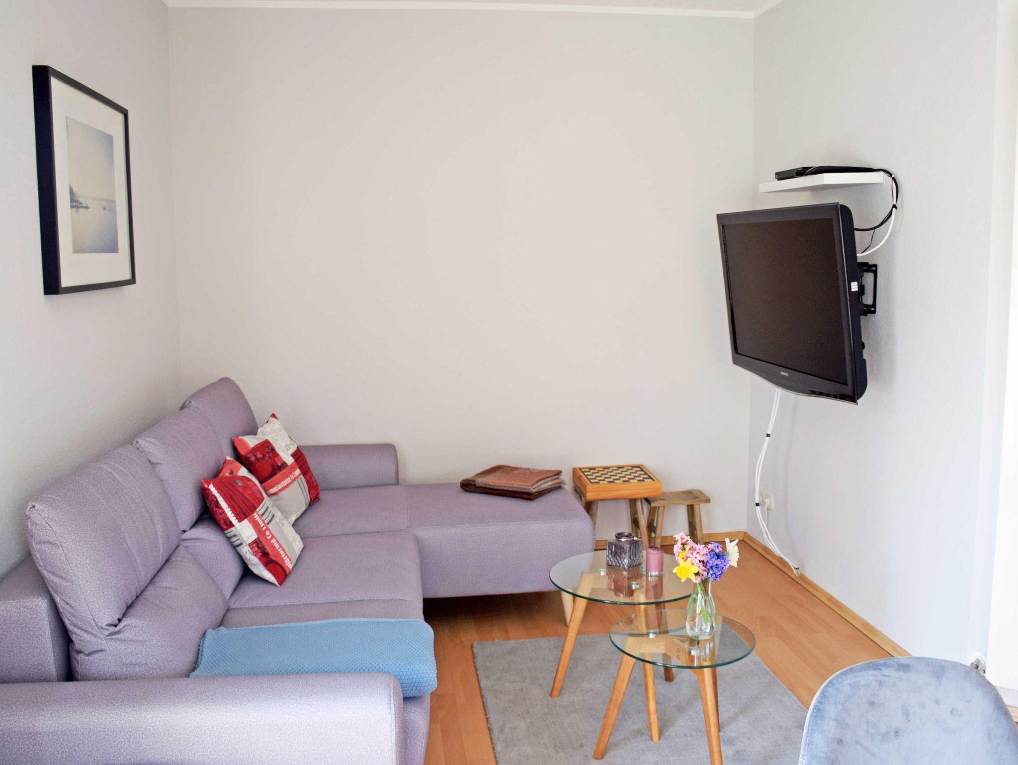 Die Nichtraucherwohnung verfügt über ein helles Wohnzimmer mit großem Flachbild-TV, Schrank, Couch und Tisch. Bei Bedarf kann die Couch für 2 Kinder bis 17 Jahre aufgebettet werden.
