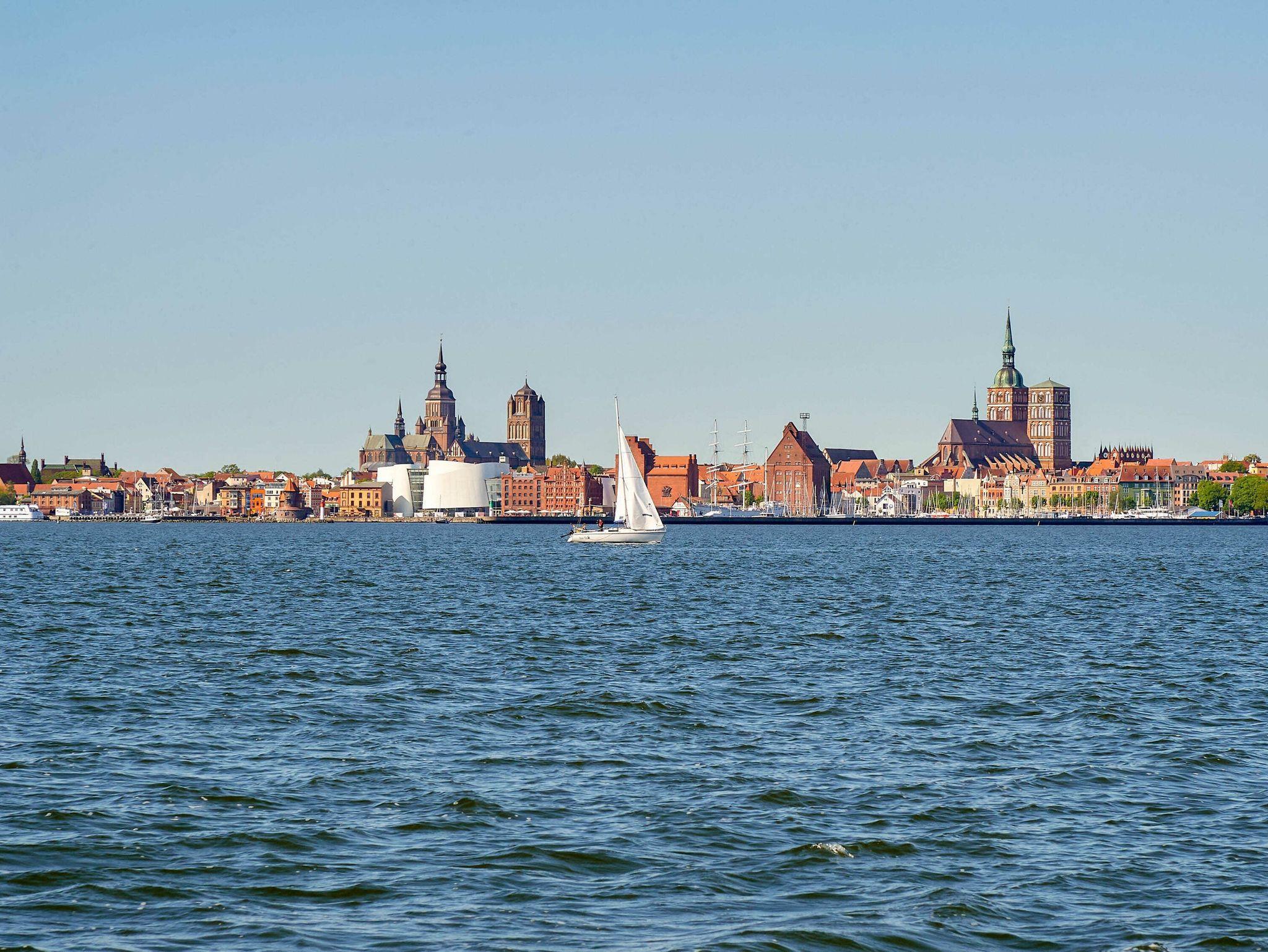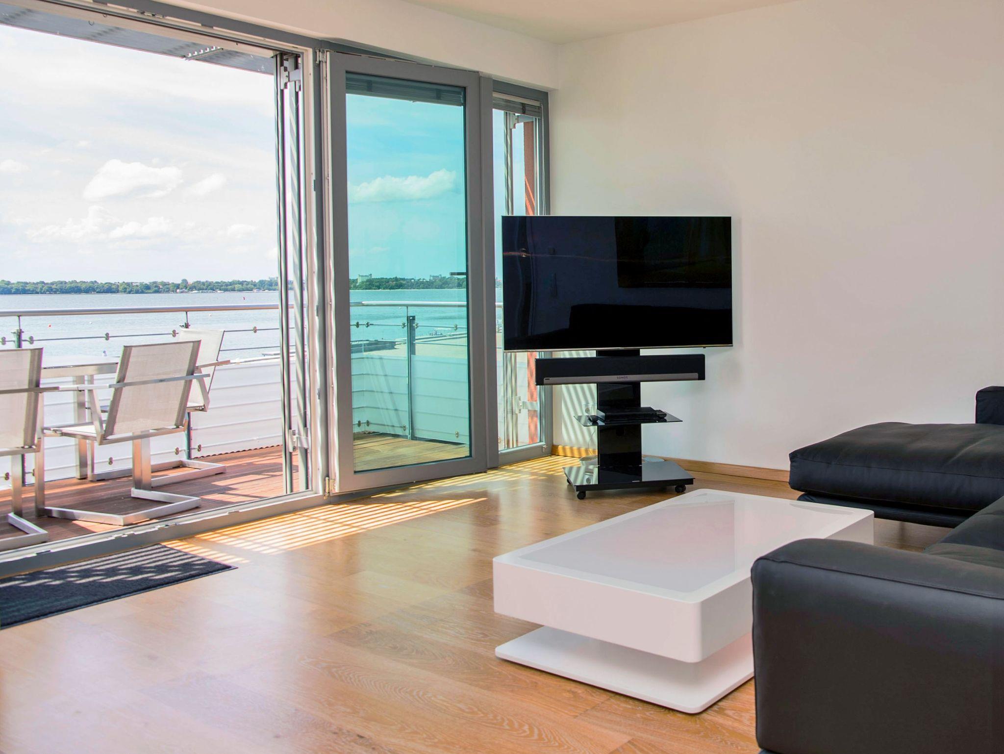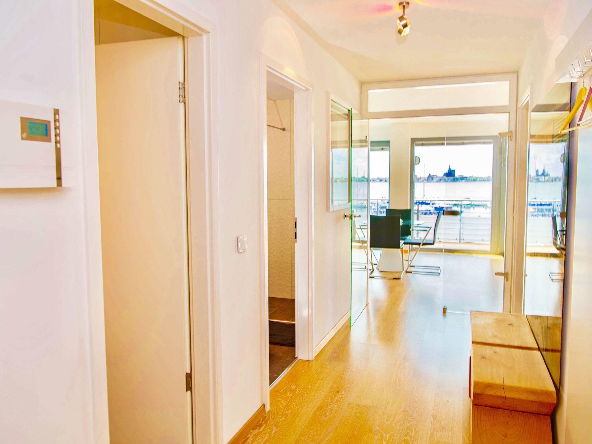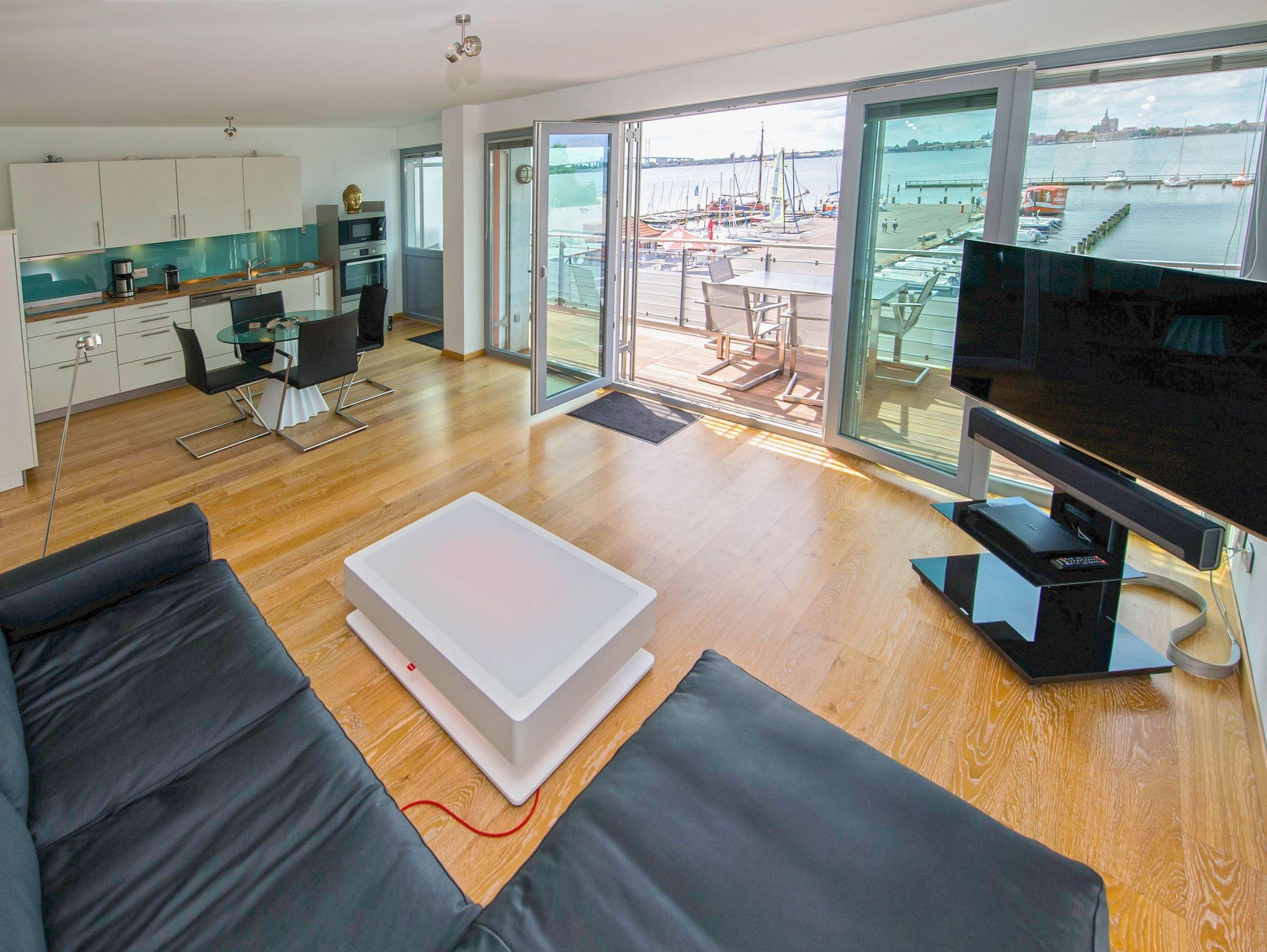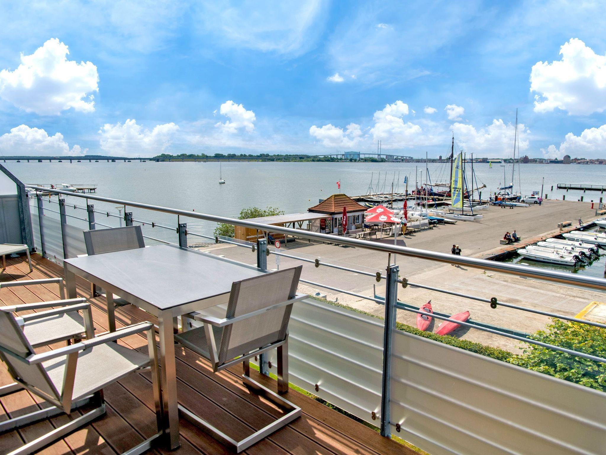 Genießen Sie barrierefreien Komfort und Panoramablick auf Stralsund und Strelasund vom Balkon dieser modernen Wohnung in Altefähr.