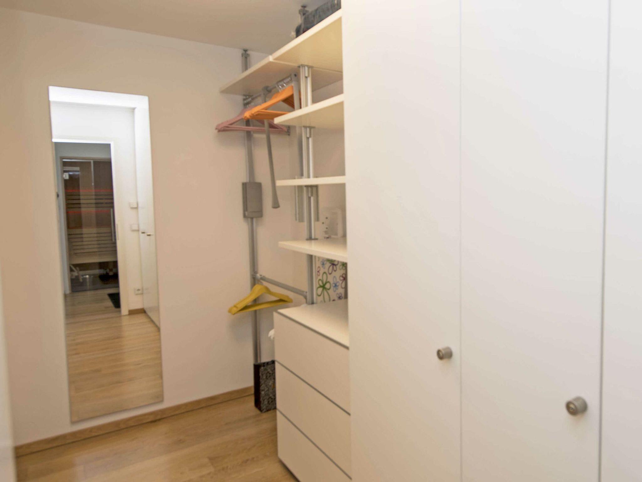 Das gemütliche ca. 13 m² große Schlafzimmer ist mit einem bequemen Boxspringbett (1,80m x 2,00m) und einem Flachbild-TV ausgestattet. Ein großer Kleiderschrank zum Verstauen Ihrer Urlaubsgarderobe befindet sich in einem, durch eine Schiebetür vom Schlafzimmer getrennten Ankleideraum. Dieser ist auch vom Flur aus begehbar.