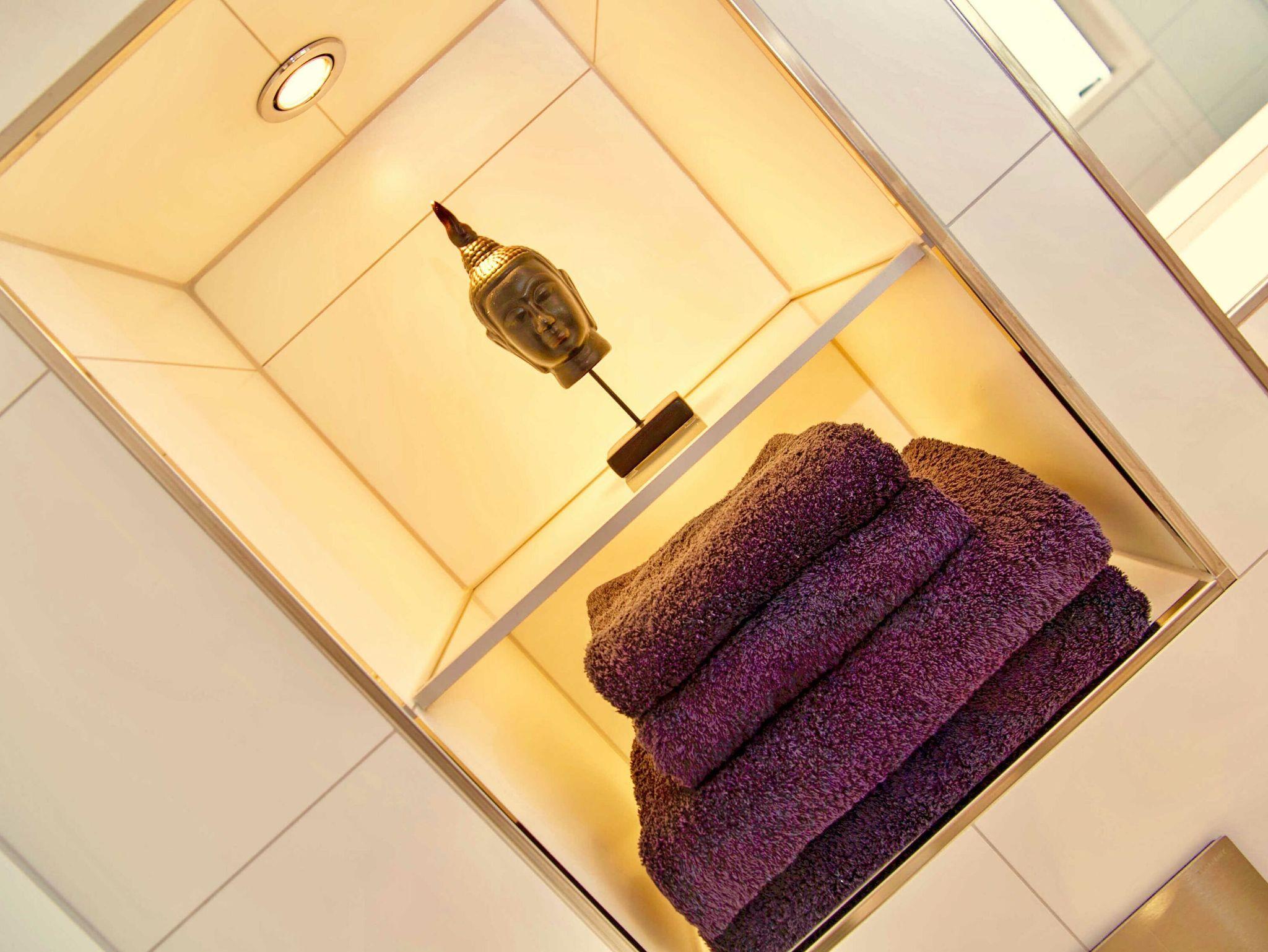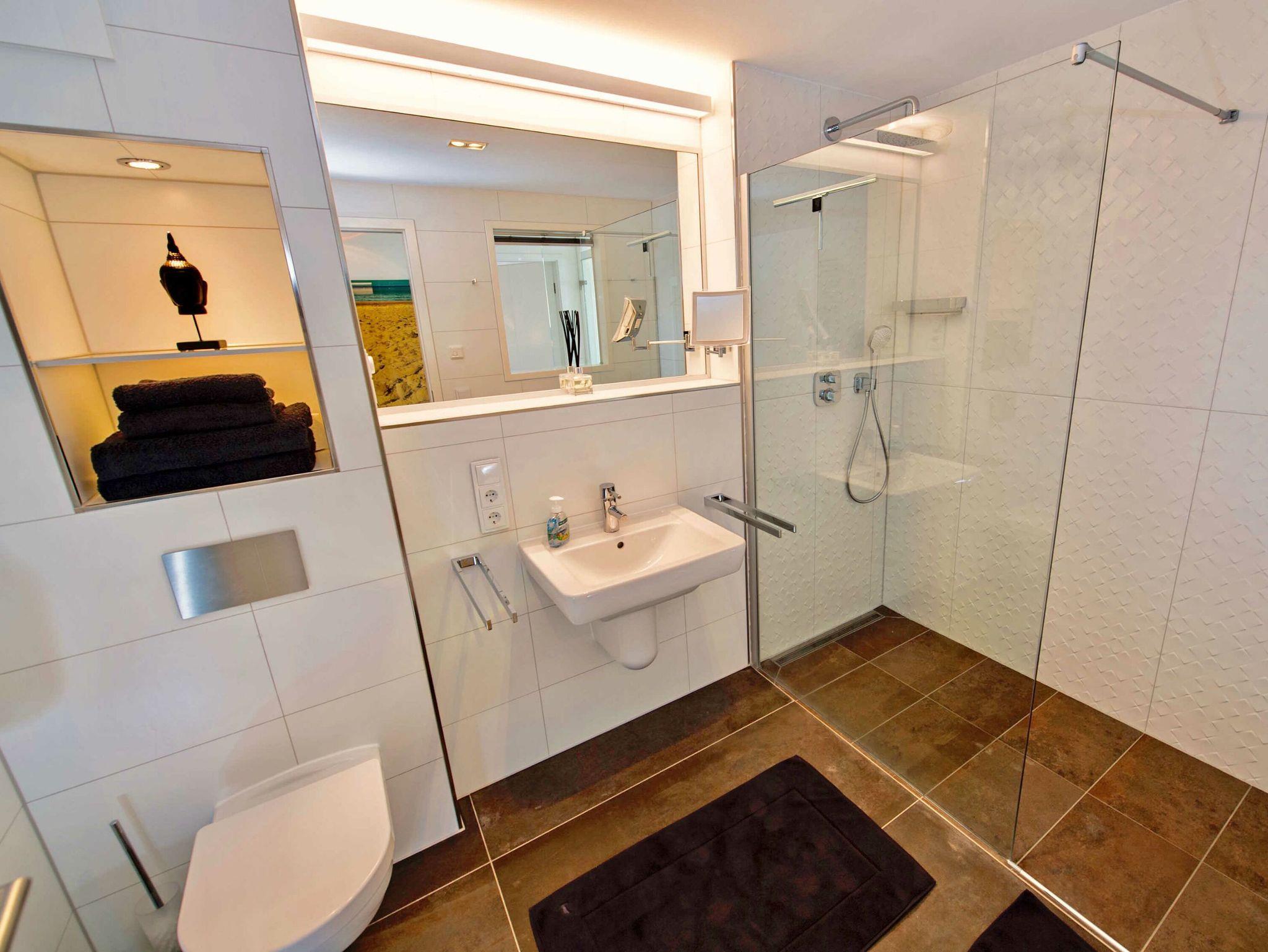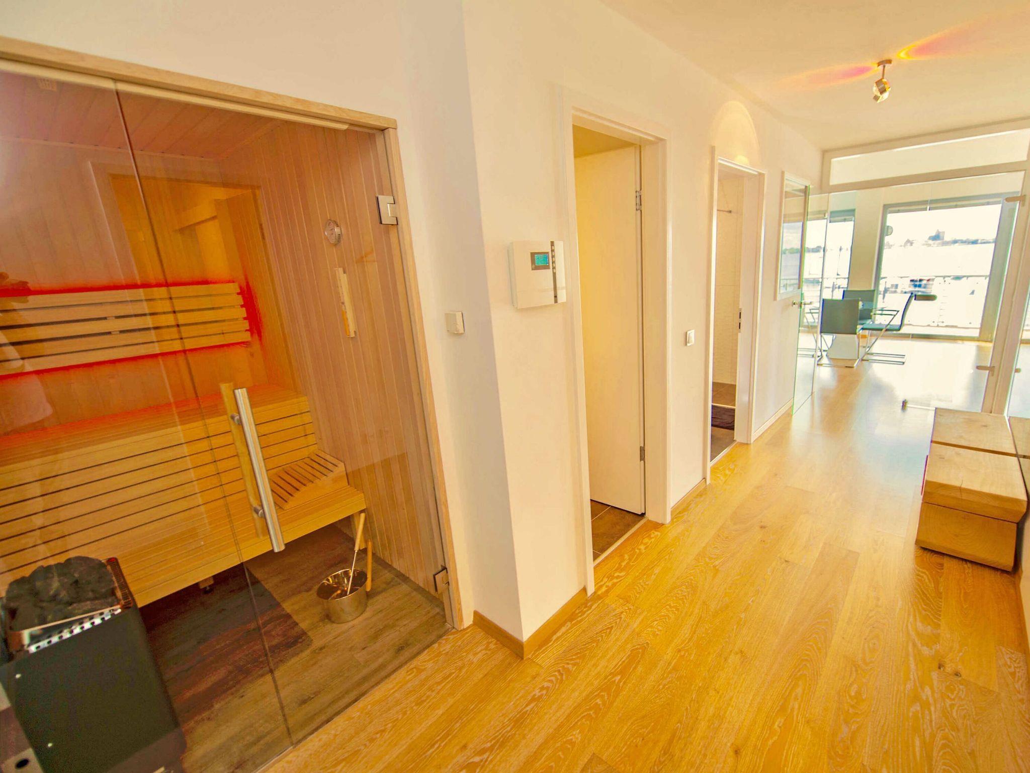 Neben dem Badezimmer mit geräumiger, bodengleicher Regendusche, Waschtisch, WC, Haartrockner und Handtuchheizung rundet eine separate wohnungseigene Sauna den exklusiven Eindruck ab. Ein Gäste-WC ist ebenfalls vorhanden.