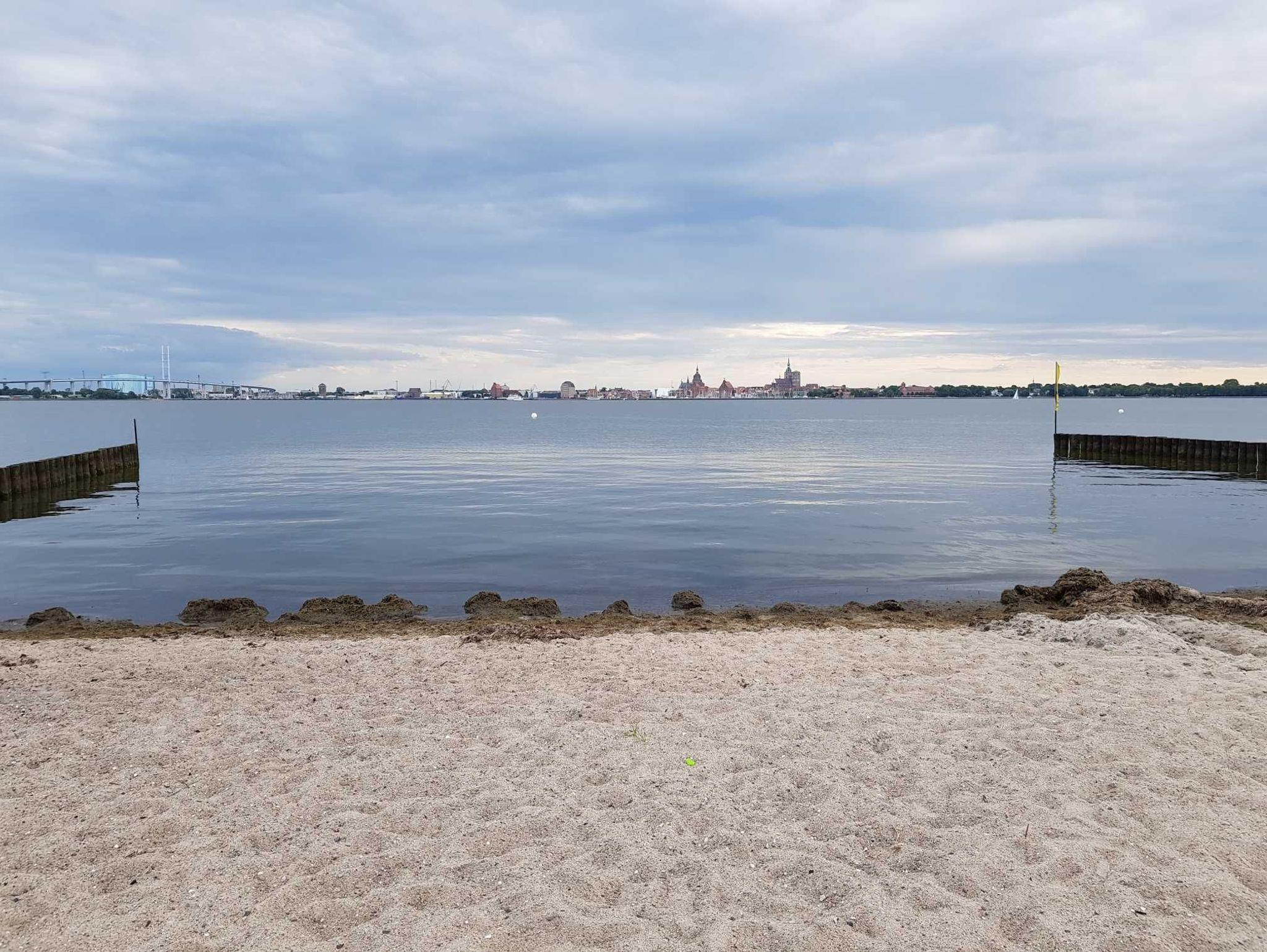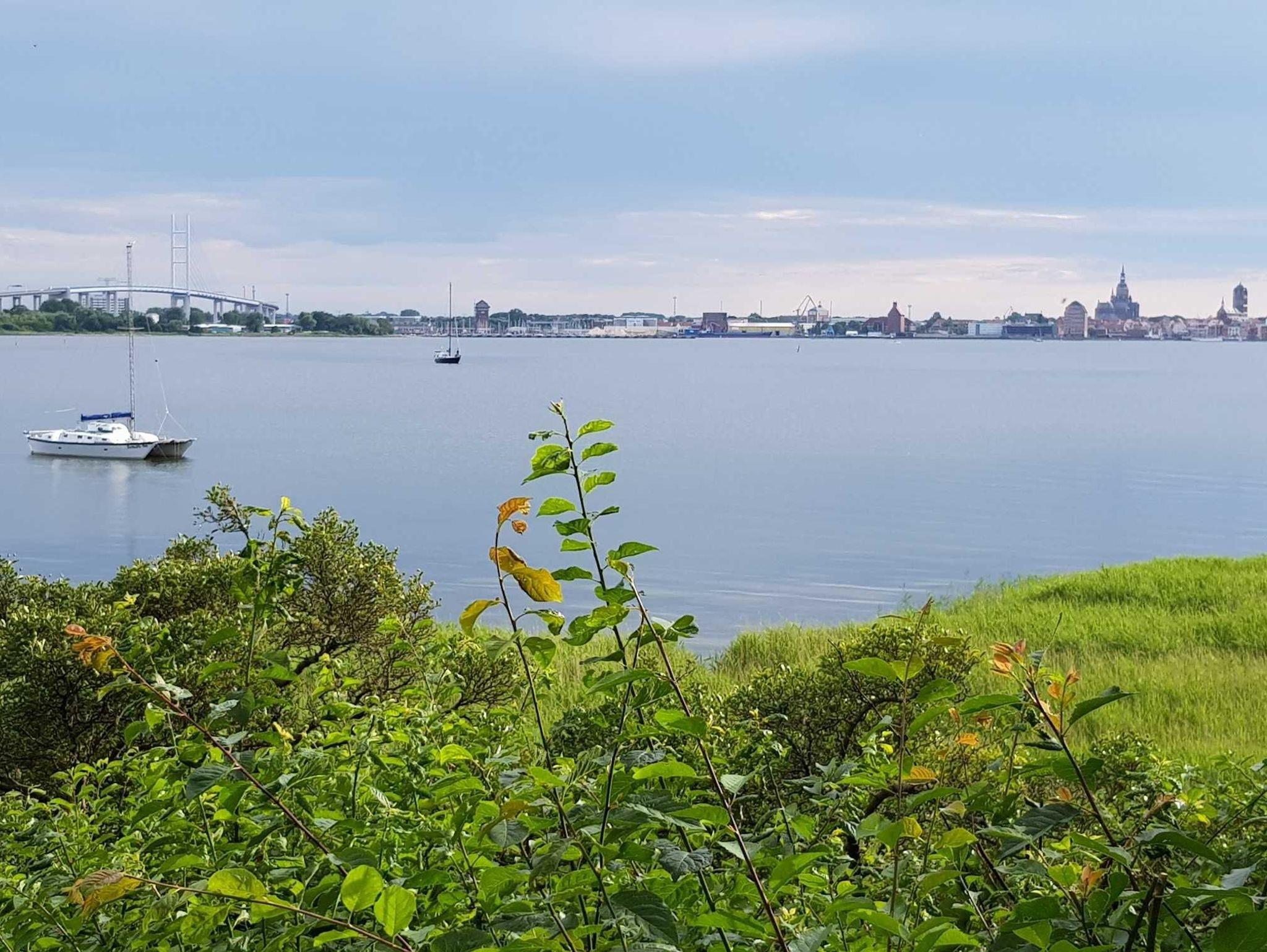 Urlaub auf Rügen - im Seebad Altefähr am Strelasund, mit Blick auf die Hansestadt Stralsund.
