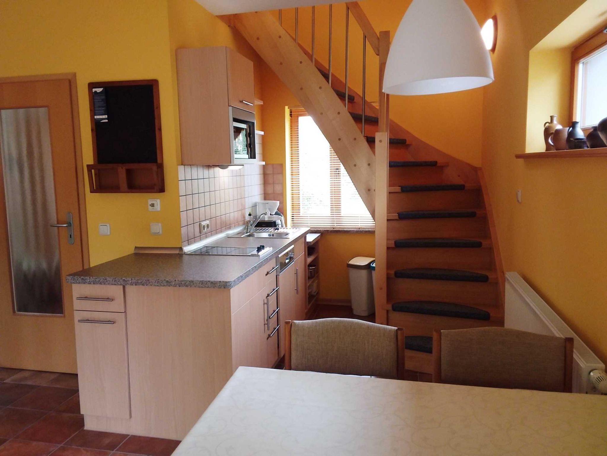 Im gefliesten Erdgeschoss liegt der Wohnraum (Polstergarnitur, TV, Radio/CD) mit offener Küche (Essbereich, 2 E-Platten, Mikrowelle, Geschirrspüler und Kühlschrank, Kaffeemaschine, Toaster, Wasserkocher) und das Bad mit Dusche/WC (inkl. Fön und Wäscheständer).