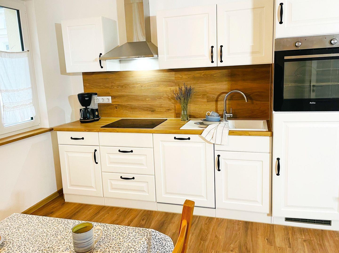 KÜCHE // offene Wohnküche mit Essbereich, 4-Platten Ceranfeld, Spülmaschine, Kühlschrank, Backofen, Mikrowelle, Toaster, Wasserkocher, Kaffeemaschine, reichlich Besteck, Geschirr und Küchenutensilien ++