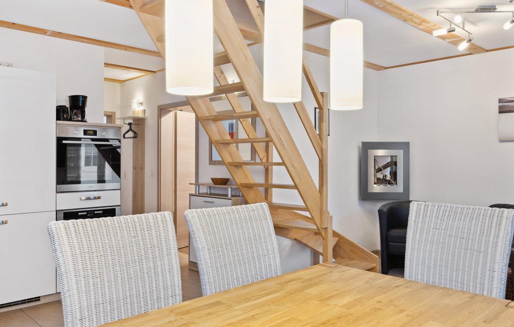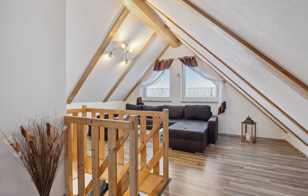 Eine schöne Holztreppe führt hinauf ins Obergeschoss, wo sich ein loftartig angelegter Wohnraum befindet und sie zu schönen Filmabenden einlädt.