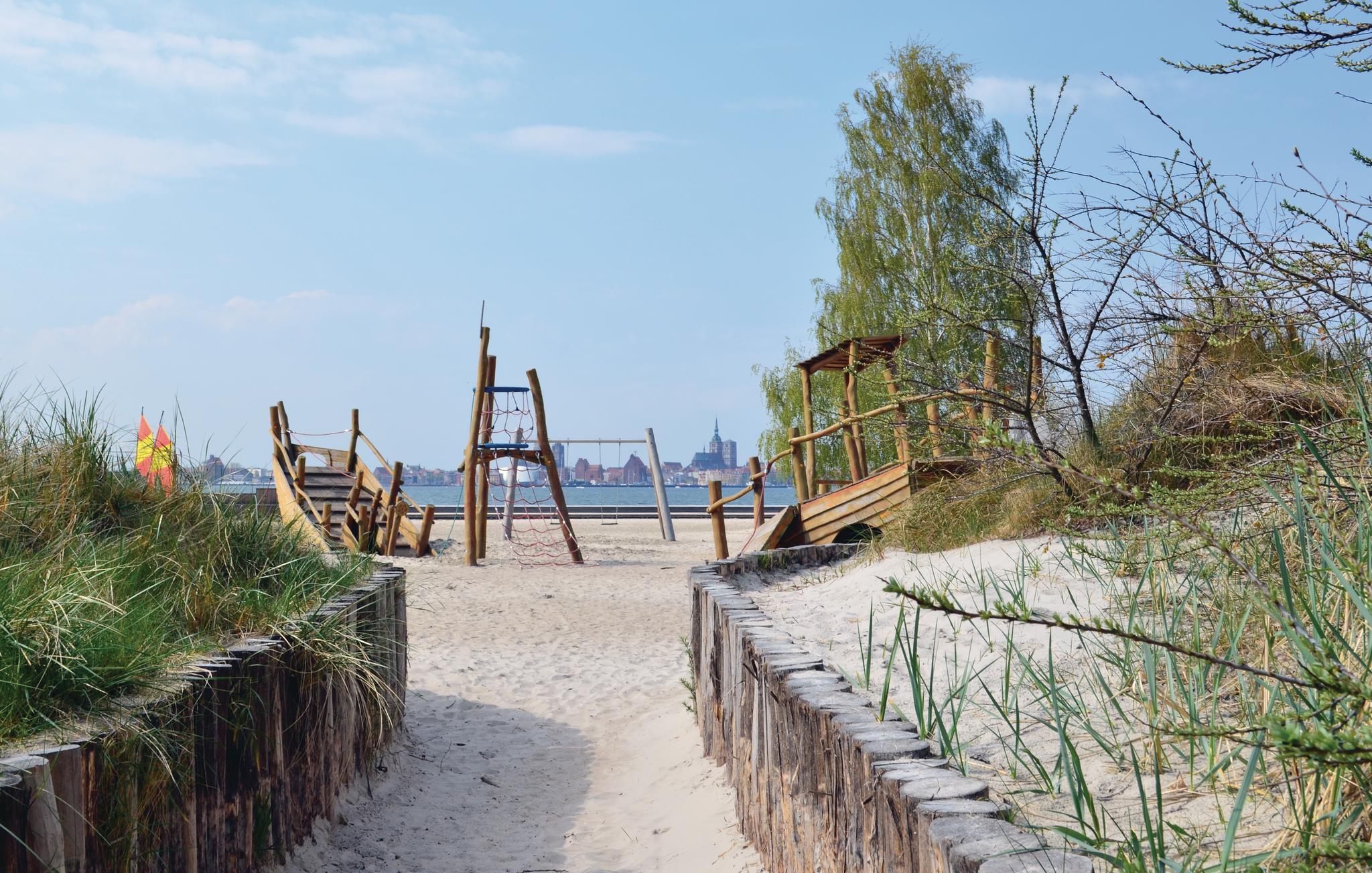 Altefähr liegt ganz im Südosten der Insel Rügen, direkt am Strelasund. Vom kleinen Hafen und von der Strandpromenade aus können Sie den Blick über das Wasser, über die Dächer und Kirchtürme der historischen Altstadt von Stralsund schweifen lassen. Die moderne Strandpromenade und der breite Sandstrand laden zum Flanieren und Verweilen ein und das flach abfallende Wasser am Strand ist besonders attraktiv für Familien. Die Kinder können sich auf dem Strandspielplatz austoben und auch für die etwas Größeren gibt es mit Beachvolleyballplätzen, Segel- und Surfschulen viele tolle Angebote, dank denen Spiel und Spaß garantiert sind.