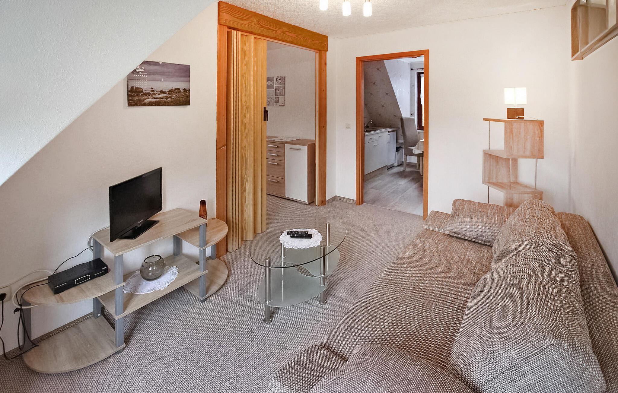 Die zentral beheizte Wohnung verfügt über ein Wohnzimmer (Polstermöbel, Flachbild-TV), Schlafzimmer (Doppelbett, Zustellbett), Küche (Essecke, Küchenzeile mit Kühlschrank und Kochplatte, diverse Kleinküchengeräte) und ein Badezimmer mit Dusche/WC .