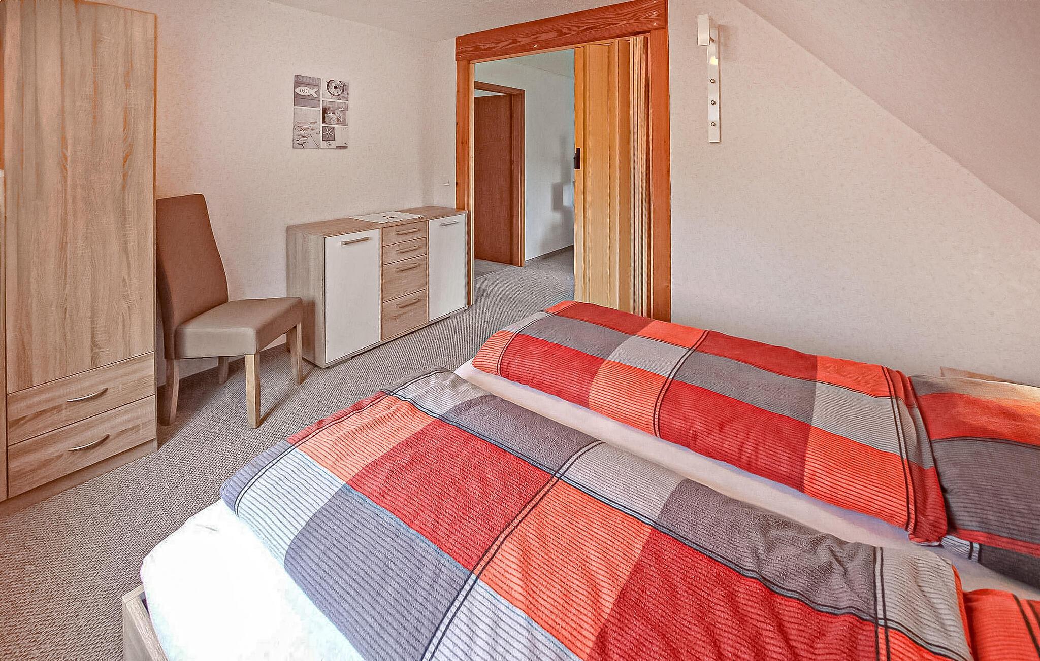 Hierbei handelt es sich um eine von zwei Ferienwohnungen (renoviert 2017 und 2018), die sich im Obergeschoss eines Wohnhauses auf dem 1.700 qm großen Wohngrundstück des Eigentümers in ruhiger Wohnlage befinden. Als Vorraum zu den Ferienwohnungen steht Ihnen ein möblierter Flur zur gemeinsamen Nutzung zur Verfügung. Außerdem gibt es einen gemeinsamen Außensitzplatz, Grill, Parkplatz, verschiedene Spielmöglichkeiten (TT-Teller, Schaukel), Kinderbett und Hochstuhl.