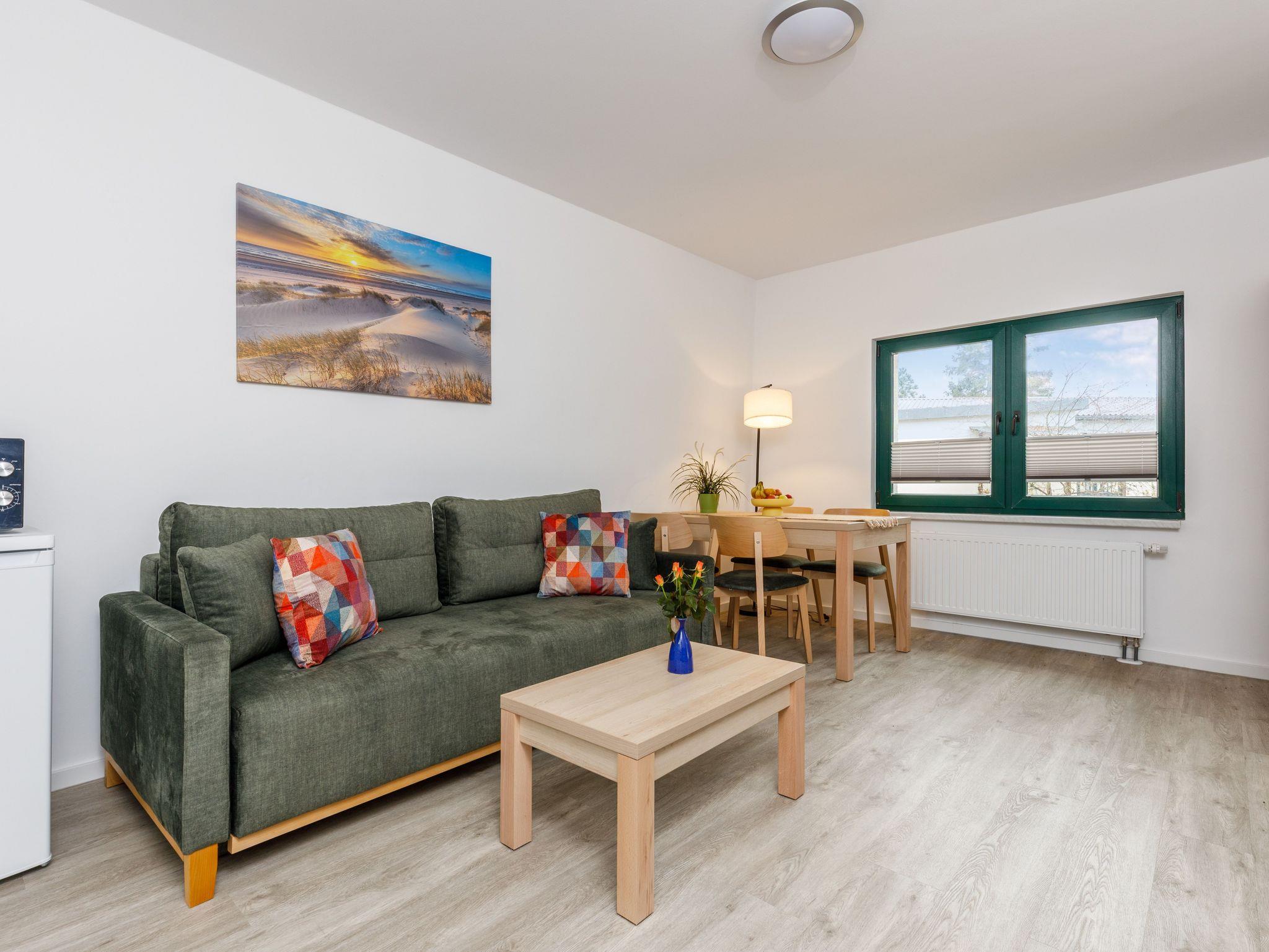 Das Apartment verfügt über ein Schlafzimmer mit Doppelbett sowie einen Wohnbereich mit Schlafsofa und eignet sich ideal für Paare oder kleine Familien. Auch Vierbeiner sind in dieser Kategorie herzlich willkommen.