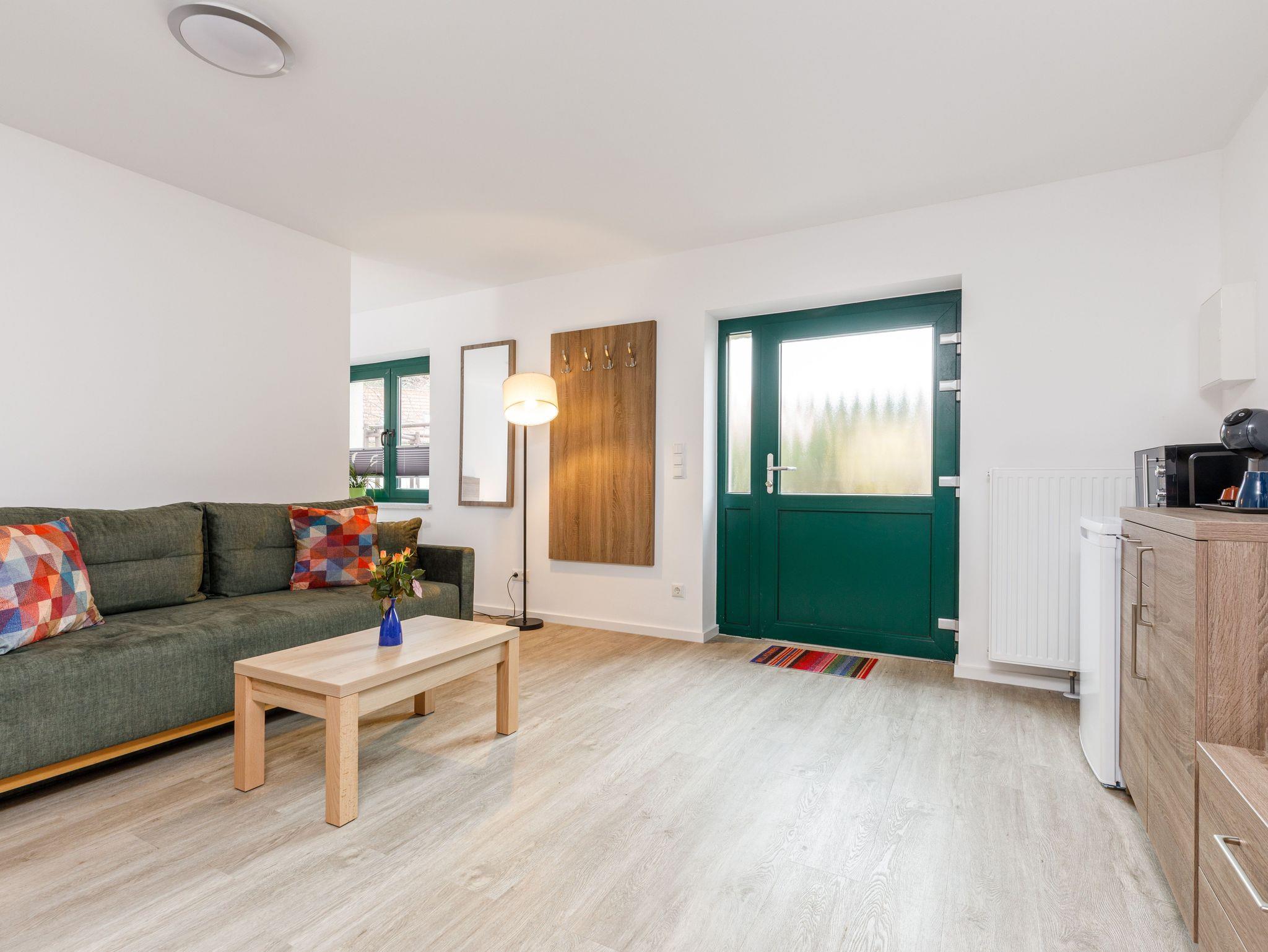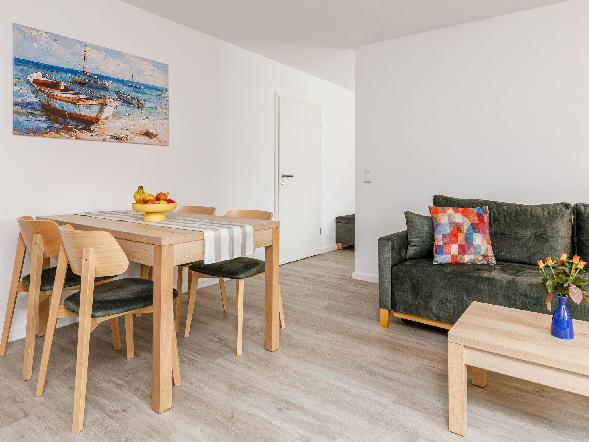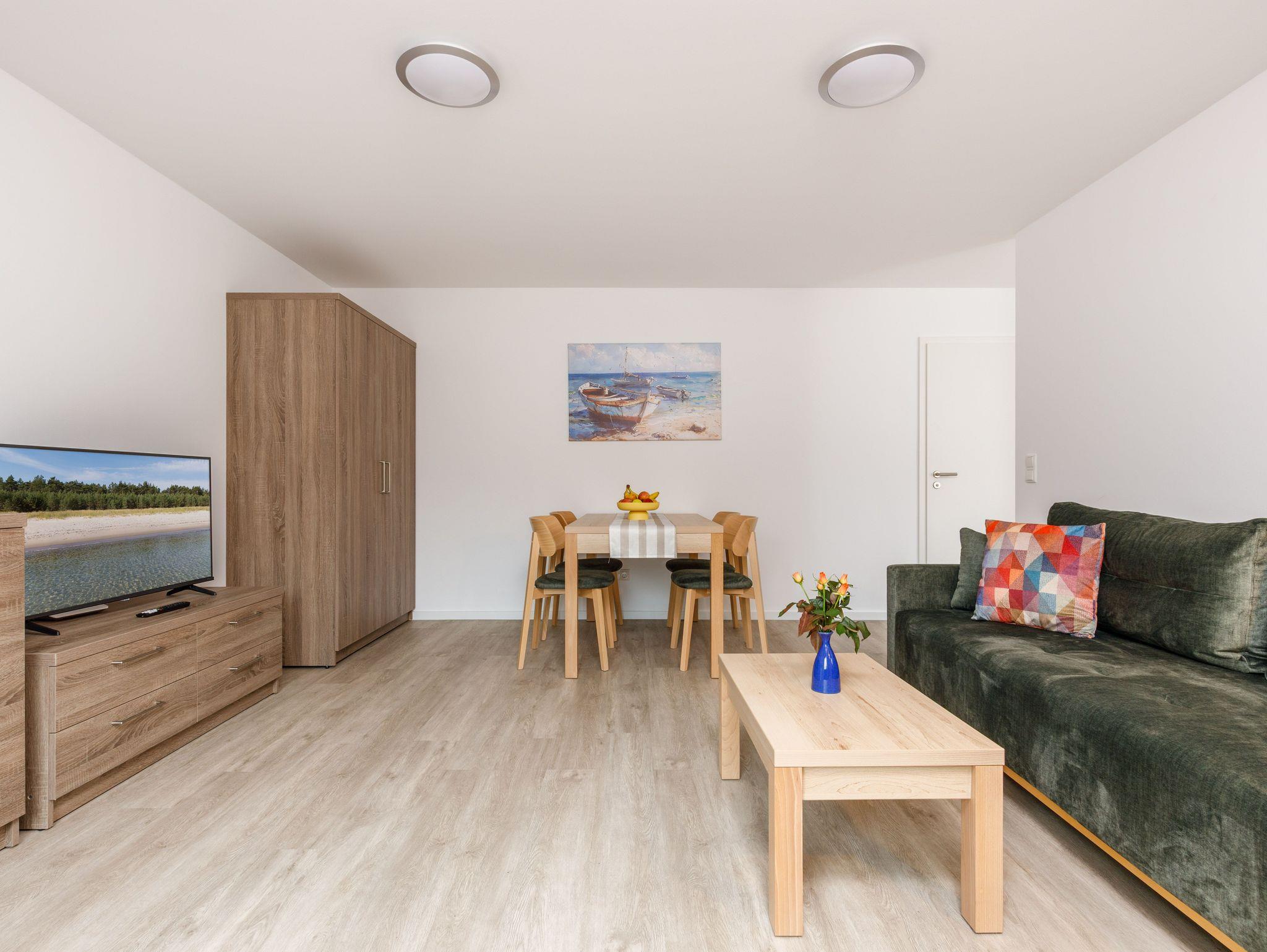 Ein Schlafzimmer mit Doppelbett sowie ein Wohnbereich mit Schlafsofa bieten komfortablen Raum für einen entspannten Aufenthalt. Das Apartment ist allergikerfreundlich ausgestattet, daher sind Haustiere nicht gestattet. Eine Terrasse am Haus lädt dazu ein, die frische Ostseeluft zu genießen.