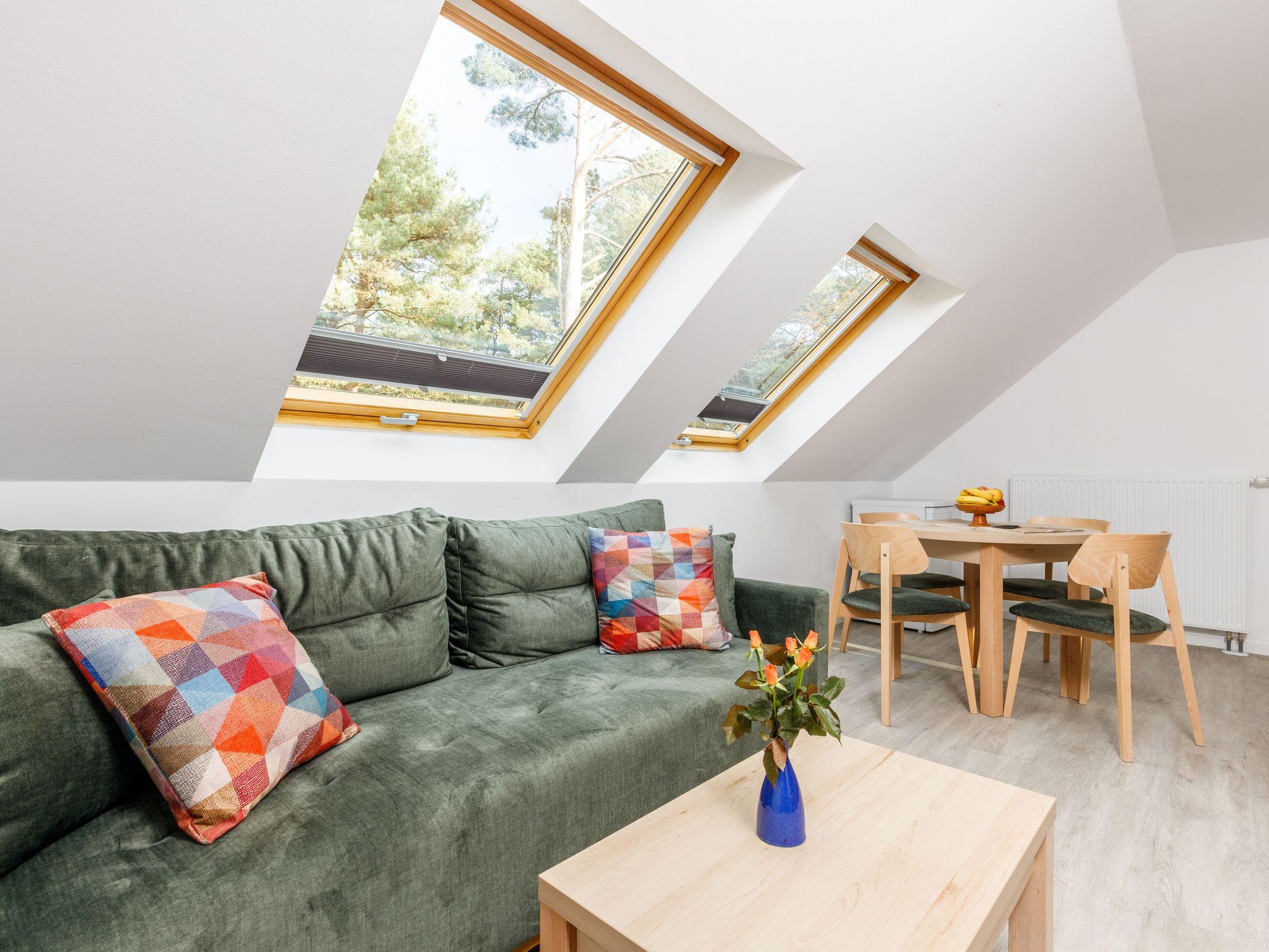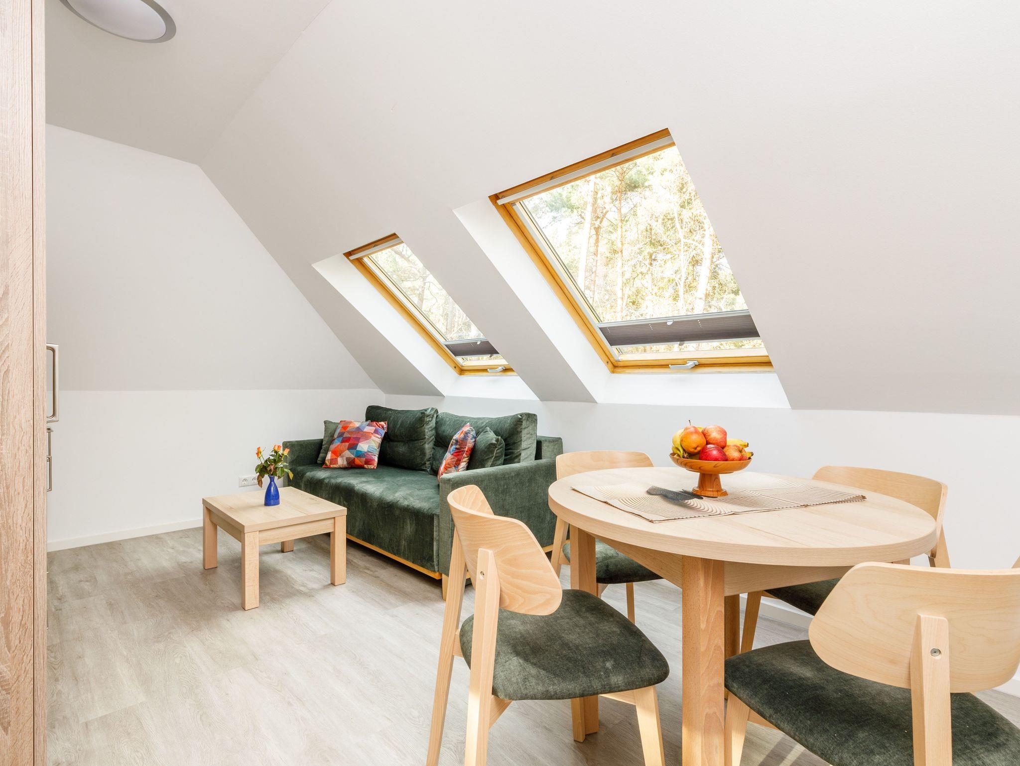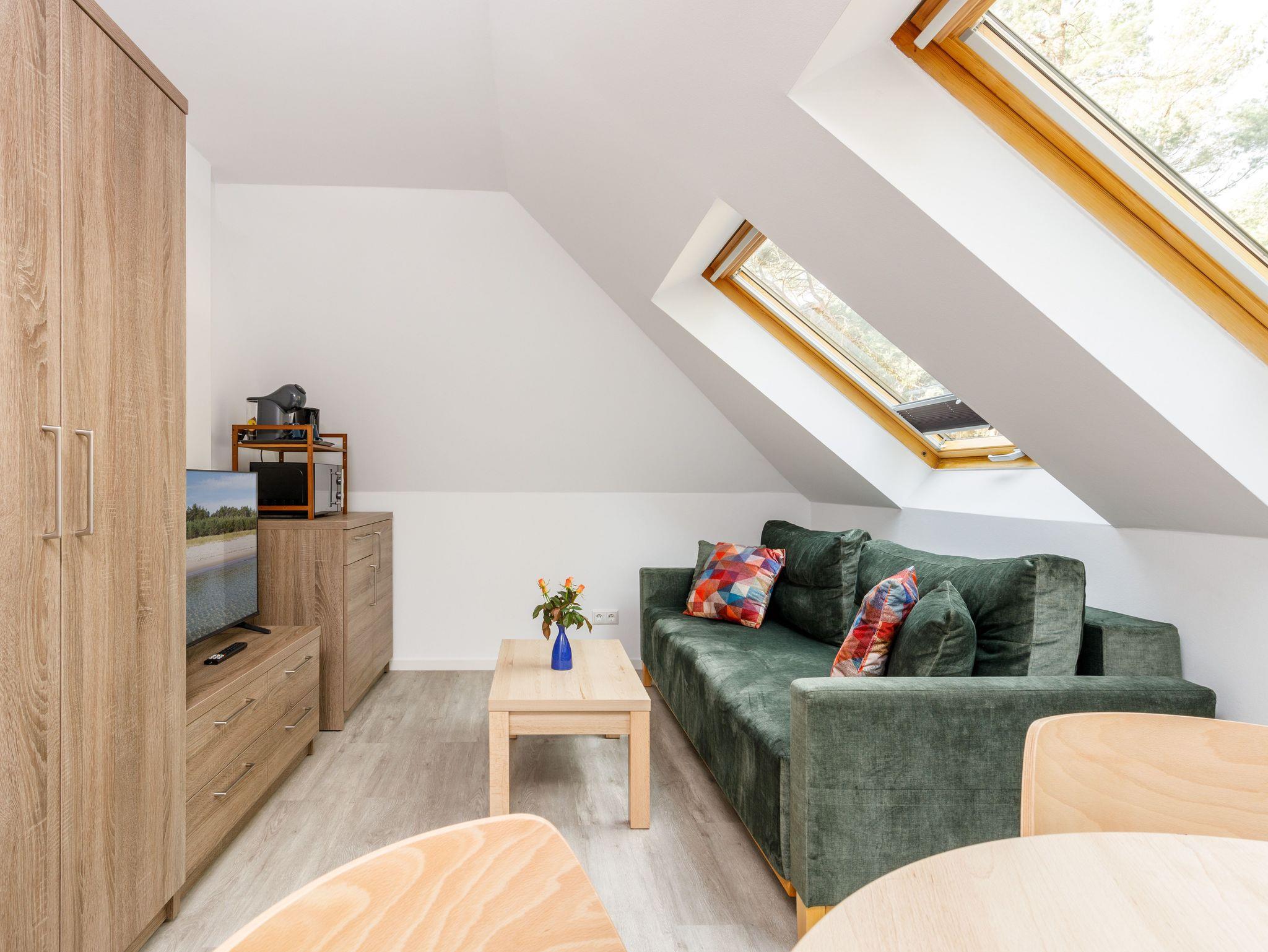 Ein Schlafzimmer mit Doppelbett sowie ein Wohnbereich mit Schlafsofa sorgen für ausreichend Platz und Komfort. Das Apartment ist allergikerfreundlich ausgestattet, daher sind Haustiere nicht erlaubt.