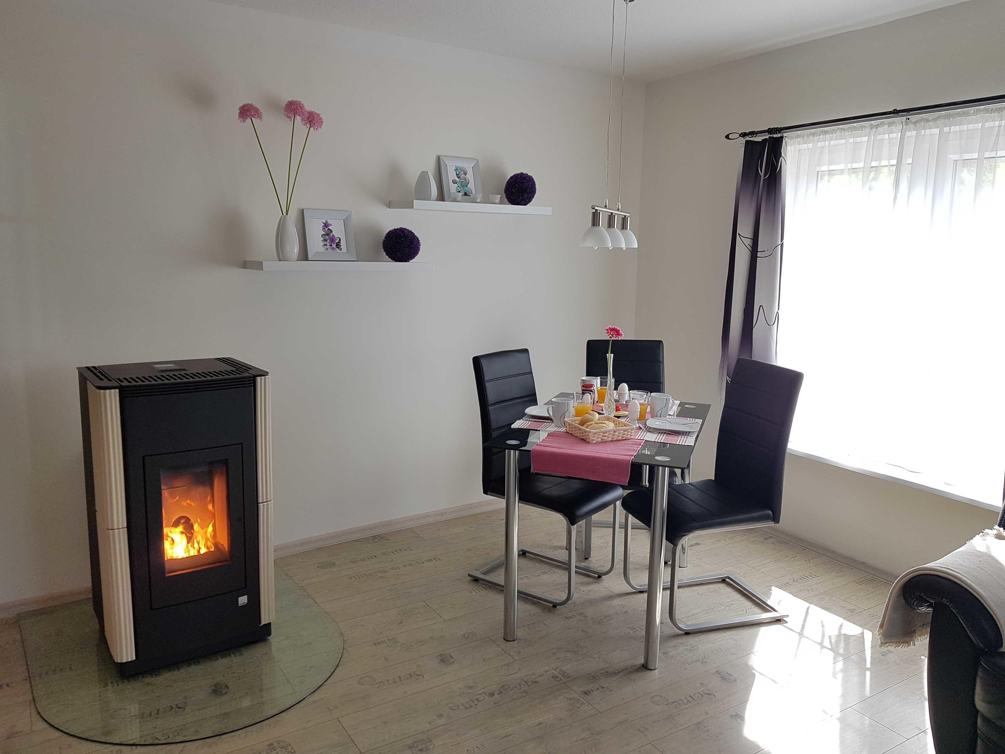 Der WOHNBEREICH ist mit einem 3er-Ledersofa und einem Beistelltisch ausgestattet. Ein Fußteil des Sofas lässt sich ausziehen. Ein Pellett-Kamin (September bis Mai) sorgt für angenehme Wärme. Für Unterhaltung sorgen ein Flachbild-TV mit Radio sowie Spiele und Bücher. WLAN ist kostenlos nutzbar.Der ESSBEREICH mit Esstisch drei Stühlen befindet sich vor dem Fenster durch das viel Licht eindringt und Sie einen schönen Blick auf Terrasse und Garten haben.