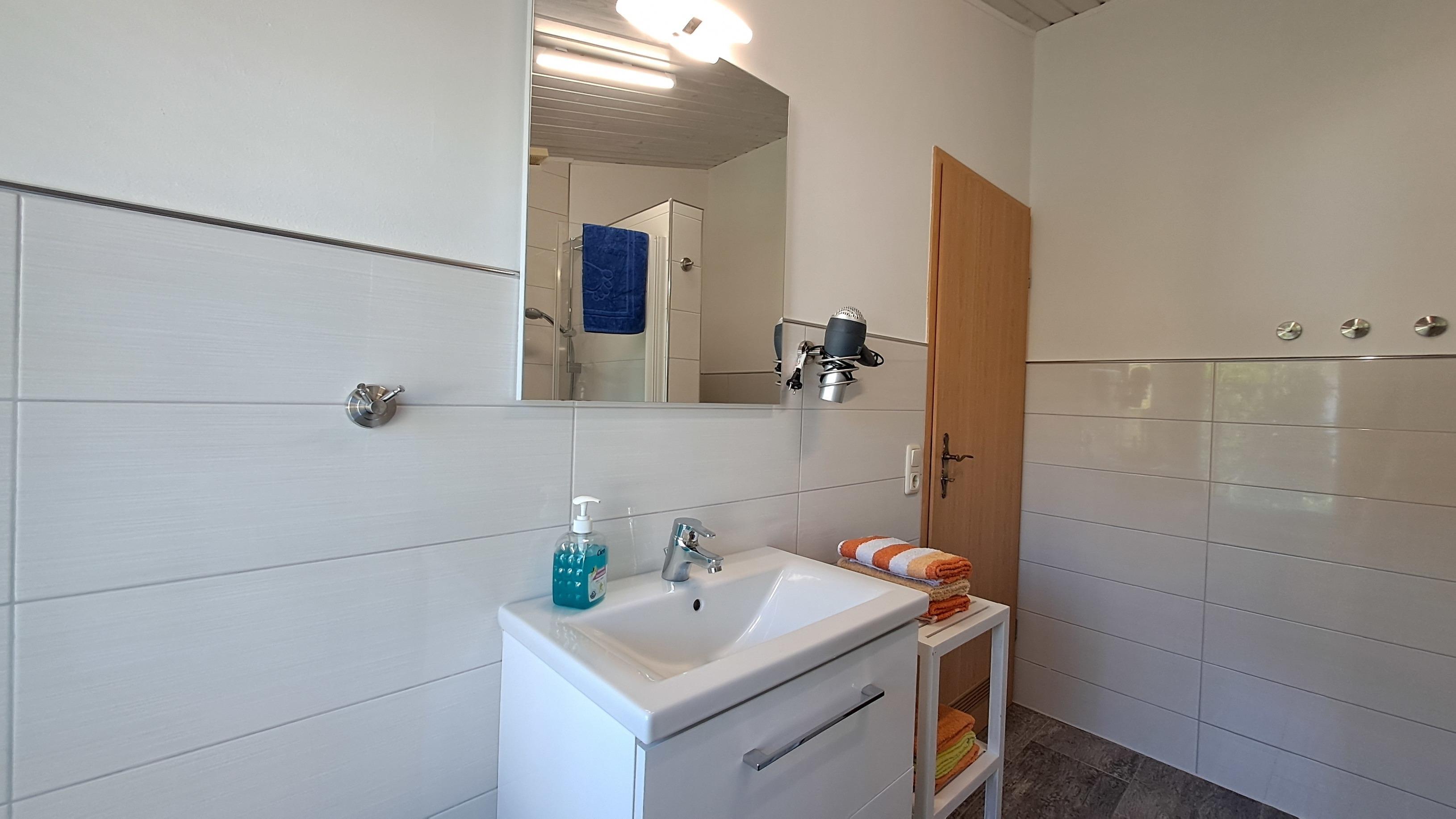 - Ebenerdige Dusche sowie Waschbecken, WC, Spiegel, Haartrockner und 2 Regalen