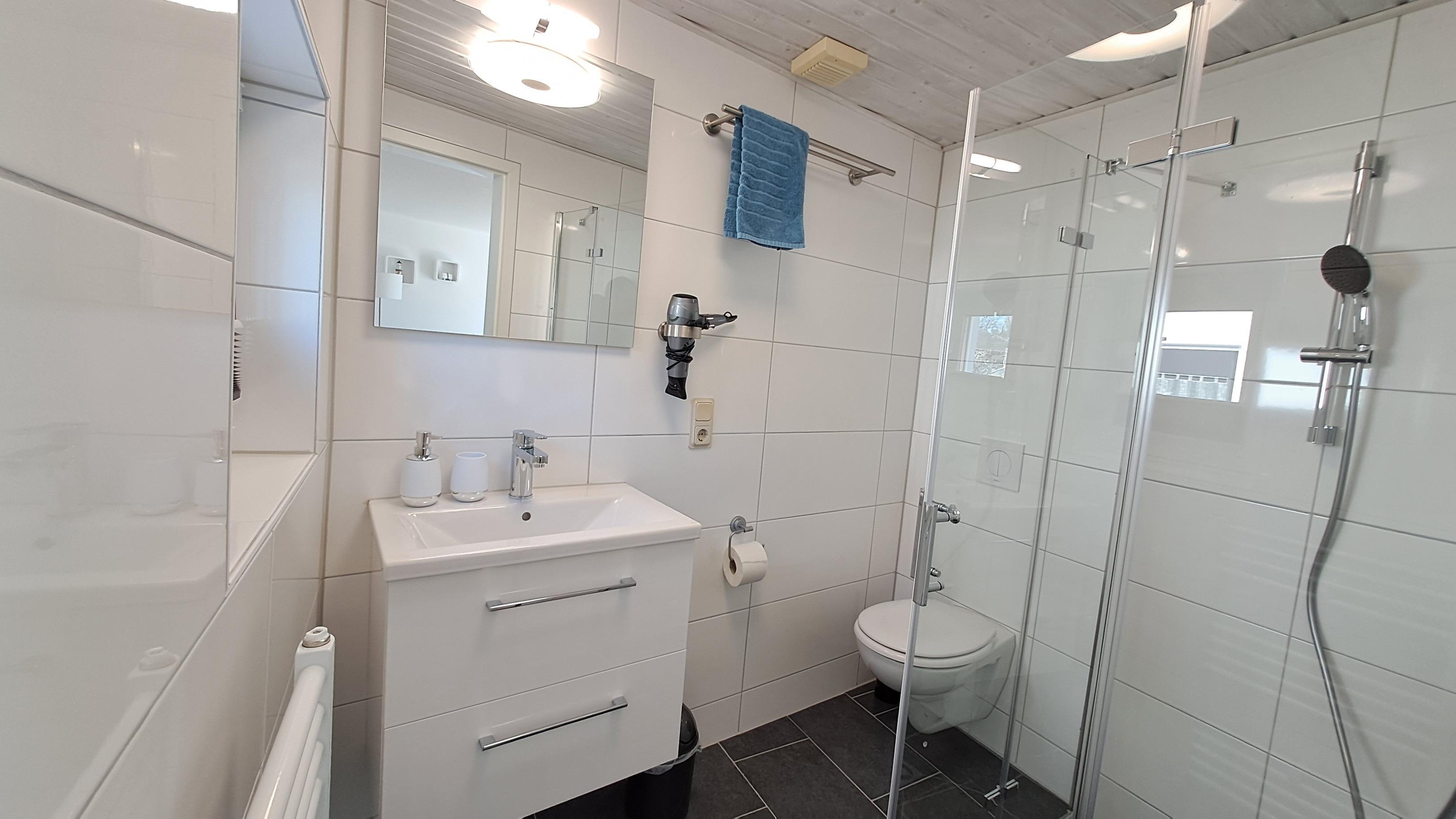 - mit Fenster, ebenerdiger Dusche, Waschbecken, Unterschrank, Spiegel und WC
