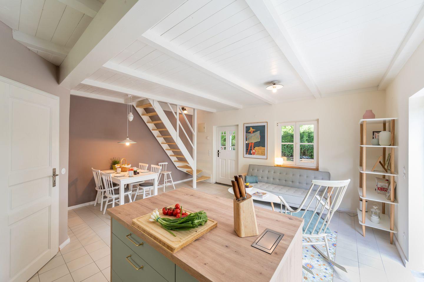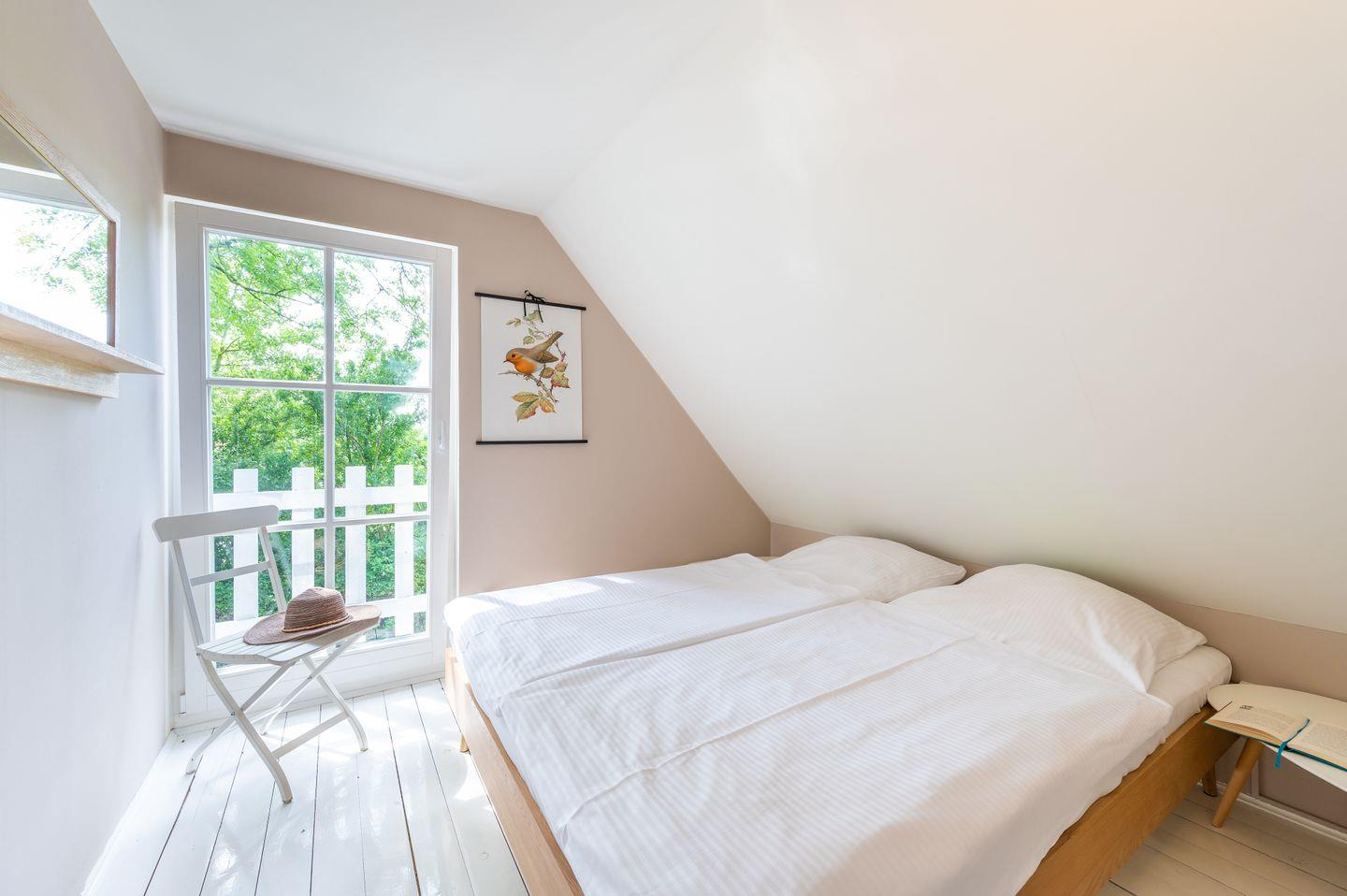 Zwei Schlafzimmer mit Doppelbetten bieten erholsame Ruhe nach Strand, Radtour oder Inselausflug. Für ein entspanntes Ankommen steht ein Parkplatz direkt am Haus bereit. Das Haus liegt auf einem ca. 1.600 m² großen Naturgrundstück mit altem Baumbestand – Platz zum Durchatmen und für kleine Entdecker, fernab vom Alltagslärm.
