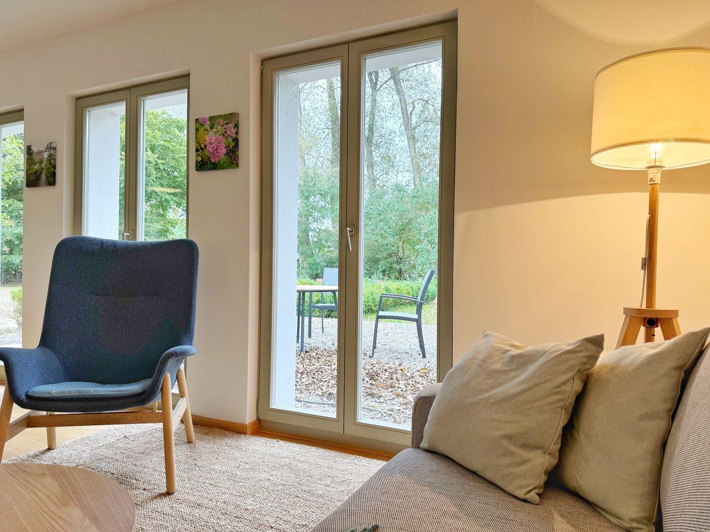 Beide Wohnungen wurden mit Naturmaterialien saniert: Zellulose - und Hanfdämmung, Lehmputz an den Innenwänden und Holzfussböden. Die Räume sowie die Aussenanlagen sind sehr grosszügig gestaltet, so daß auch im Winter Indoorulaubsfeeling garantiert ist