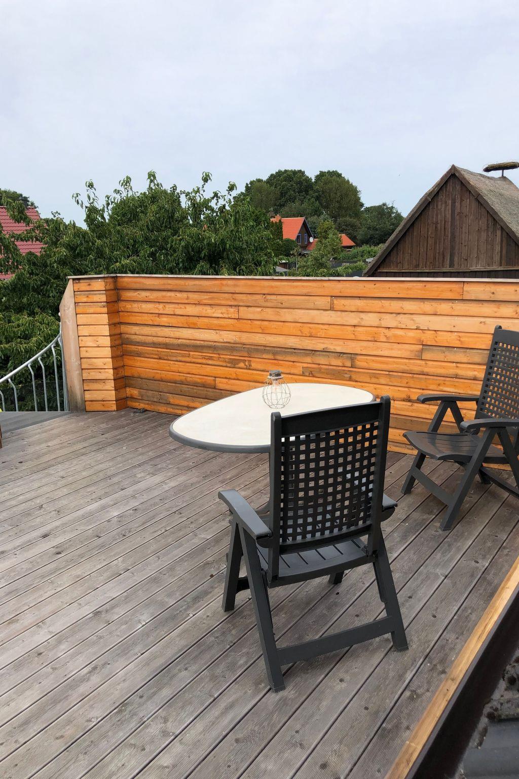 Dieses wunder schöne neue „ Apartment am Stettiner Haff „ befindet sich in der obersten Etage und ist nur über eine Wendetreppe zu erreichen für 2 bis max. 3 Personen. Genießen Sie einen erholsamen Urlaub in einem modern, rustikal eingerichteten Ferienhausapartment , die einen komfortablen Urlaub für 2Personen bedient (alle Punkte einer 3 Sterne Ferienwohnung werden erfüllt). Die Wohnfläche im oberen Apartment unterteilt sich in einem Wohnschlafzimmer mit jeweils einem großzügigen Doppelbett (140 cm x 200 cm), das von zwei beidseitigen Nachttischen mit Leselampen umgeben ist. Vor dem Bett steht ein Sideboard das ausreichend Verstauungsmöglichkeiten für Ihr Reisegepäck bietet. Ein Kinderstuhl steht für die ganz kleinen Gäste kostenlos bereit. Herzstück der Wohnung ist der 36 m² umfassende Wohn- und Schlafraum, mit einer 40qm großen Dachterrasse zum raus gehen und Sonne tanken, mit integrierter Küchenzeile, einen Essbereichen und einer bequemen ausziehbaren Schlafcouch. Entspannen Sie nach einem Tagesausflug während der Flachbildfernseher mit Sat. -TV und TV-USB-Anschluss für Unterhaltung sorgt. Die offene Küche ermöglicht Ihnen eine umfangreiche Selbstversorgung anhand eines Vierzonenkochfelds, eines Backofens, eines Kühlschranks mit Gefrierfach, sowie zahlreicher Kleinelektrogeräte, von einem Toaster, Wasserkocher bis zur Kaffeemaschine. Die Wendetreppe führt zur große Dachterrasse ca. 40qm, mit Hängestuhl, Whirlpool der auf Anfrage auch genutzt werden kann ( kostenpflichtig ) sowie Lounge Möbel zum sitzen. Wir wünschen Ihnen einen angenehmen Aufenthalt.