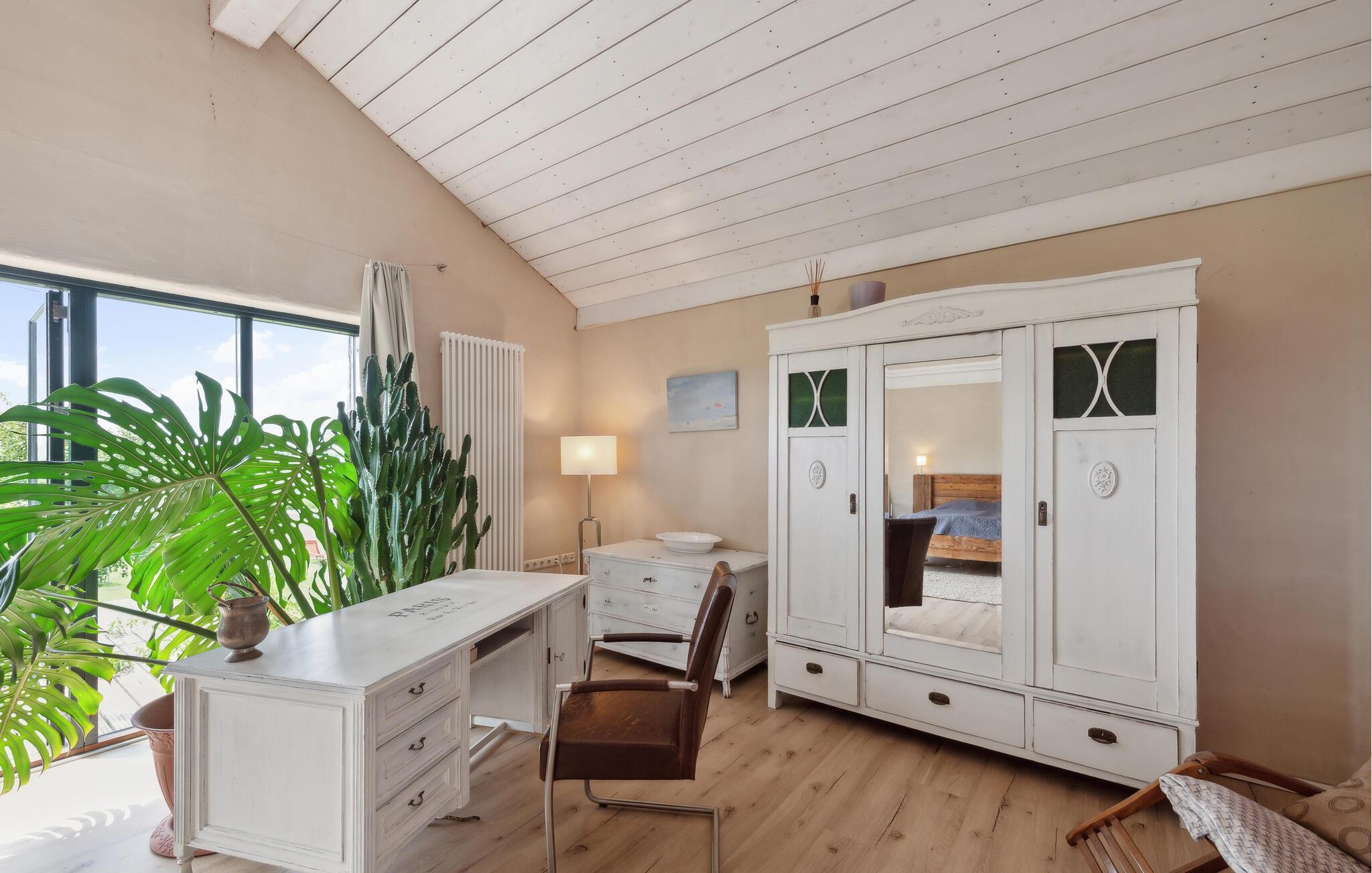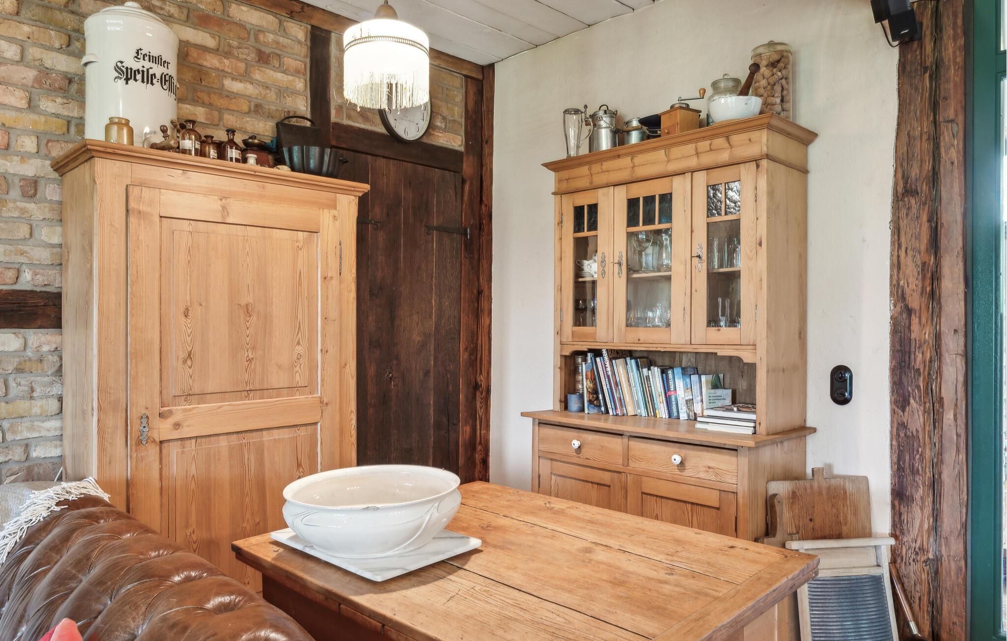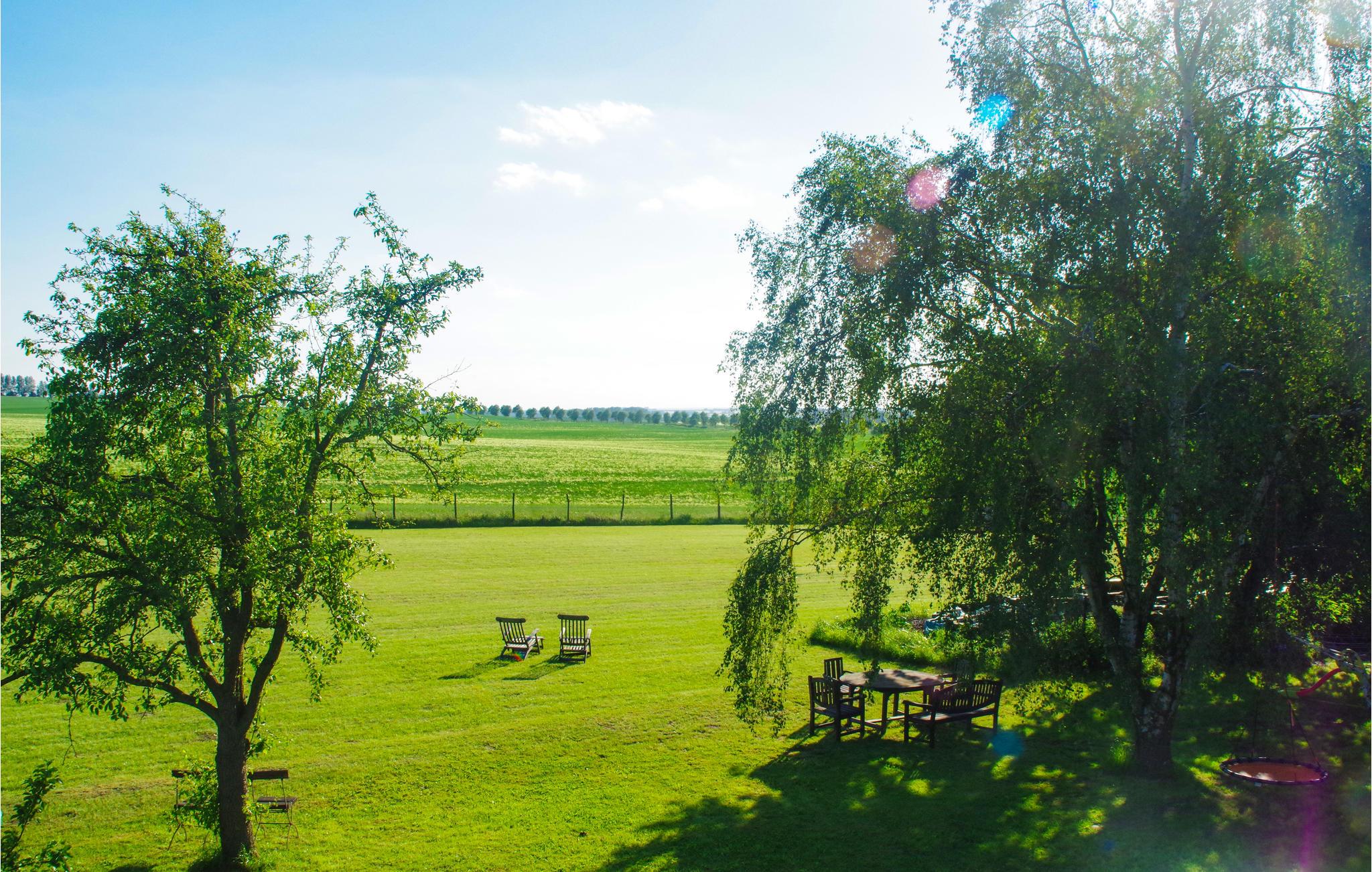 Die Kochscheune ist ideal für größere Familienfeiern und voll ausgestattet. Diese ist voll beheizbar und auch für den Winter sehr gut geeignet. Neben allen Küchengeräten finden Sie einen amerikanischen Kühlschrank mit Tiefkühler, verstellbare Dunstabzugshaube, Geschirr für 20 Personen, Kamin, Flachbildfernseher, Stereoanlage und Blue-Ray Player. Das großzügige Schlafzimmer im Obergeschoss verfügt über ein Doppelbett aus Altholz, liebevoll vom Vermieter gebaut. Vom Balkon genießen Sie eine traumhafte Aussicht auf das Salzhaff. Der Garten lädt zum relaxen und spielen ein. Liegestühle oder Strandkorb können gern genutzt werden. Eine Volleyballanlage steht zur kostenlosen Nutzung bereit.