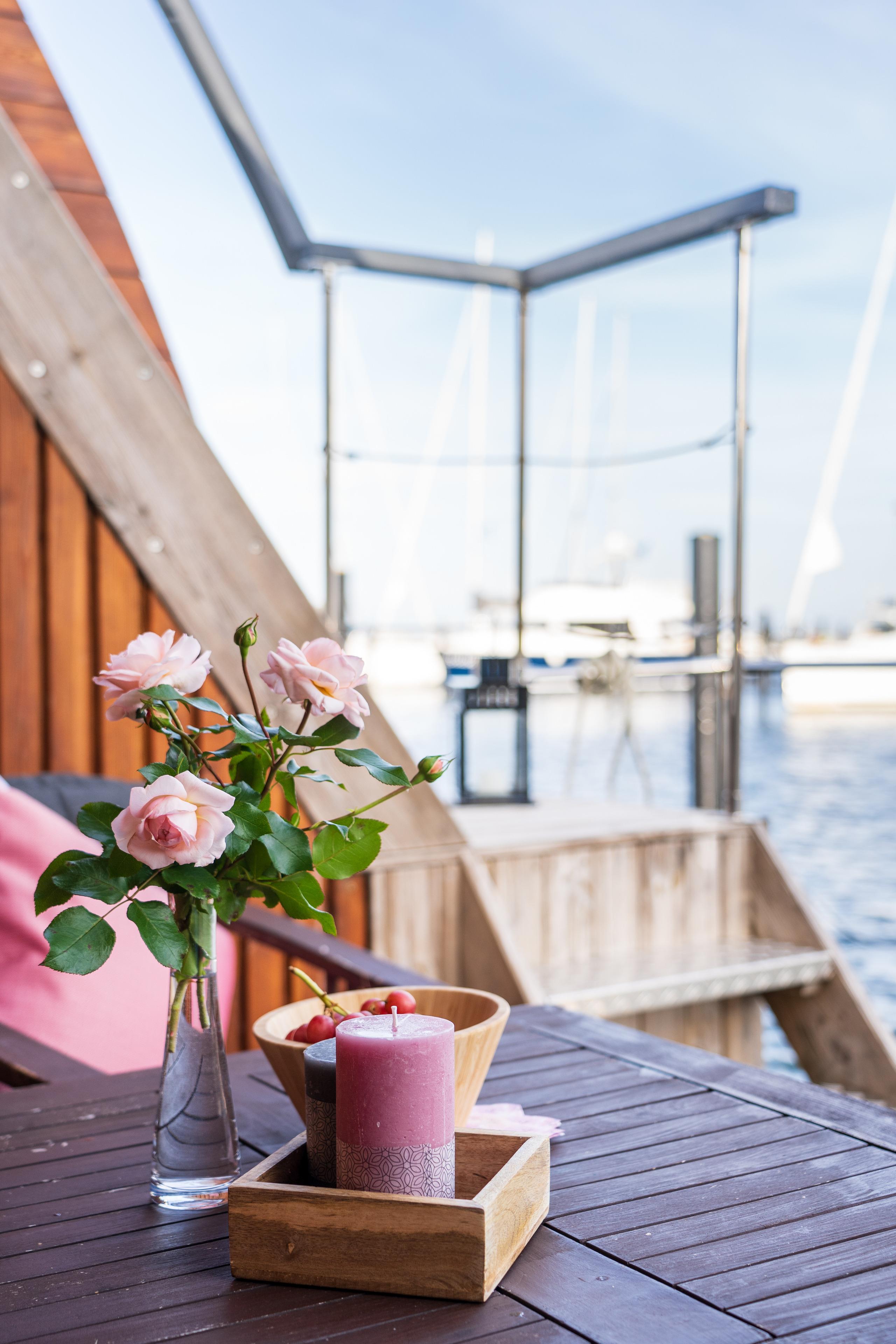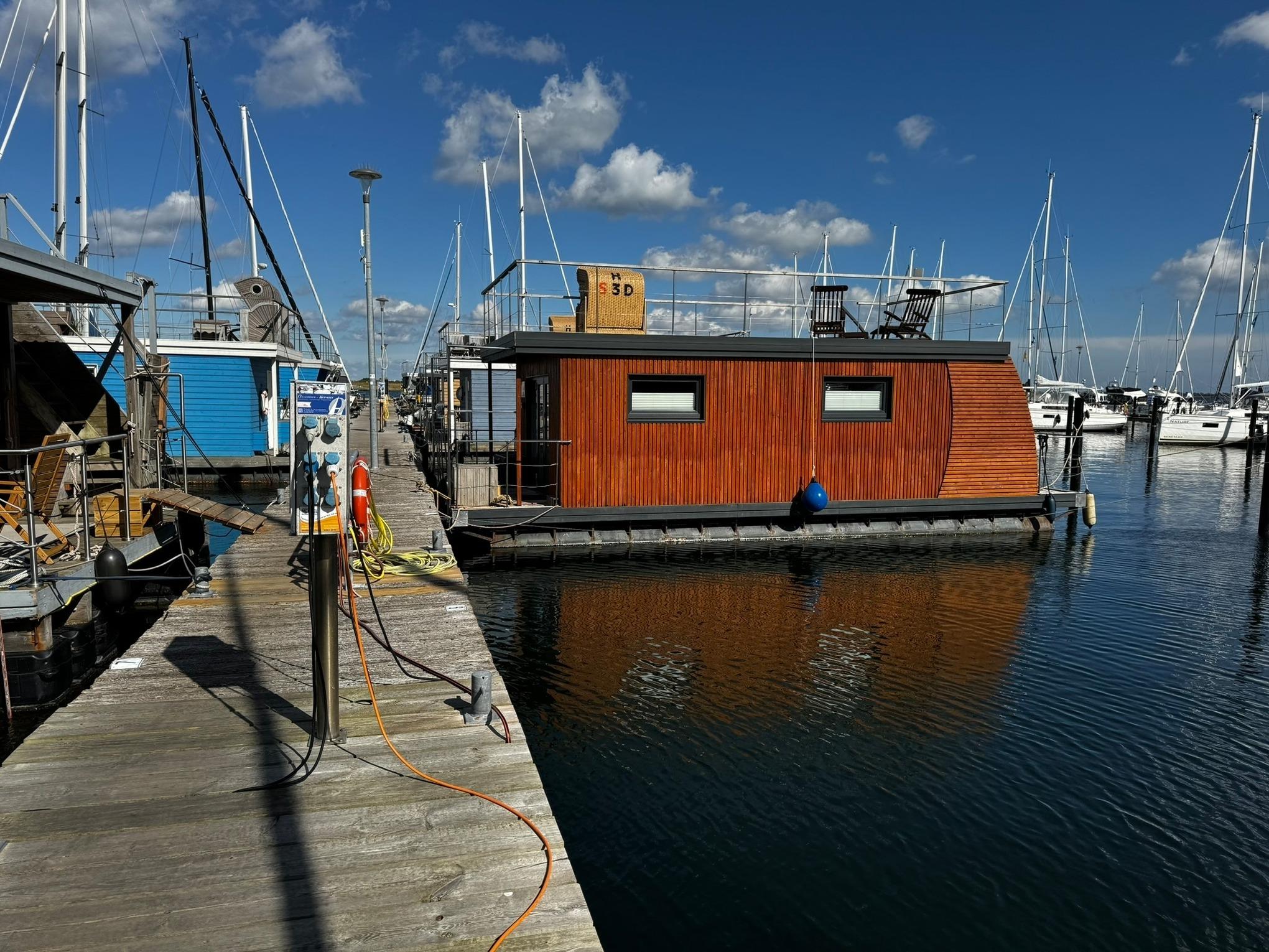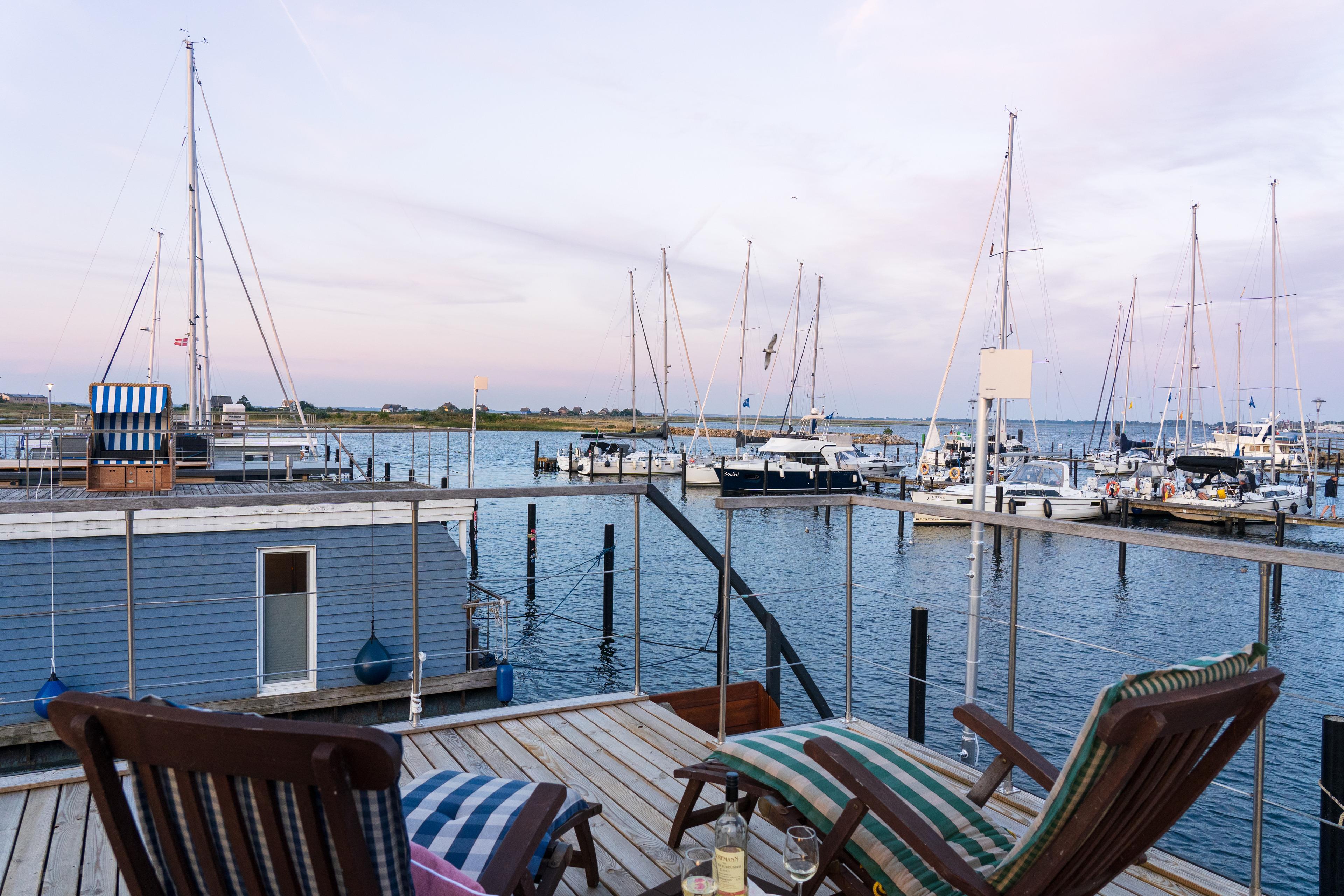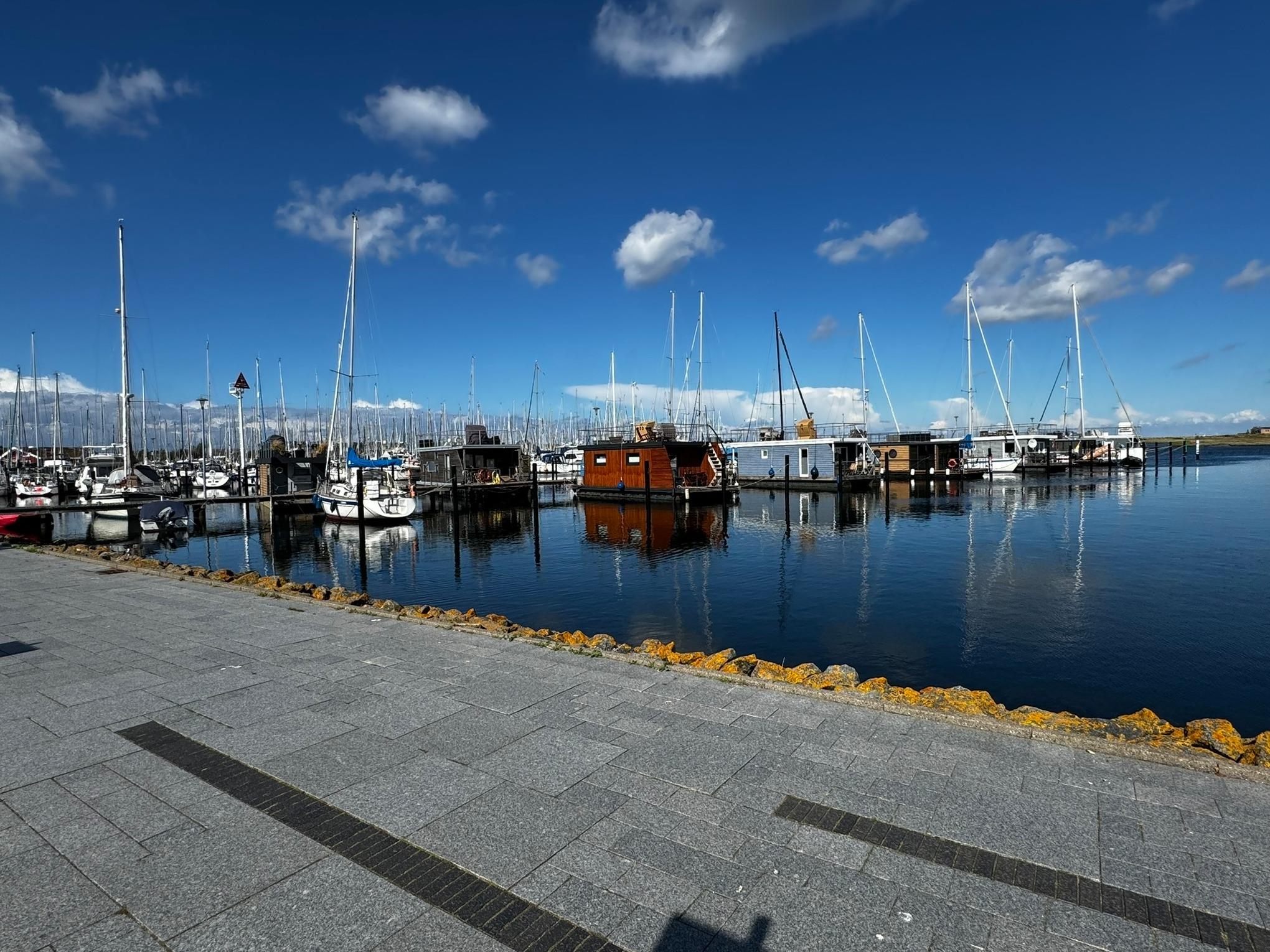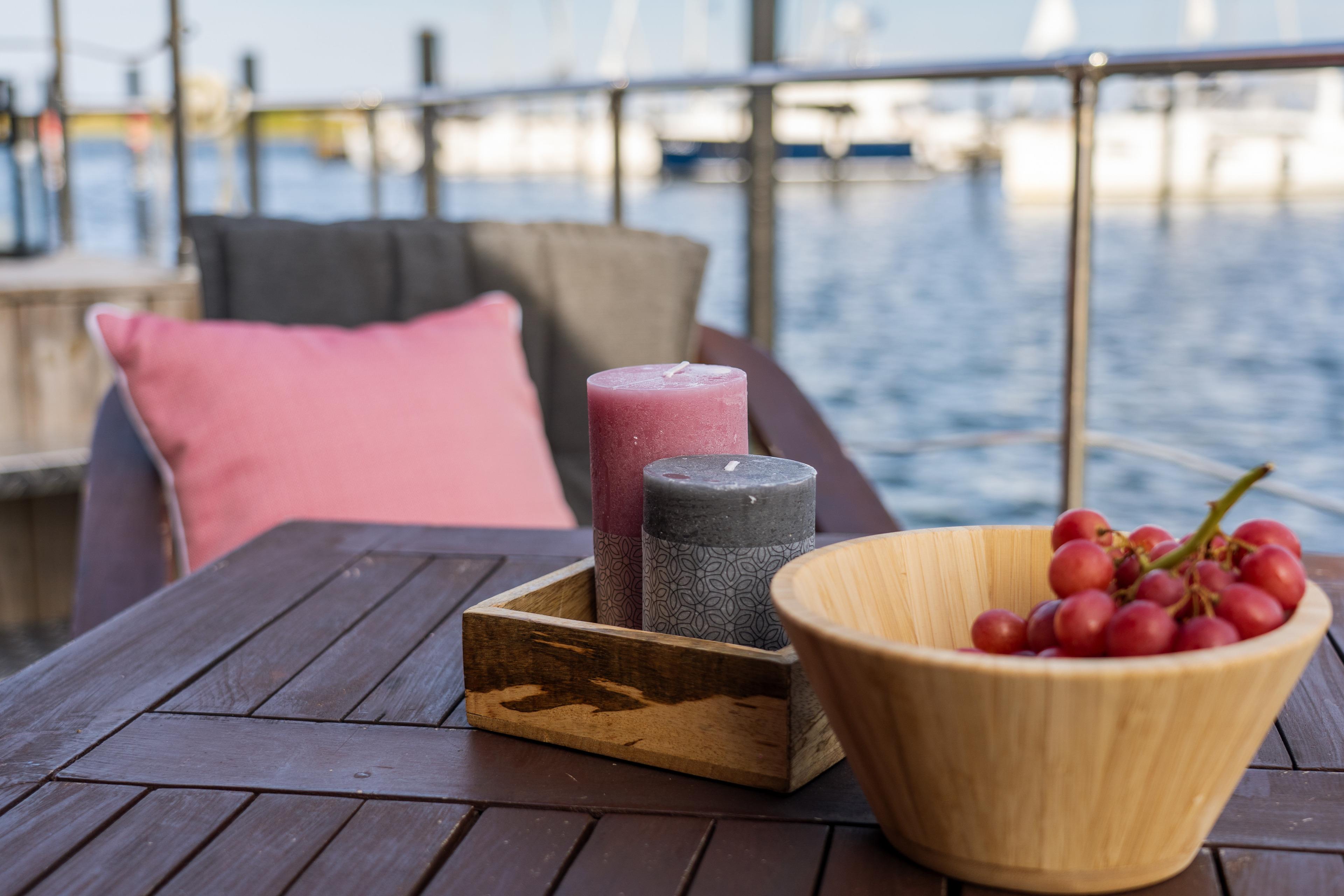 Charmantes Hausboot mit Meerblick im Yachthafen Heiligenhafen, ideal für einen erholsamen Urlaub direkt am Wasser.