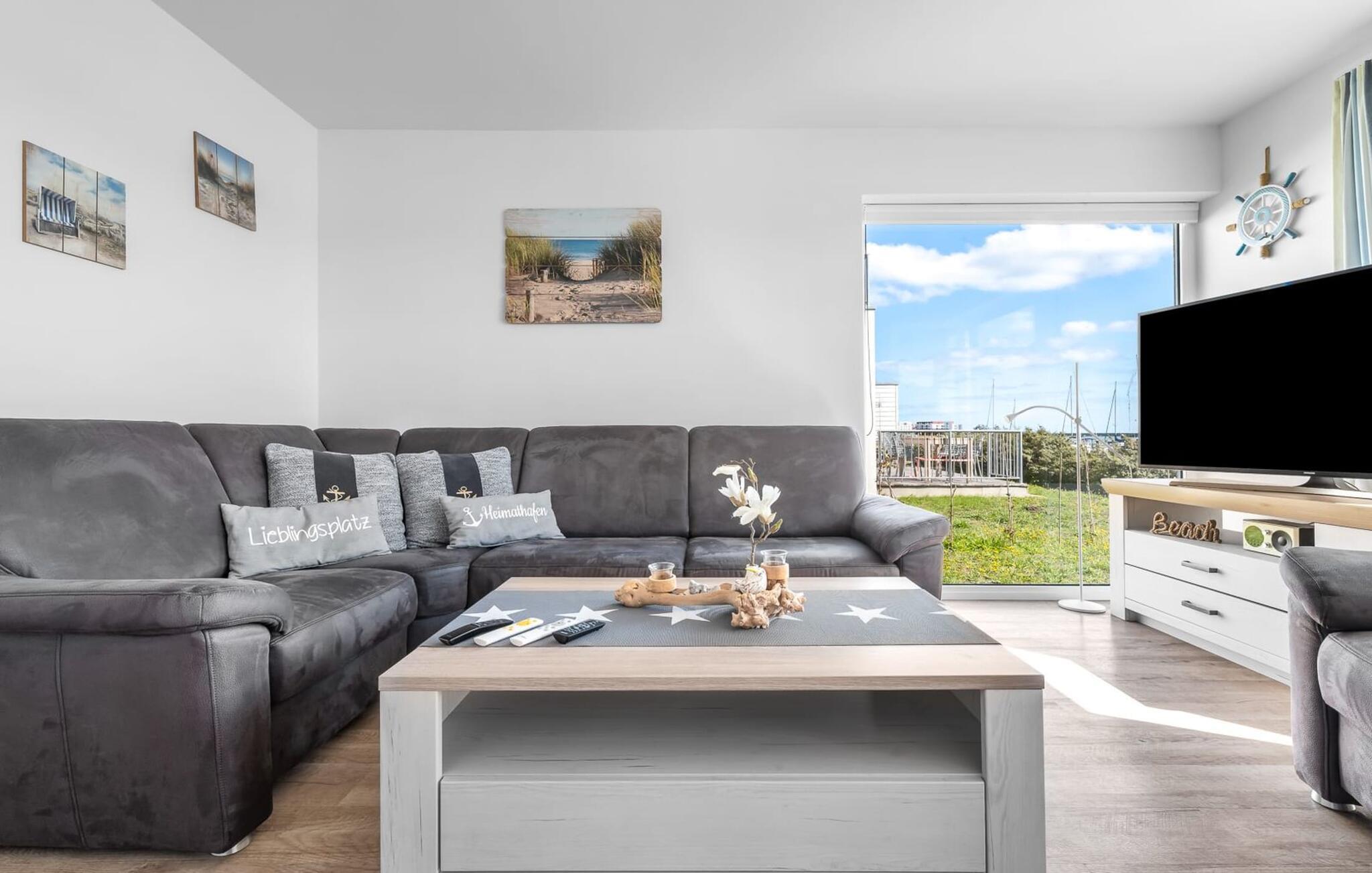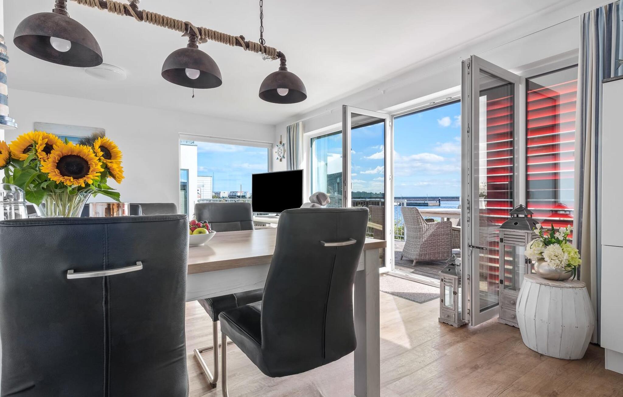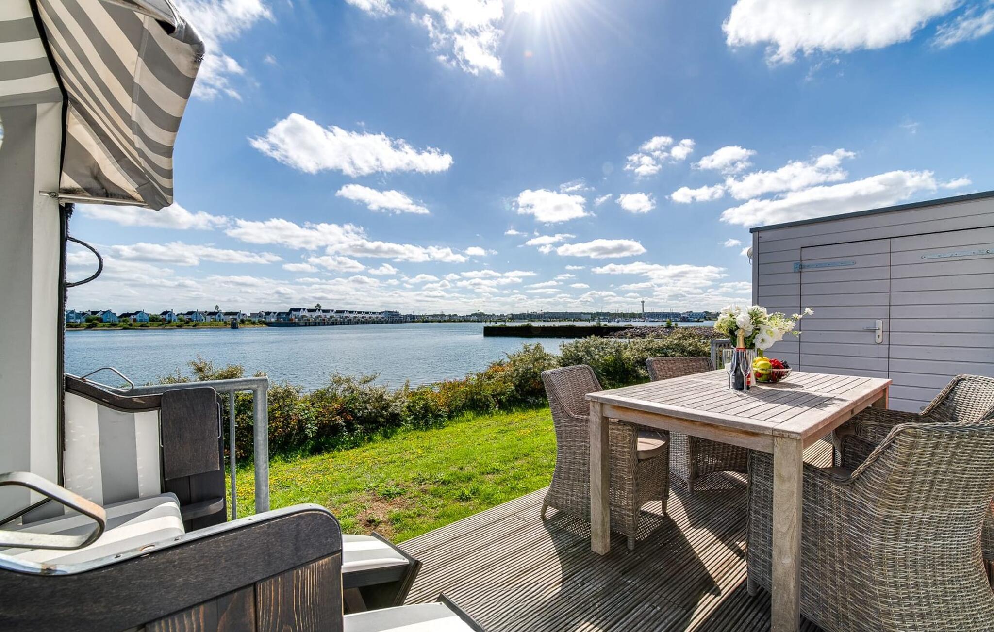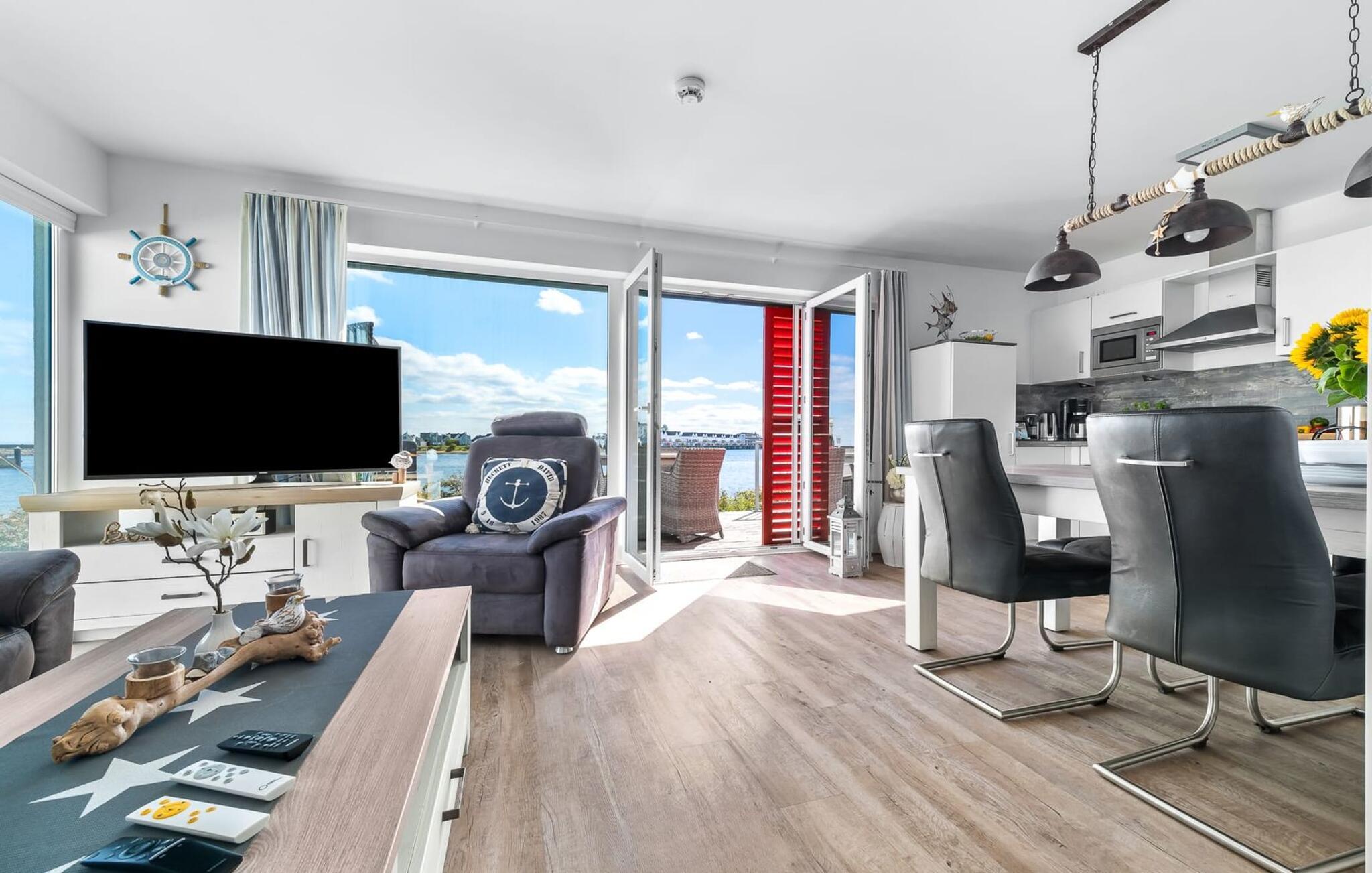 Traumhafte Aussichten eröffnen sich aus dem Wohnbereich durch bodentiefe Fensterfronten über die angrenzende Terrasse mit Blick über die Marina. Hafenkino sorgt hier für Unterhaltung während eines geselligen Grillabends oder romantischen Candle-Light-Dinners.