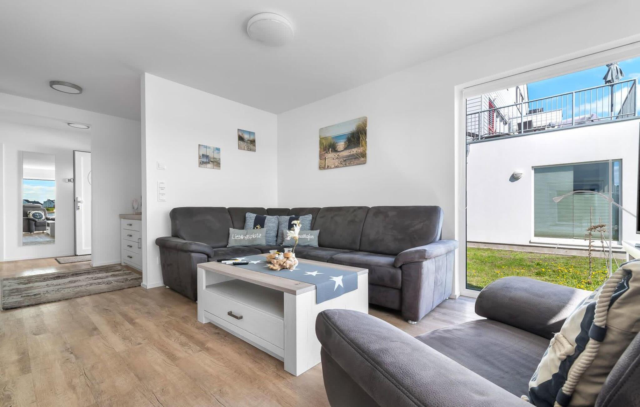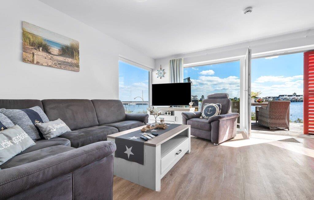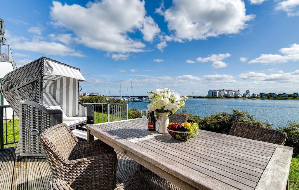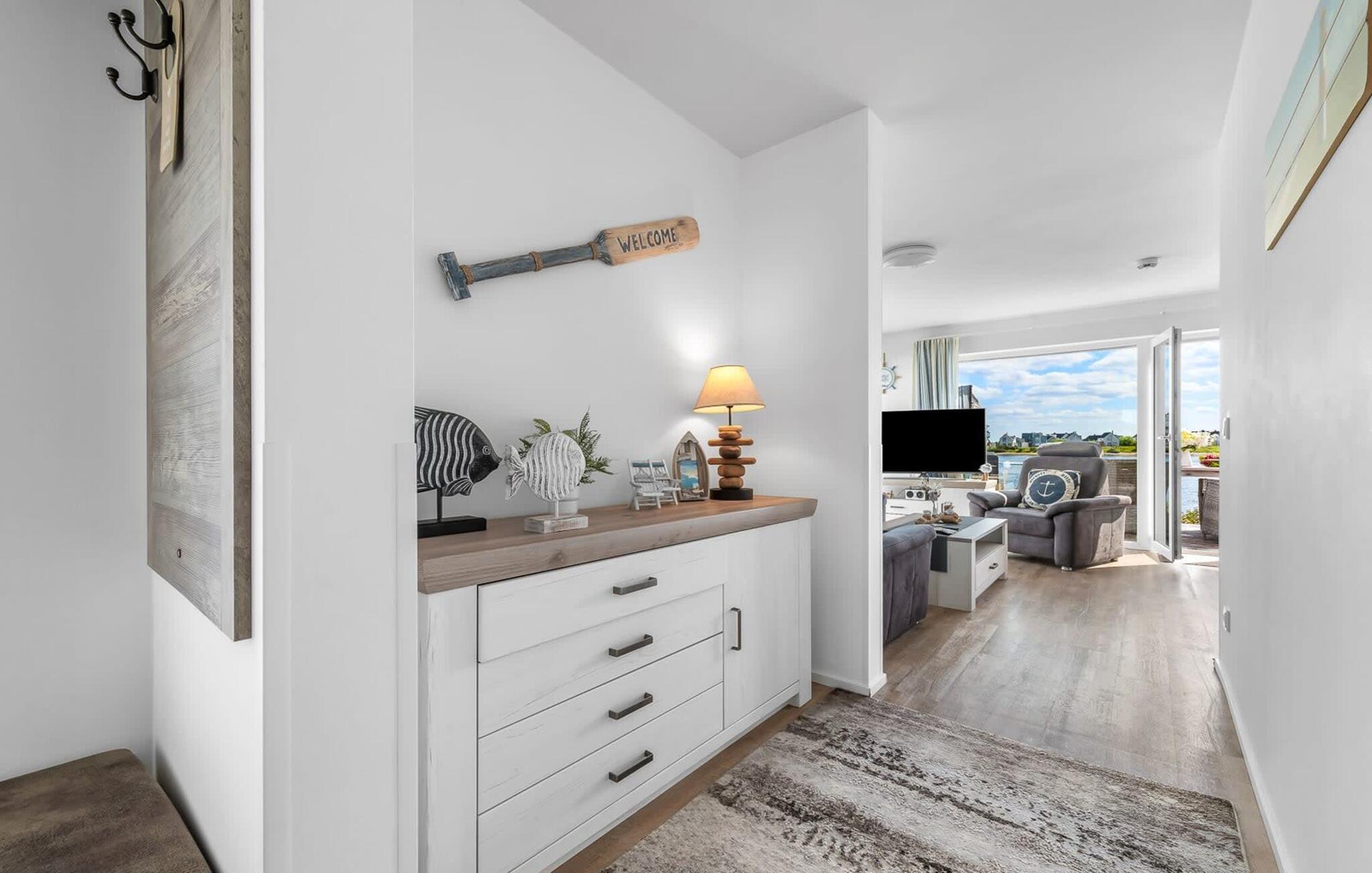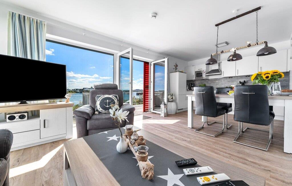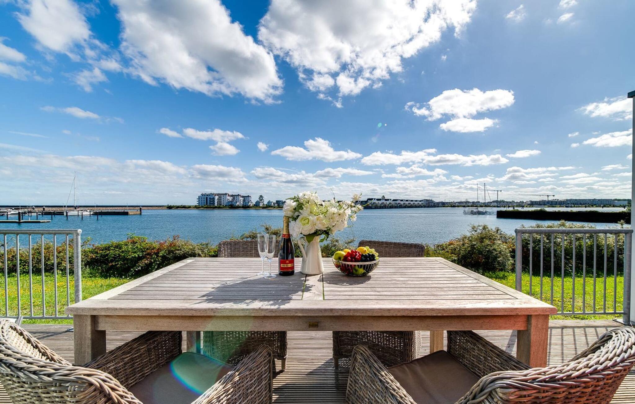 Traumhafte Aussichten eröffnen sich aus dem Wohnbereich durch bodentiefe Fensterfronten über die angrenzende Terrasse mit Blick über die Marina. Hafenkino sorgt hier für Unterhaltung während eines geselligen Grillabends oder romantischen Candle-Light-Dinners.